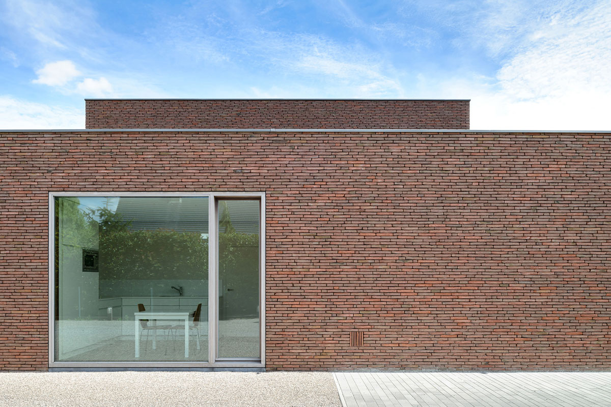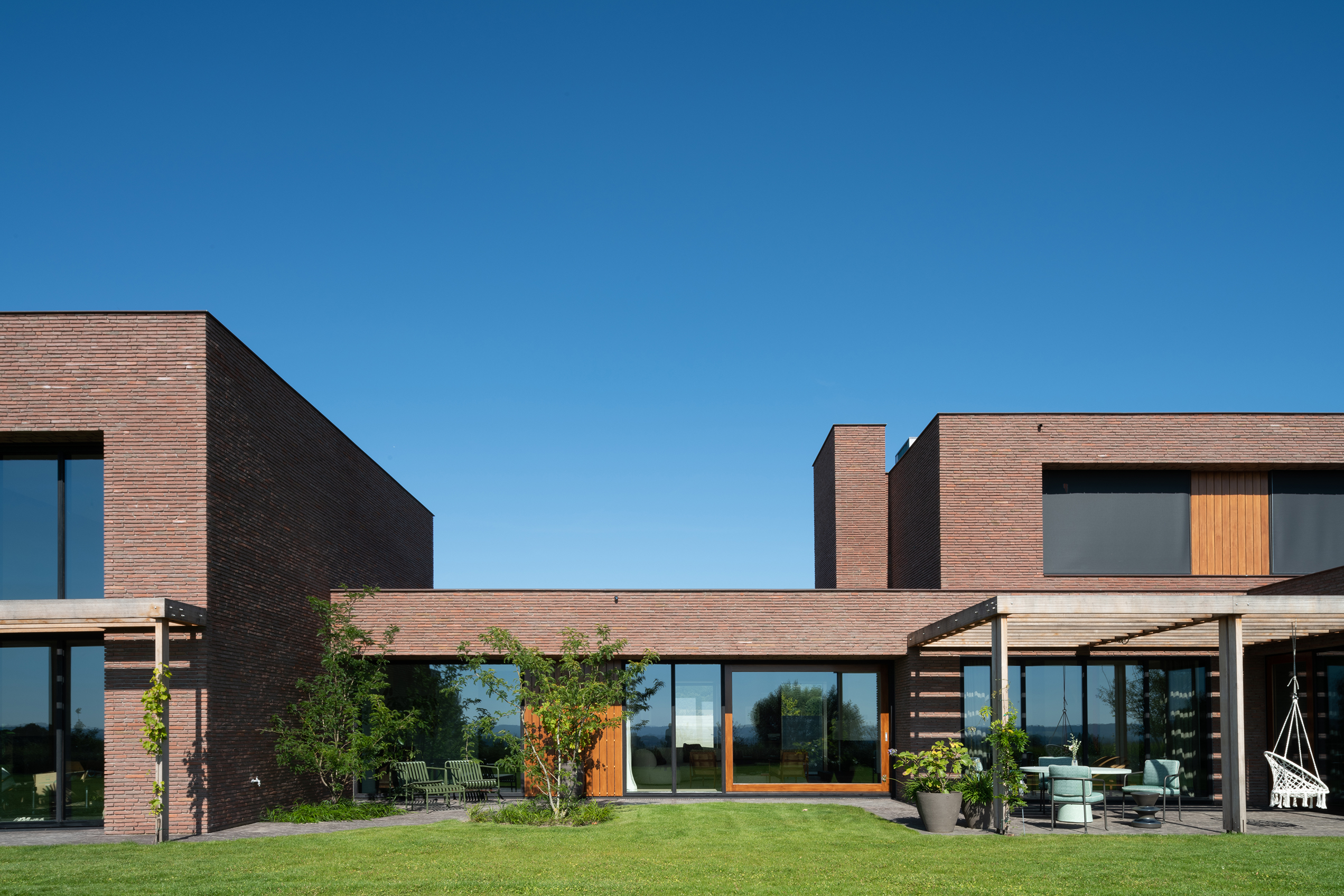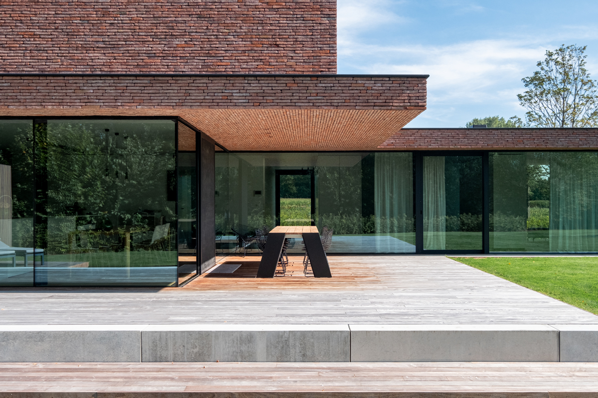 Een zonevreemde ligging brengt altijd uitdagingen met zich mee. Hoe vul je die 1000 kubieke meter in zonder het gevoel te hebben toegevingen te moeten doen? Bijkomende uitdaging met dit perceel was de juiste architectuur te vinden die zowel inspeelt op de bomenrijke tuin achteraan als vooraan op de uitlopers van de natuurpracht van de Damvallei, een laagveen gevormd door enkele verlande meanders van de Schelde.
