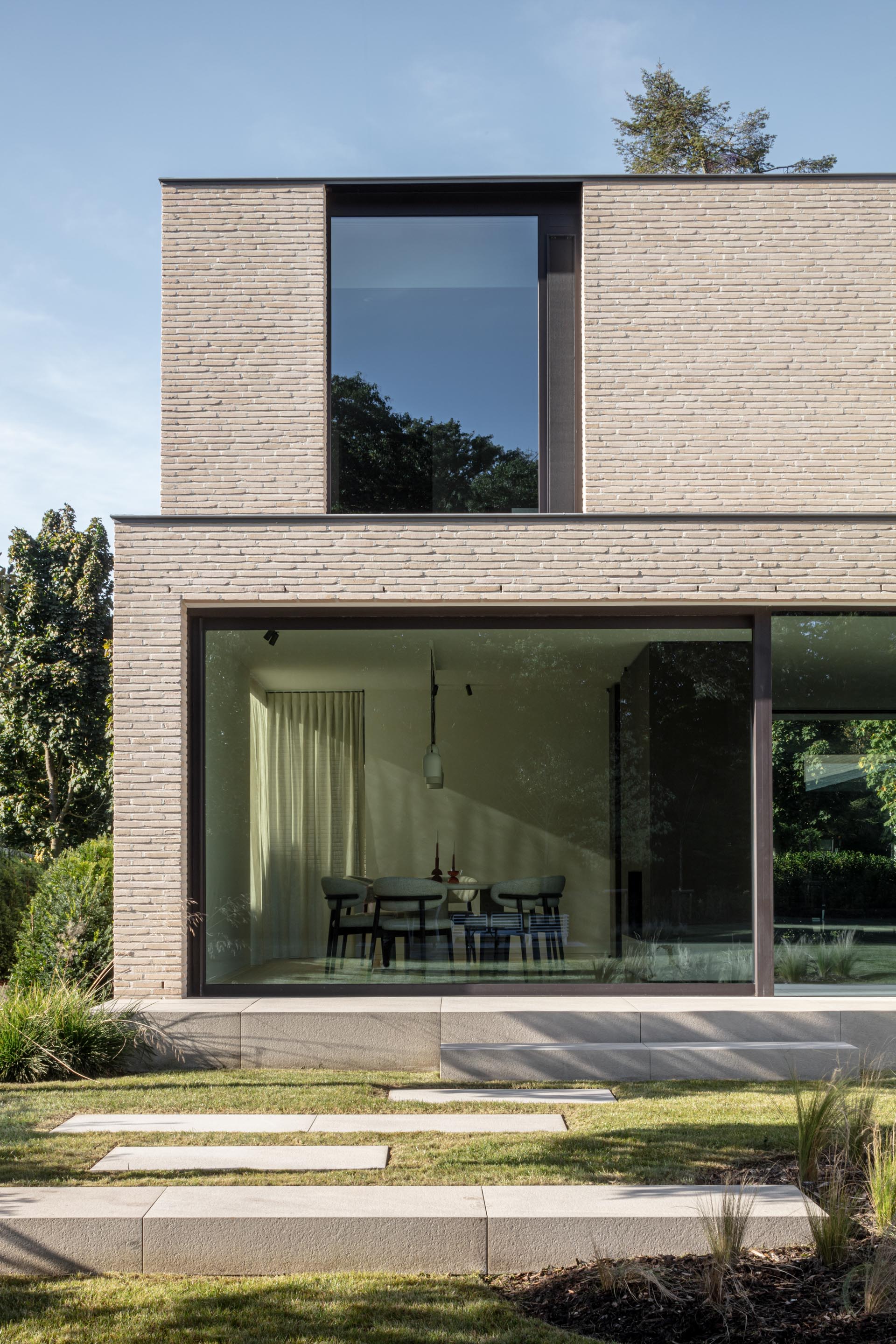 De bewoners van deze villa, gelegen op een hellend terrein, genieten zowel aan de voor- als de achterzijde van weidse vergezichten. Het enorme niveauverschil van meer dan een verdiepingshoogte tussen het laagste en het hoogste punt was meteen een uitdaging voor architect Ruben Verbeke.
