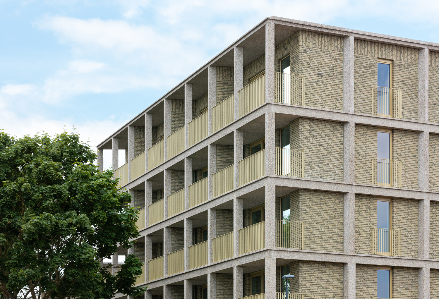 In een woonbuurt in het Vlaamse Oostende nabij de kust staat woongebouw De Boeg met negentien appartementen voor ouderen. Het ademt de Noordzee met zijn grijsgroene gemetselde stenen binnen een frame van gewassen beton.