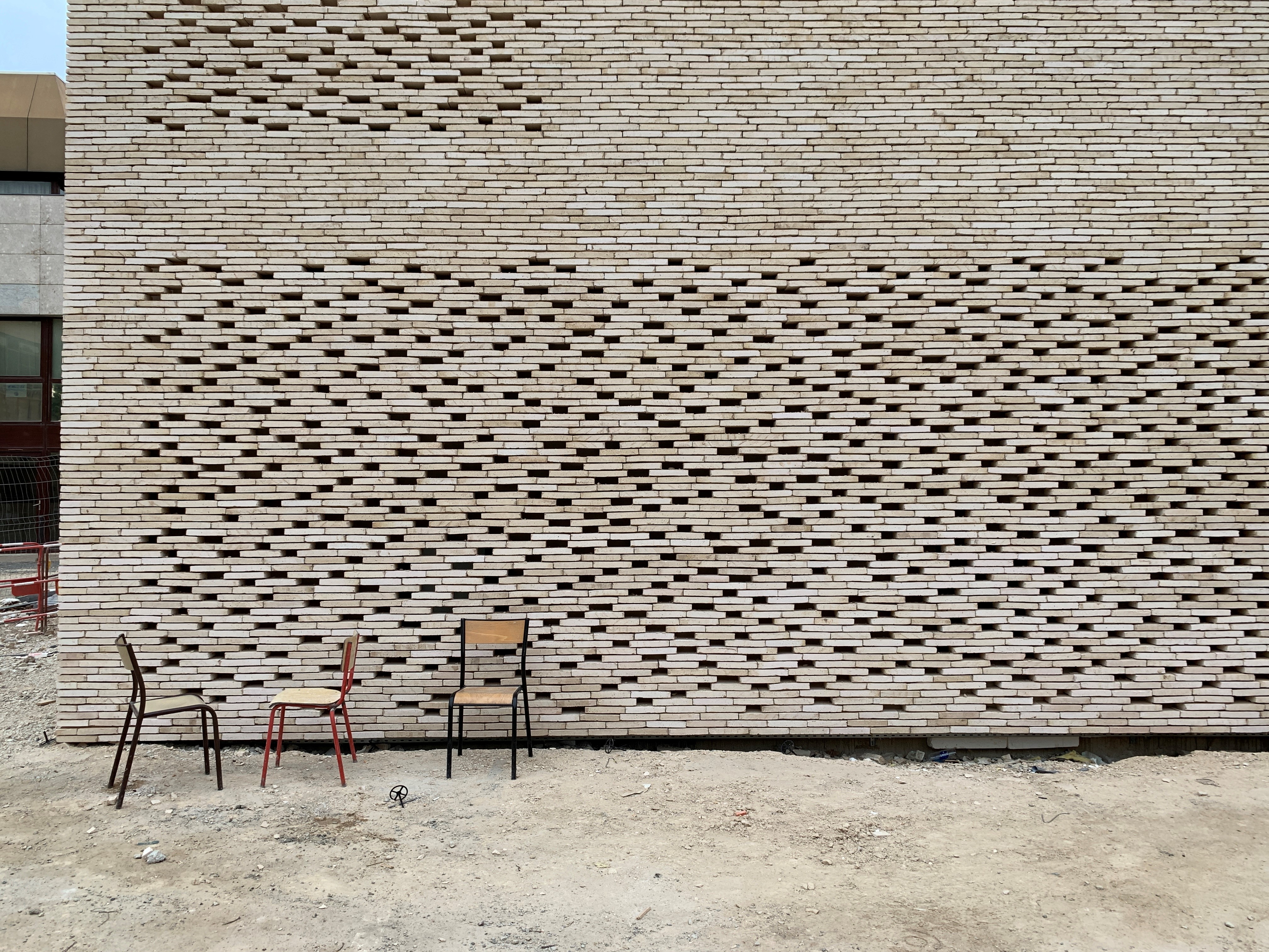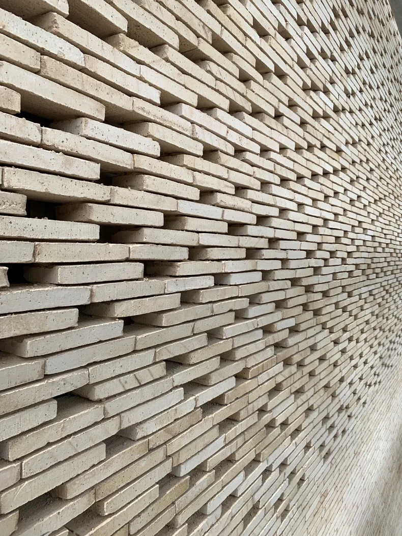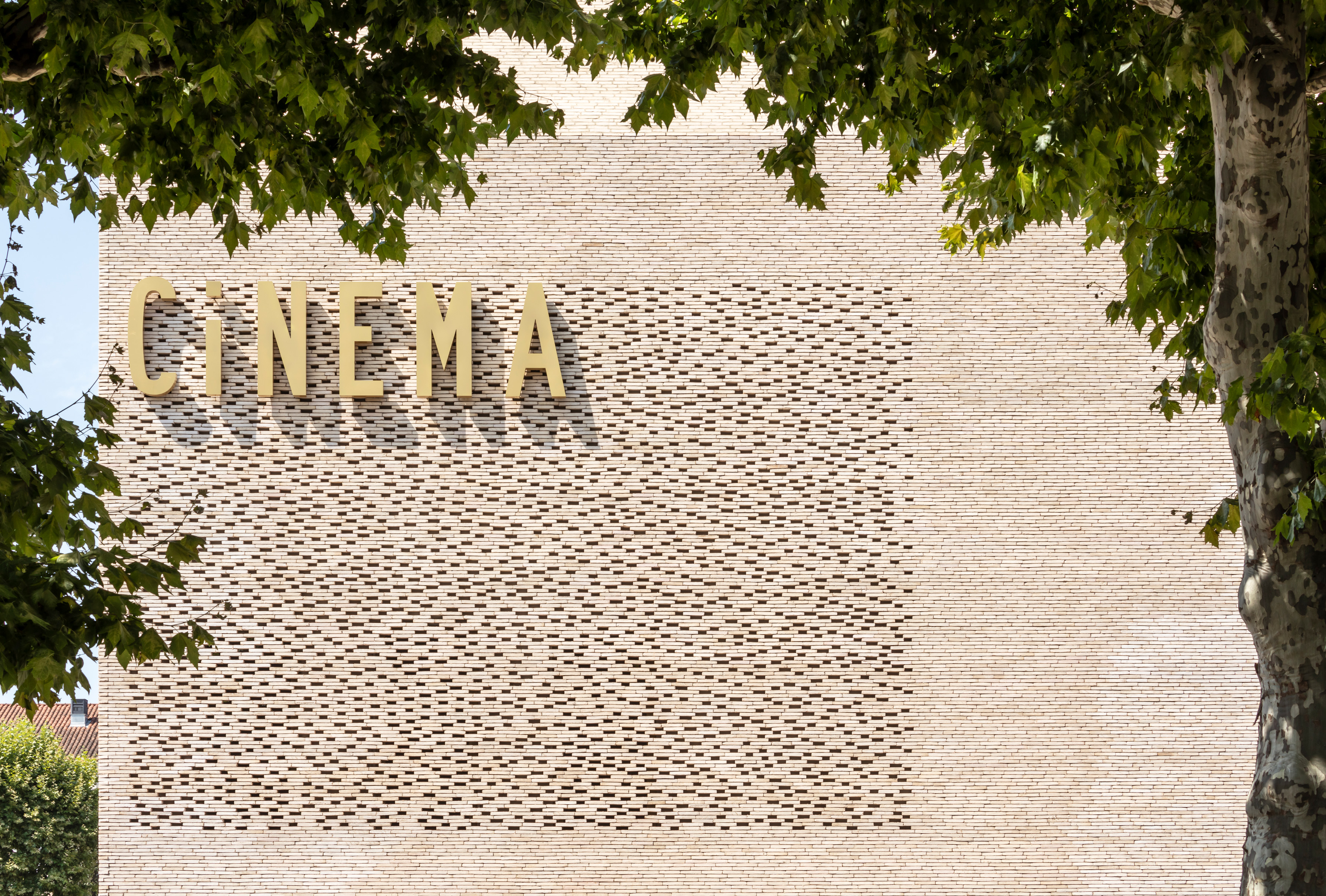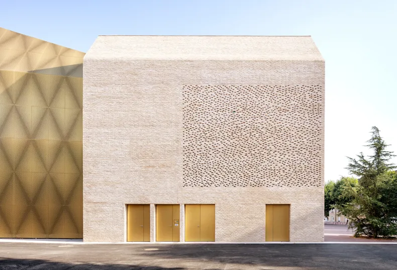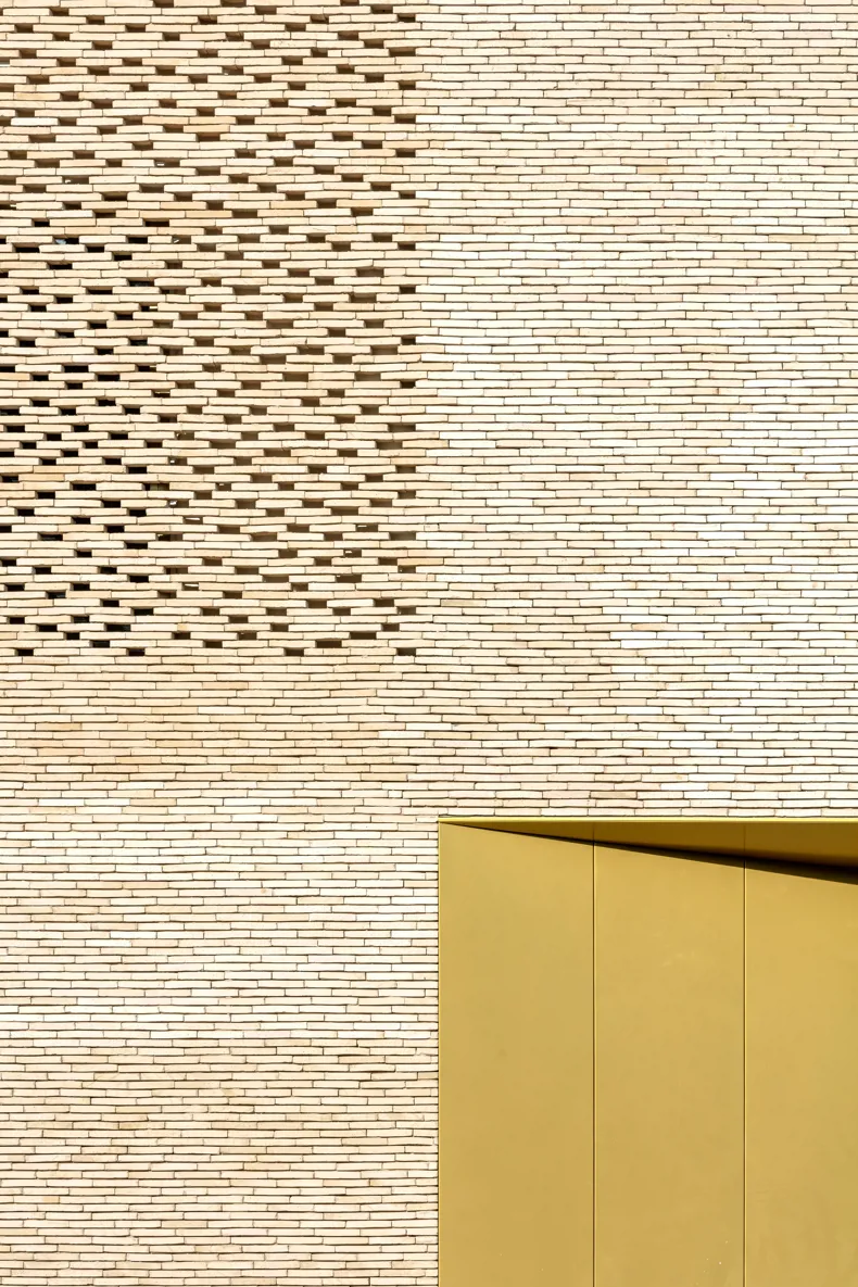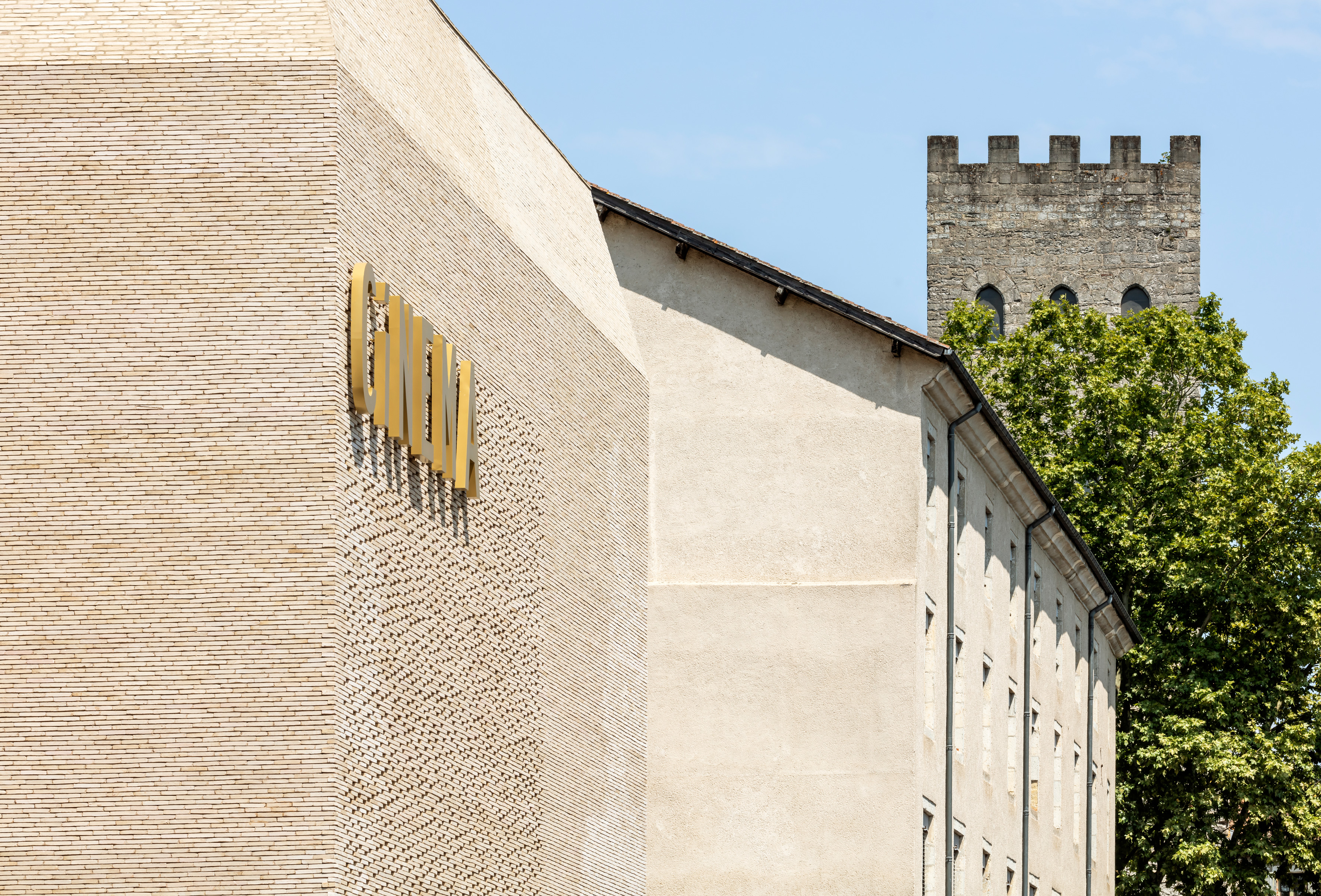Het vergulde volume is ontworpen als een uitbreiding van het baksteenvolume. Het visuele contrast met de elegante linea 9001-gevelsteen zorgt ervoor dat het tweede gebouw haast onderdanig tegen het hoofdgebouw lijkt aan te schurken. De kleurovereenkomsten tussen de lichte gevelsteen en het vergulde metaal doen denken aan de karakteristieke tinten in het historisch centrum van Cahors. De nieuwe bioscoop kreeg een esthetiek die aansluit bij de omgeving van de Lot doordat zowel de gevels als het dak bekleed zijn met baksteen. Het gebruik van een baksteen vervaardigd uit klei leek ons noodzakelijk om de beoogde authenticiteit en duurzaamheid te garanderen. Op die manier fungeert baksteen – een materiaal dat erg vaak terug te vinden is in de architectuur van Cahors (zoals de toren van paus Johannes XXII, die enkele meters verderop staat) – als een kwalitatieve knipoog naar de lokale geschiedenis en de identiteit van de stad.
