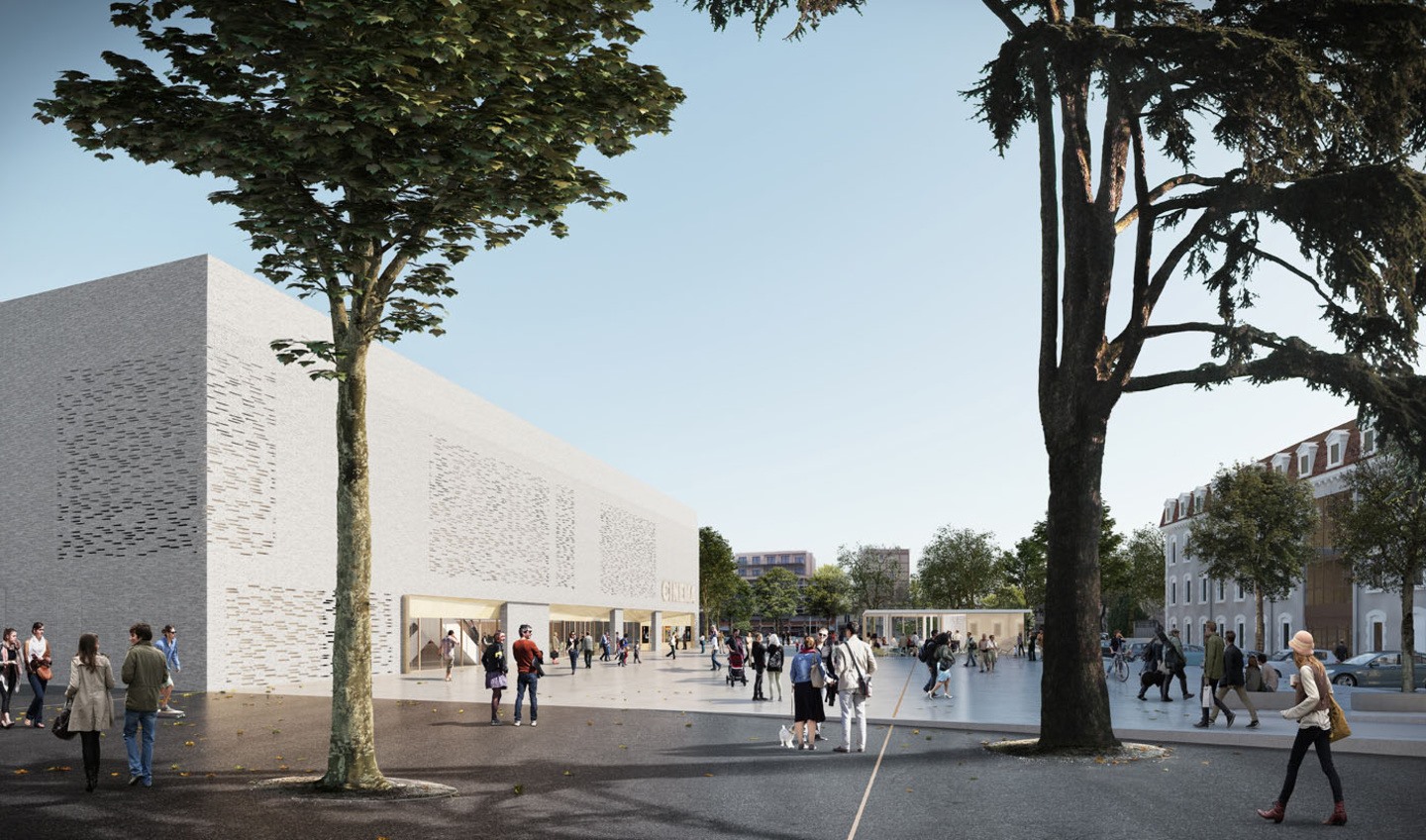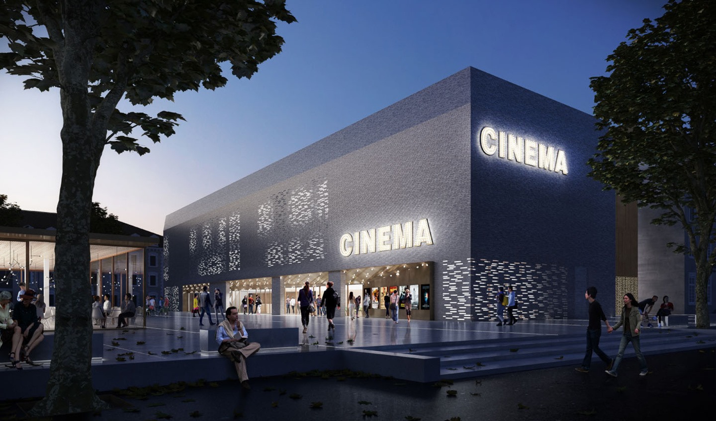 Het architecturale lijnenspel gaat uit van een strikte logica, met de twee voormalige gebouwen van de kazerne als ijkpunten. In de zoektocht naar een sterke hedendaagse esthetiek, overstijgt de architectuur van de bioscoop de intentie om de morfologie van de oude kazerne te reconstrueren. De volumes zijn methodisch gecreëerd en vervolgens visueel gestroomlijnd om de symmetrie te respecteren. Het gebouw bestaat uit twee volumes: een in de Hand-Made linea 9001-gevelsteen en het ander in geperforeerd verguld metaal, die elk een specifieke rol vervullen ten opzichte van de publieke ruimte.