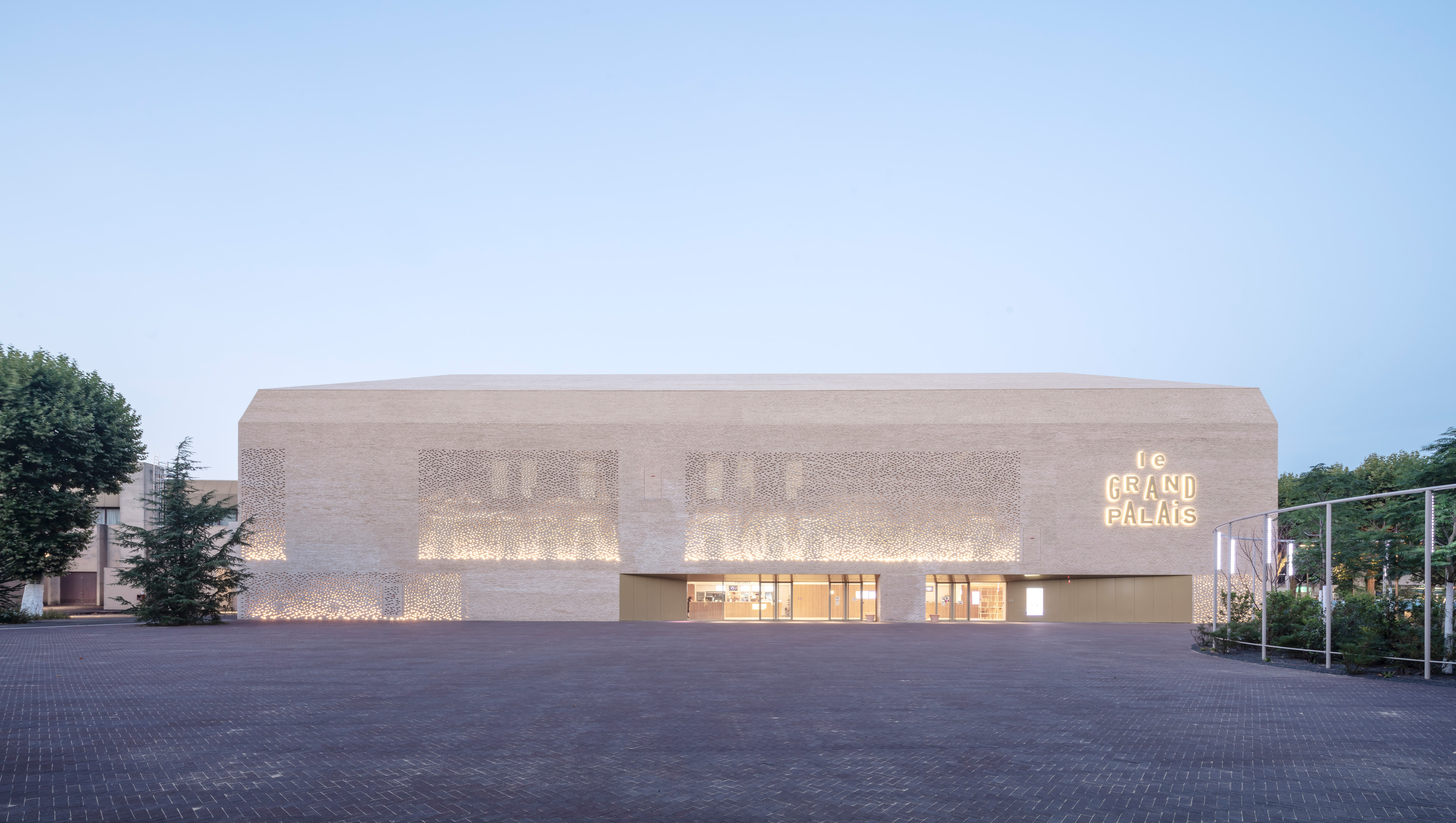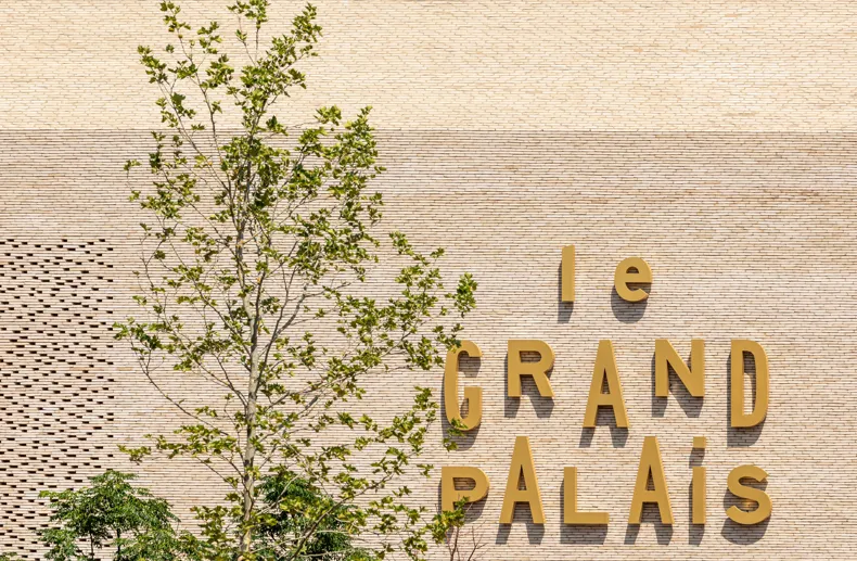 Het gabarit en de uitstraling van het volume worden versterkt door het unieke karakter van de dak- en gevelbekleding. Via de imposante façades wordt het monolithische volume doorgetrokken tot op de verdiepingsniveaus, inclusief een staaltje Mashrabiya, bestaande uit kleine perforaties die de gevel een tikkeltje minder zwaar doen ogen en die het geheel extra cachet geven. Deze afwisseling tussen open en gesloten geveldelen is gebaseerd op een functionele logica. De geperforeerde schil animeert de binnenruimtes overdag en creëert ’s nachts een intrigerend licht- en schaduwspel, met kleine fonkelingen die van buitenaf bekeken een magisch effect opleveren.