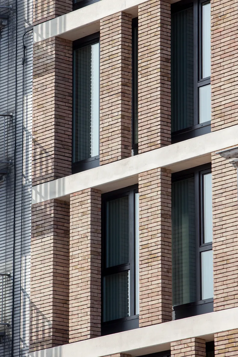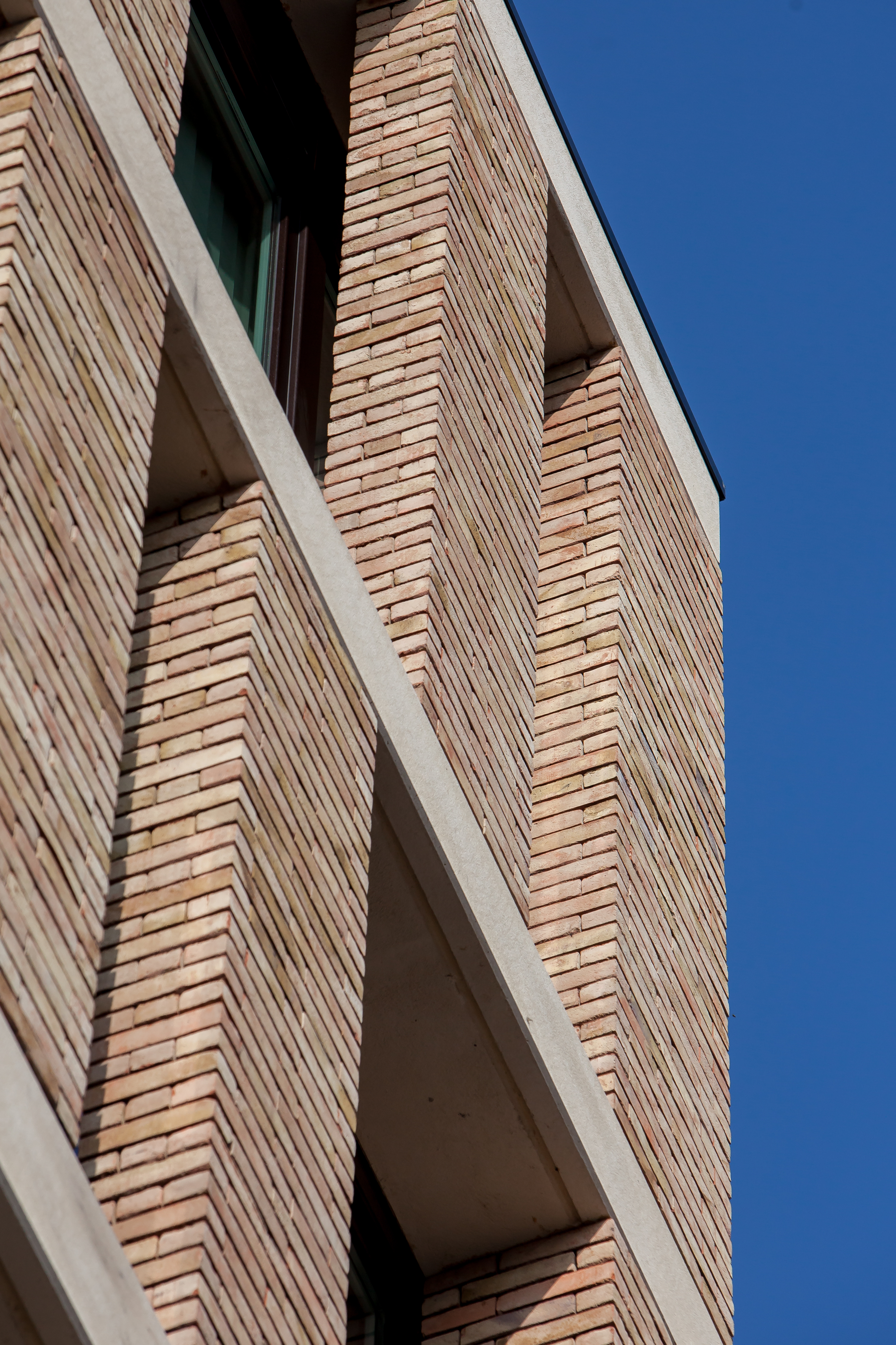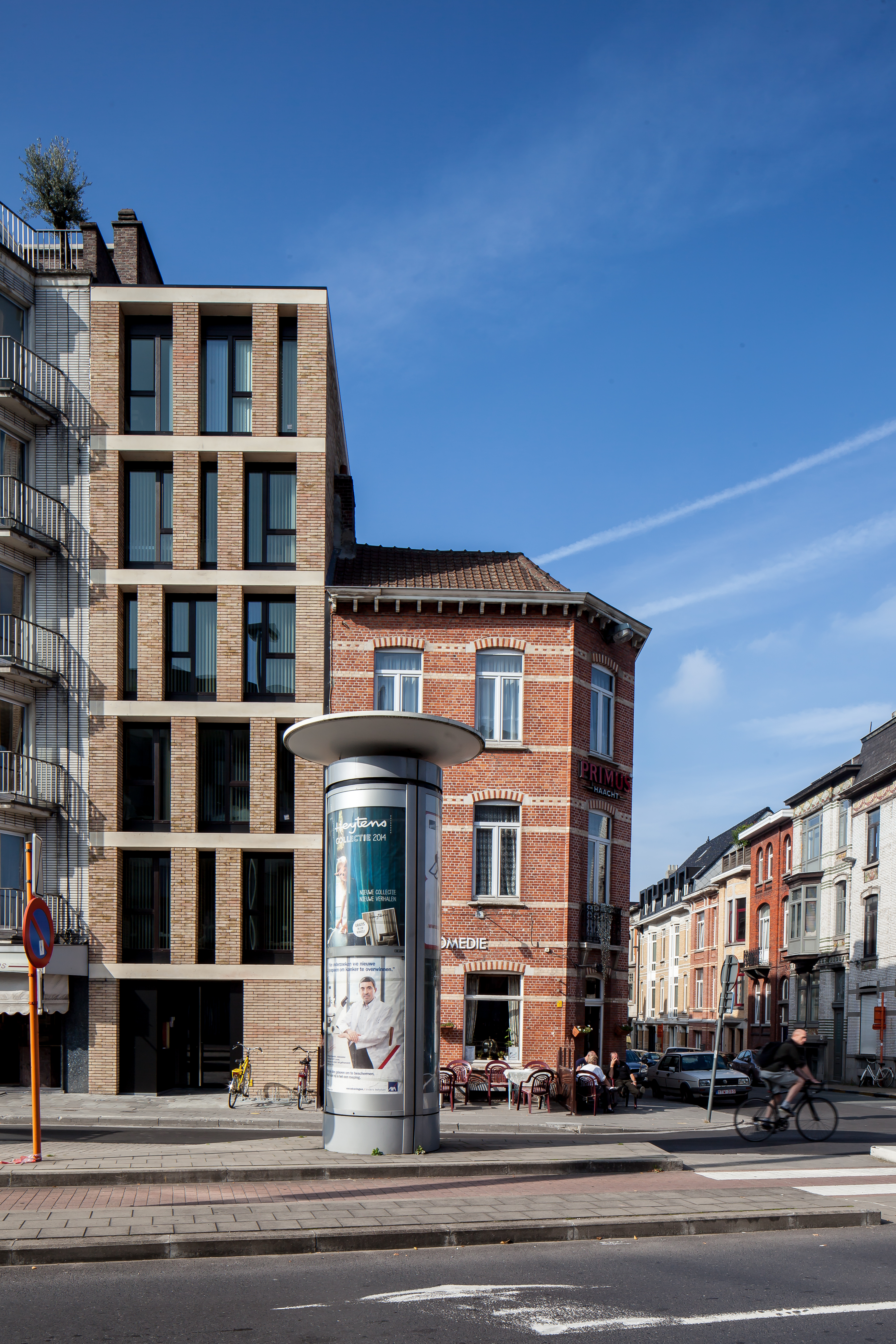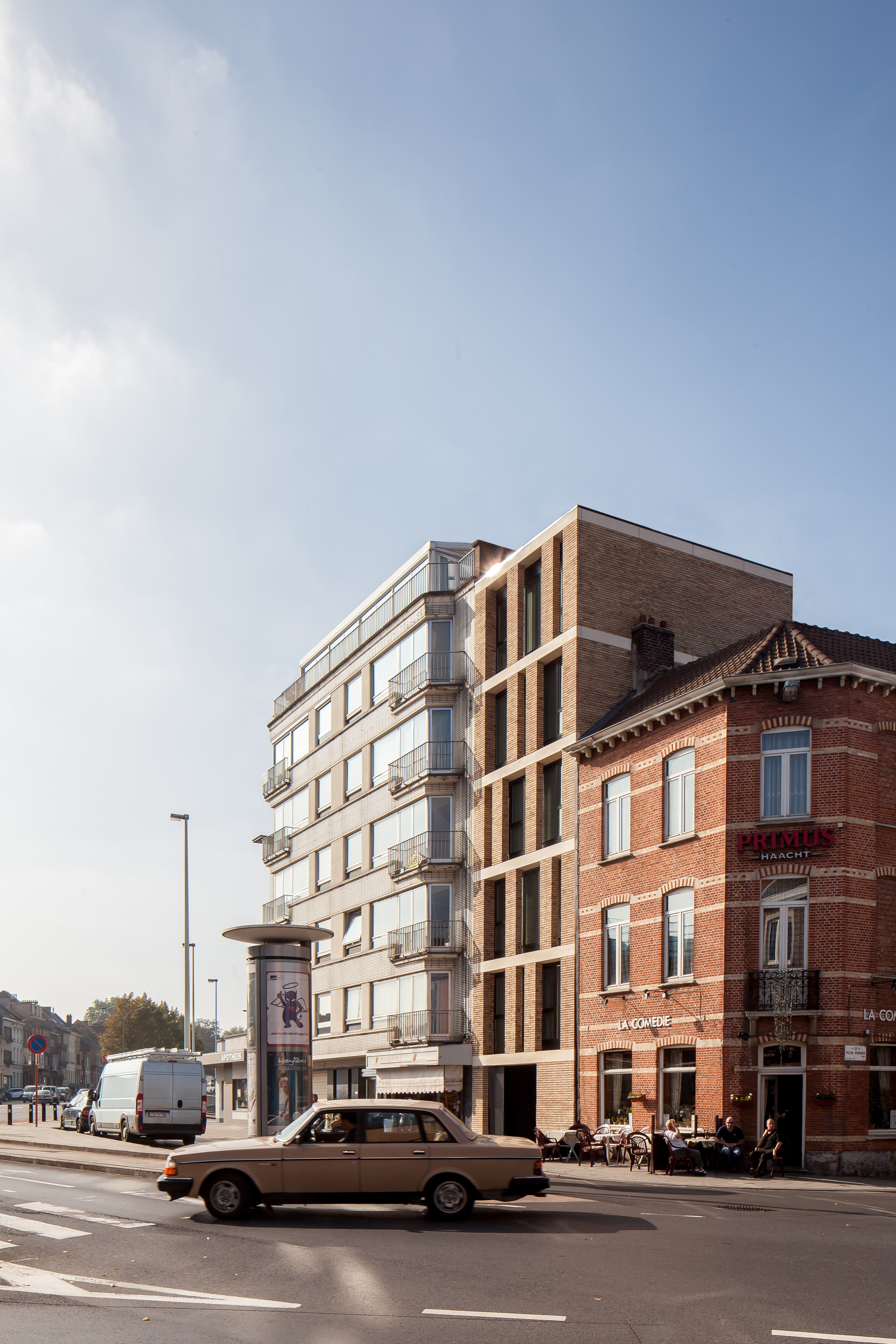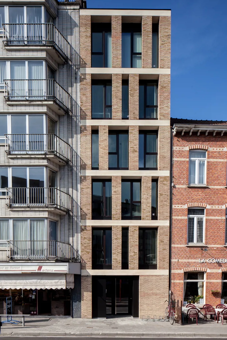 Op het smalle bouwperceel stond een niet kwalitatief gebouw van een 4-tal bouwlagen. Via overleg met de dienst stedenbouw werd verkregen dat een 6 bouwlagen hoog volume gerealiseerd mocht worden. De smalle gevelbreedte maakt dat er een elegant verticaal volume ontstaat tegen de wachtgevel van het linker aanpalend gebouw.