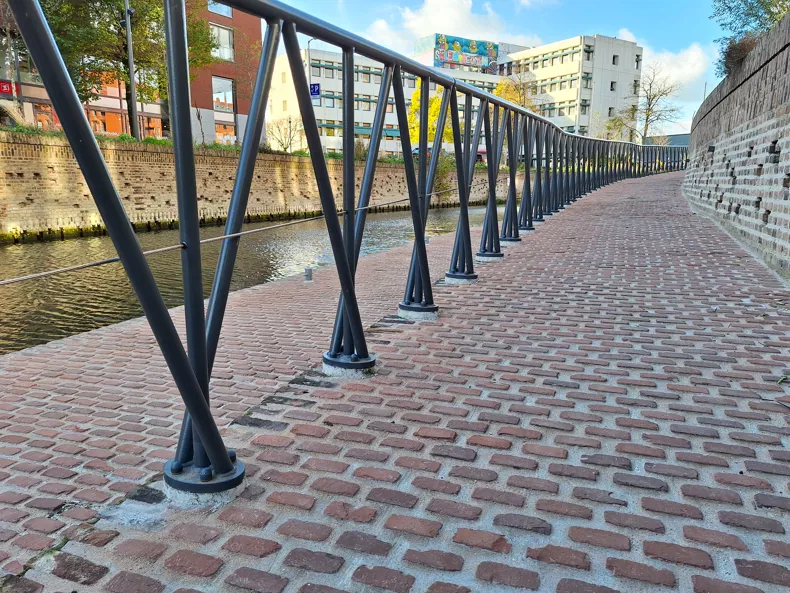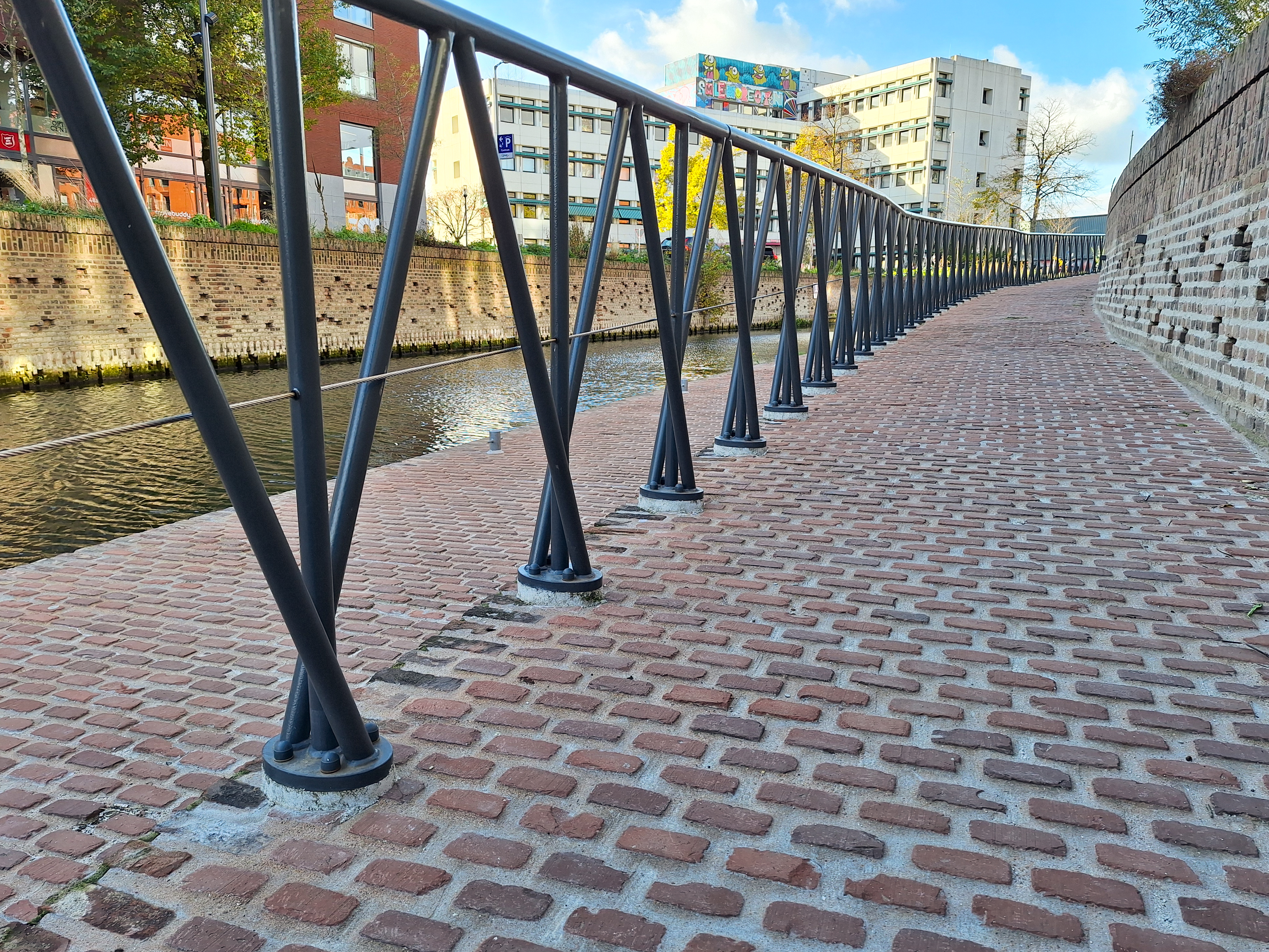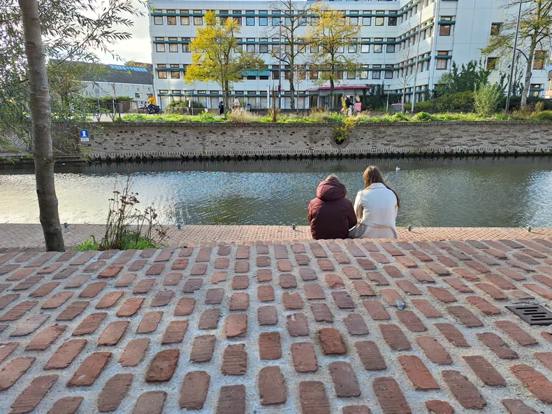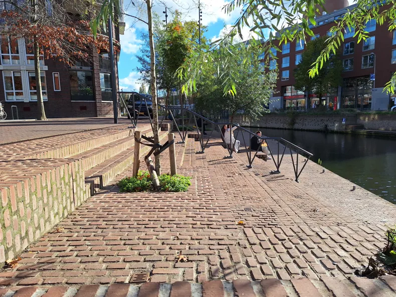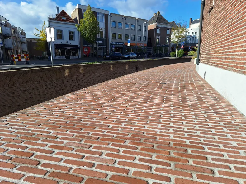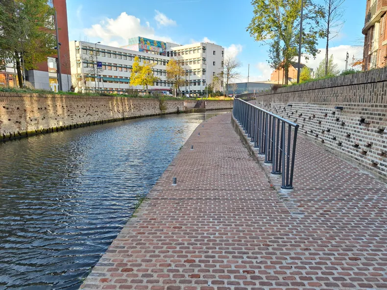 Wat meteen in het oog springt langs de Nieuwe Mark, is het wandelpad en de trap aan de kade waar het fijn vertoeven is. De keuze voor de DecimA Mahonie straatbakstenen van Steenbakkerij Vande Moortel past perfect binnen de visie van dit project. Hun robustheid, kleurvastheid en natuurlijke uitstraling sluiten naadloos aan bij het karakter van de Nieuwe Mark, waar deze getrommelde straatbakstenen in mortel zijn verwerkt met de kop naar boven. Dit koppenverband (langs de gehele kade) is met name gekozen omdat je meer voegen hebt waarbij planten en dieren de kans krijgen om te kiemen/nestelen. Een subtiel, maar krachtig detail dat vakmanschap en esthetiek verenigt en de duurzame identiteit van het project versterkt.