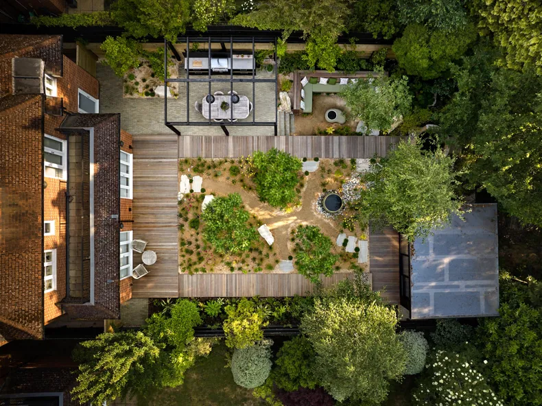 Een grote uitdaging was het beheren van meerdere drainagekamers in de tuin, die afvloeiing van aangrenzende percelen verzamelden. De oplossing bestond uit het toevoegen van extra drainage en het opnieuw configureren van de lay-out om deze kamerafdekkingen naadloos te verbergen. Om een gevoel van stroming en toegankelijkheid te creëren, werden er vlonders geplaatst om de verschillende zones met elkaar te verbinden, waarbij het centrale gazon werd vervangen door grindachtige beplanting en meerstammige Rhus bomen voor extra structuur. Deze lay-out moedigt beweging aan en biedt vanuit elke hoek een onbelemmerd uitzicht op weelderig groen.