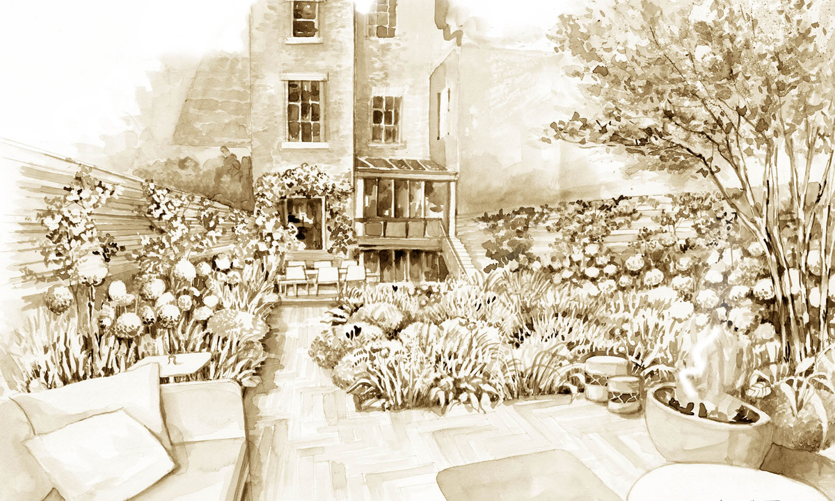 De bedoeling was om een plek te creëren die met elk seizoen verandert en bovendien een goed evenwicht biedt tussen bruikbare ruimten met verschillende functies en grote plantenbedden die zichtbaar zijn vanuit elke kamer in het huis. De meerstammige Cornus kousa, die we in volwassen vorm achterin de tuin plantten, geeft een gevestigde uitstraling aan de plaats.