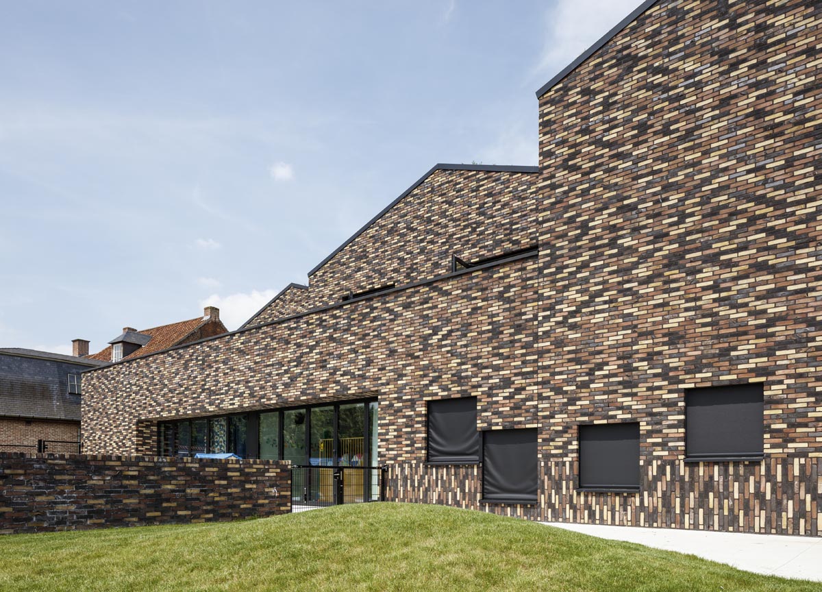 Deze plint heeft in elke gegeven situatie een eigen functie en structureert ruimte op een begrijpbare en tastbare manier voor de kleintjes. De plint is ook verwerkt in het gevelmetselwerk waardoor het gebouw een duidelijke basis krijgt en de kleine kinderen een referentiekader.