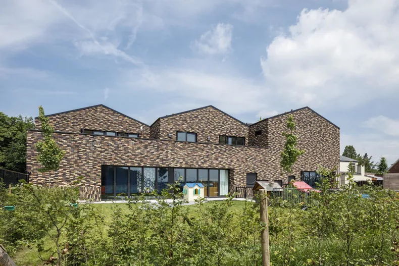In het gebouw is elke leefruimte voorzien van een groot plooiraam waardoor er een directe verbinding ontstaat met de speelruimte buiten en de achterliggende natuur. In de zomer, bij openstaande ramen, vervaagt zo de grens tussen de binnen-buitenruimte.