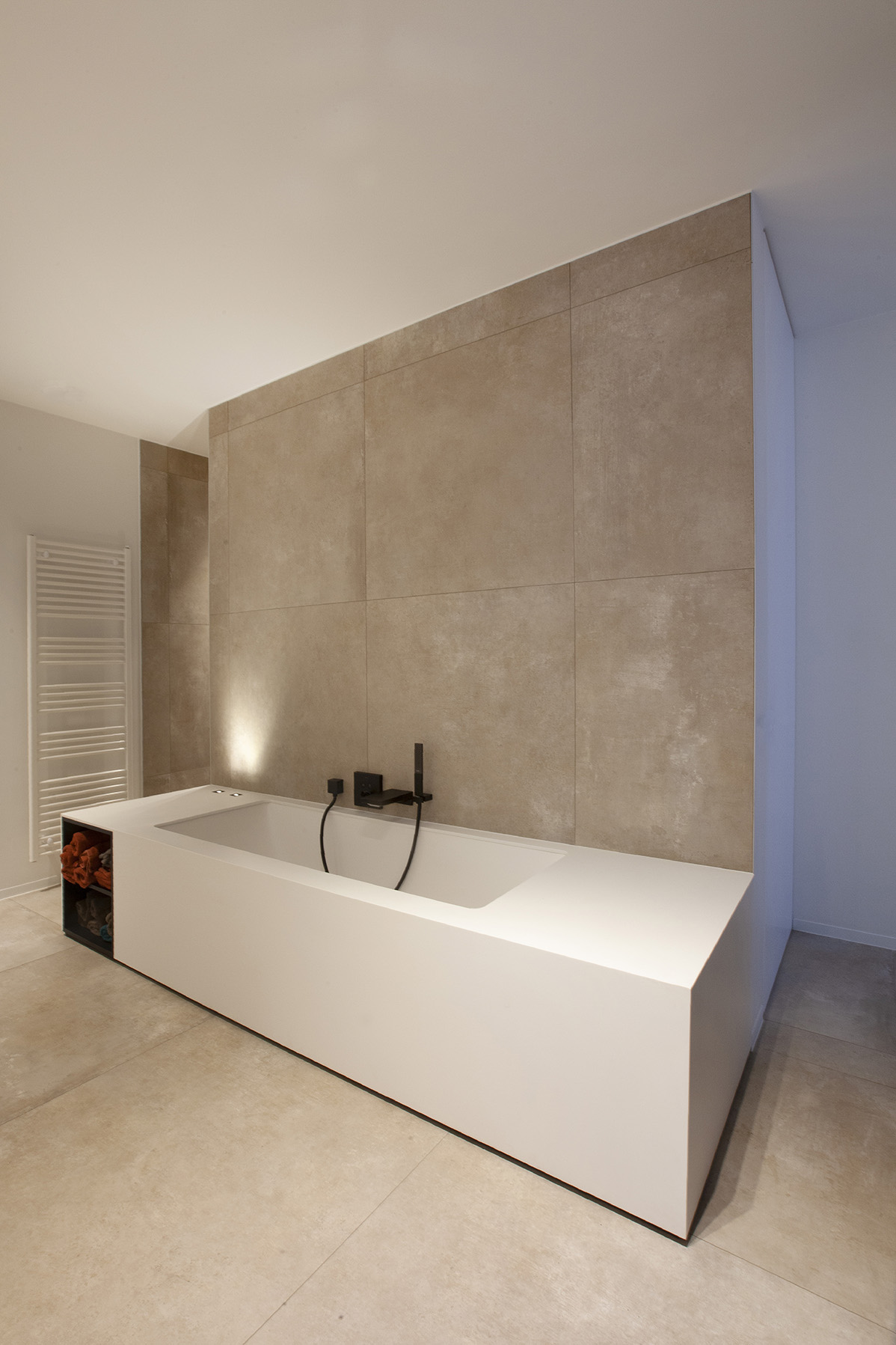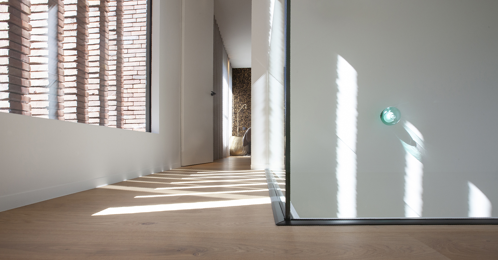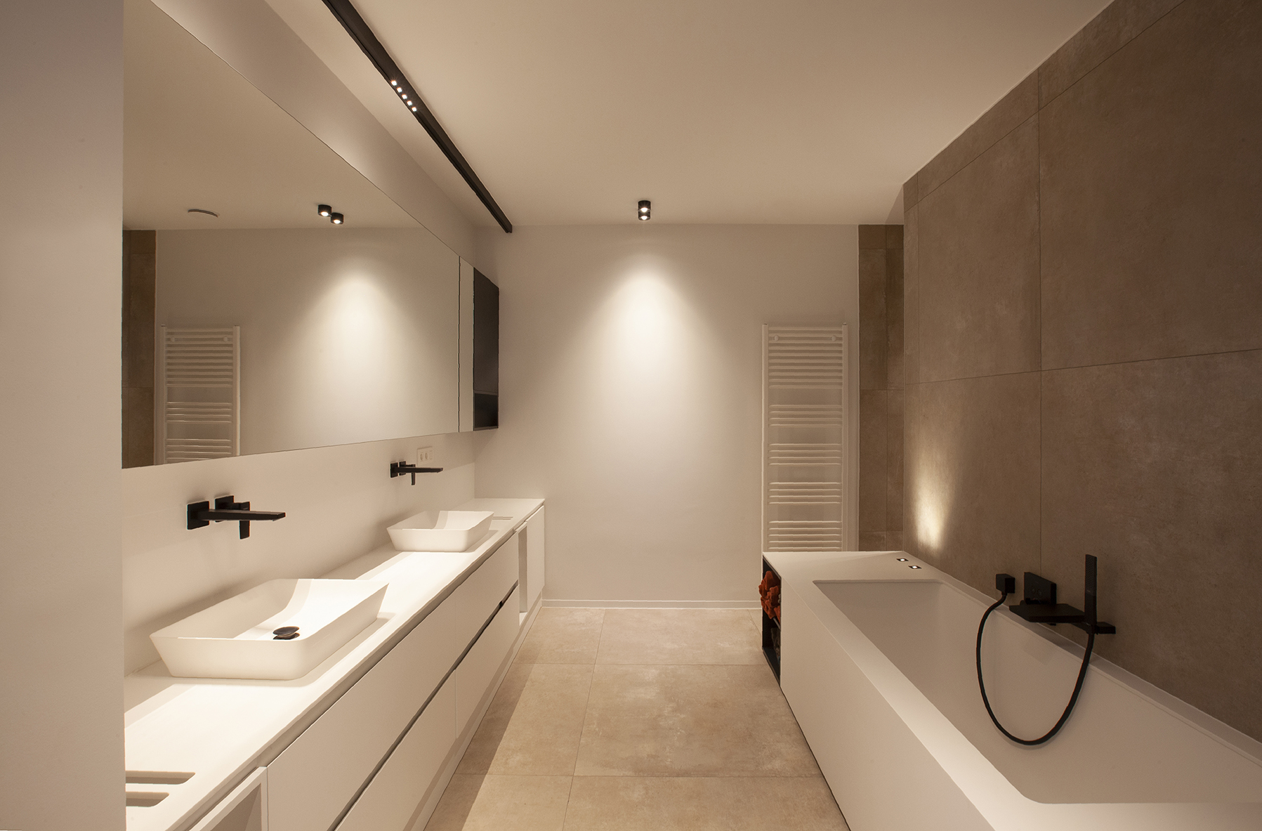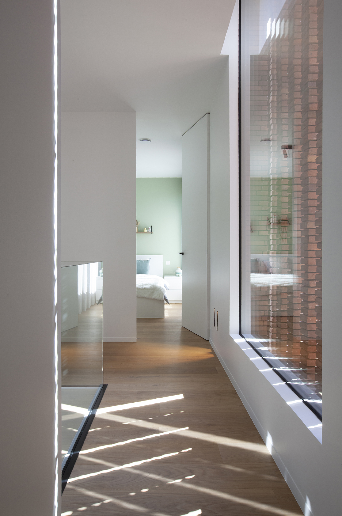 Een andere wens van de klant was een inpandige garage. Geen gemakkelijk verhaal naar EPB, noch naar vormgeving. Voor Egide Meertens was het zeker niet de bedoeling om die nog meer te accentueren dan de voordeur. “Wij hebben dus de gevelbekleding van de poort doorgetrokken in de opening van de voordeur die we verder transparant hebben voorzien. Om toch voldoende licht binnen te trekken in de verdiepte inkom en om de voordeur te accentueren, hebben we gewerkt met een lichtkoker in de woning achter de voordeur. Zo laten we daar bovenlicht binnenvallen. Een raam in deze vide verstrooit ook daglicht in de badkamer. De klant wou in die ruimte liever geen buitenraam. Begrijpelijk, maar ik vind het wel belangrijk om natuurlijk licht in een badkamer te hebben. Zo konden we ook dat oplossen. Licht en ruimtelijkheid vinden wij heel belangrijk in een woning.” Die ruimtelijkheid wordt ook versterkt door zichtlijnen te voorzien. Egide Meertens wil daarbij doorzichten bieden zoals de glimp van de tuin die je al opvangt bij de inkom, maar zonder meteen alles prijs te geven.