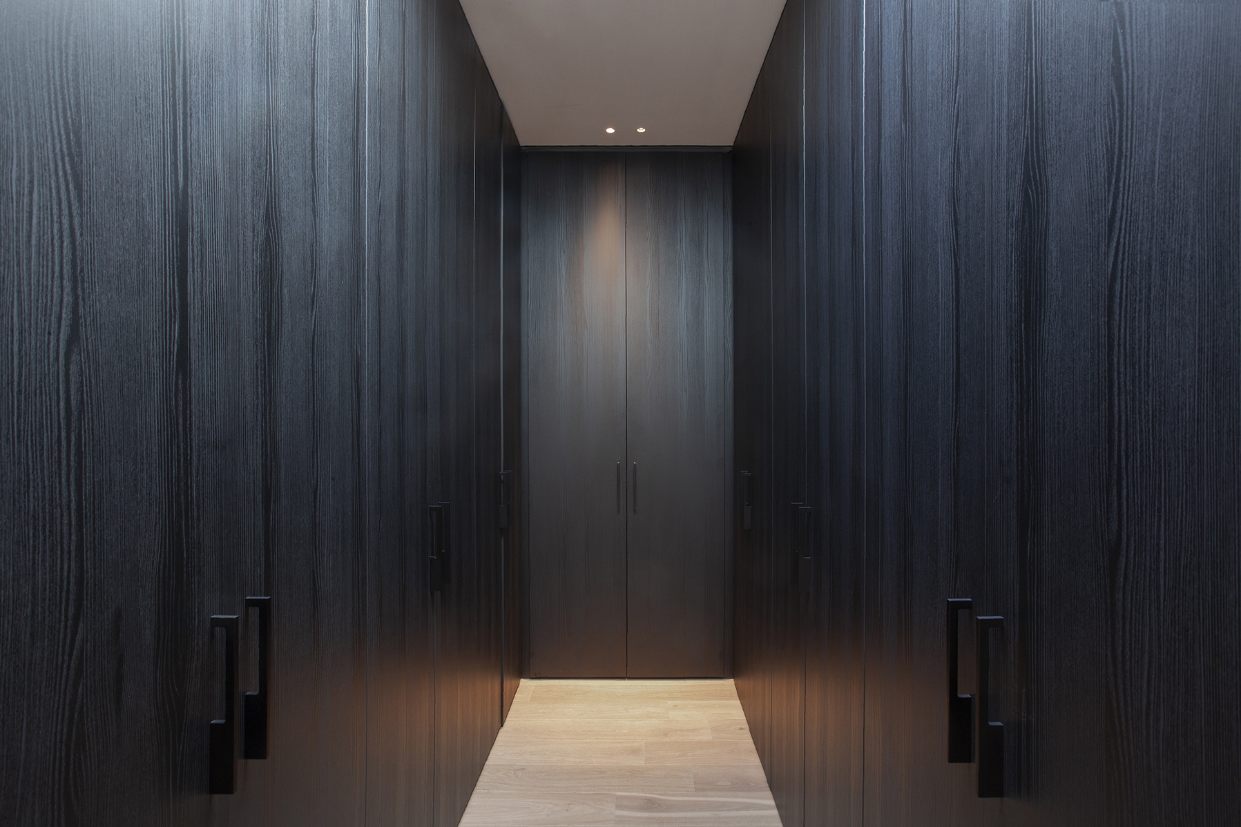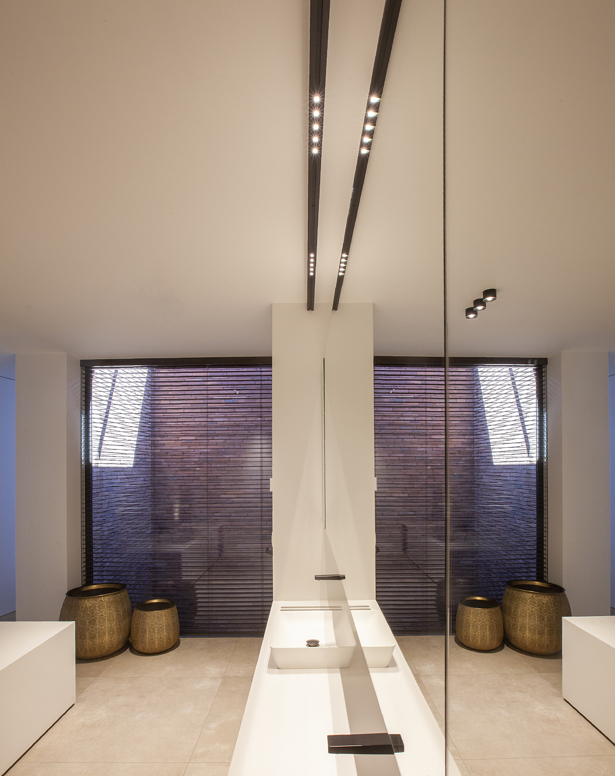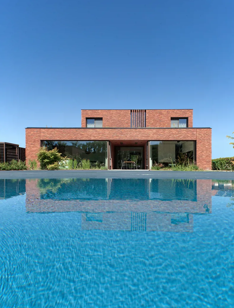 De verfijnde verwerking van materialen komt daarnaast terug in de ranke kolommen van gevelstenen. Om deze bijzondere details te realiseren, werkten ze met verankerde draadstangen waarover de Linea 3016 bakstenen – die op voorhand uitgefreesd werden met een waterjet – werden geschoven. Zo krijg je slanke volumes. Datzelfde concept komt ook terug in de achtergevel. Het zorgt bovendien voor een heel specifieke lichtinval bij ruimtes die dat kunnen gebruiken. Zoals de nachthal en ter hoogte van de trappartij. Egide Meertens werkt graag met een subtiele gevelsteen en liefst in een rode tint zoals bij deze van Vande Moortel. Dat is nu eenmaal de natuurlijke kleur na het bakproces. Dezelfde bruinrode tint pasten ze ook toe bij het buitenschrijnwerk en de bestrating. Verder werkten ze niet met valse plafonds, maar met steenstrips. Zo bekom je een zekere massiviteit en een beperkt materialenpallet. Al deze ingrepen helpen om de woning beter in het landschap te zetten en ondanks de eerder gesloten voorgevel toch een vriendelijke uitstraling te genereren in het straatbeeld. Ook in het interieur is een beperkt materialenpallet gebruikt.