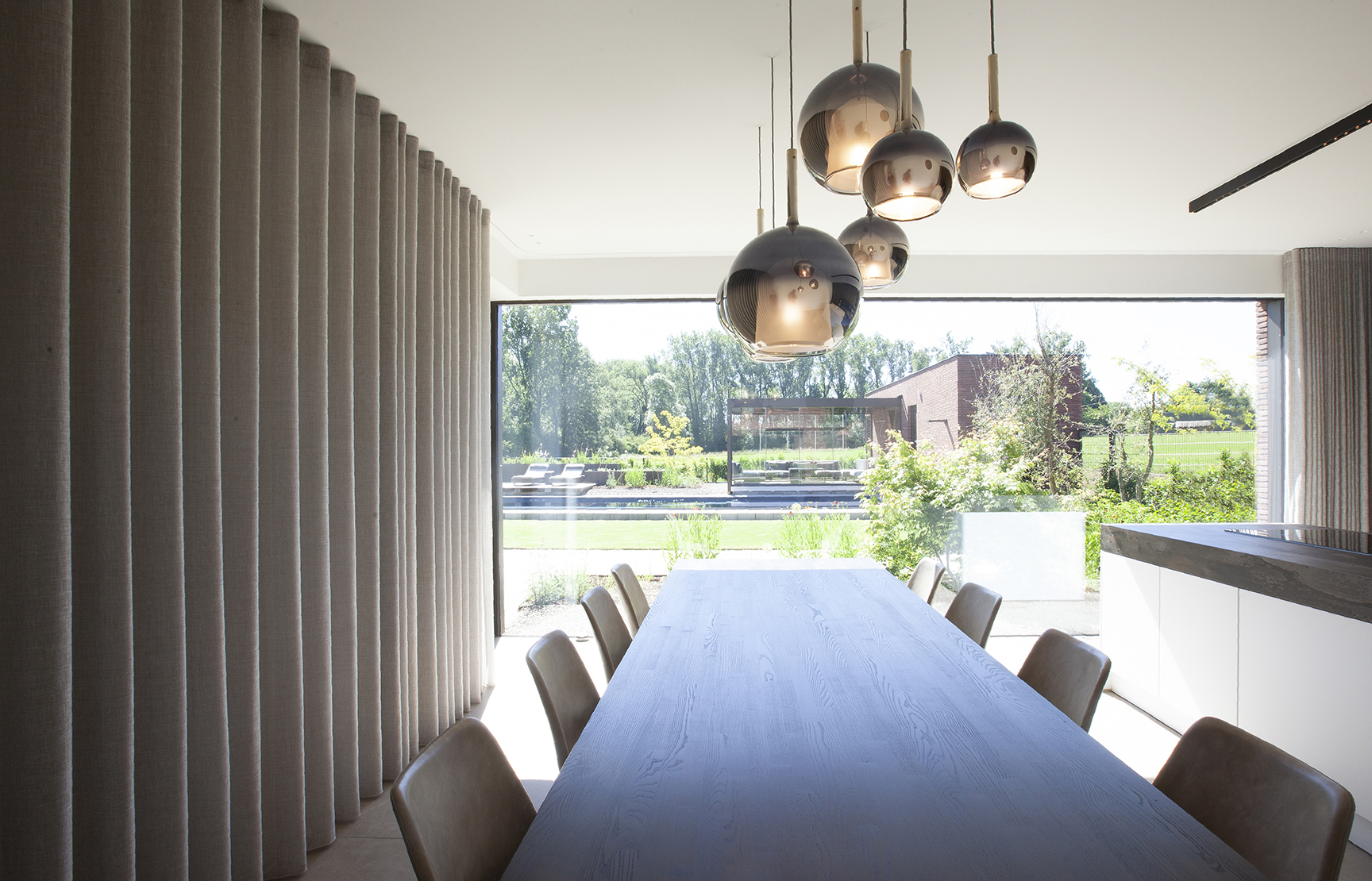De gevelsteen komt hier en daar terug, dat zorgt voor een link tussen buiten en binnen en voor rust. Ook in het interieur een knipoog naar het werk van de bouwheer met de eettafel die een stalen onderstel kreeg onder een houten blad en dat hij ook zelf realiseerde. Vanuit energetisch perspectief vindt Egide Meertens het essentieel om een woning te realiseren die ook op dat vlak duurzaam is. Vandaar dat ze al in ontwerpfase rekening houden met het energetische aspect van de woning zodat zeker minstens alle wettelijke normering wordt gehaald. In dit project halen ze zelfs met alle beglazing een E-peil in negatieve zin. Met dank aan de bouwheer die ook bereid was om in de nodige technieken te investeren. Een klik met de bouwheer is altijd een meerwaarde. Hier mag je ook echt spreken van een goede samenwerking. “De subtiele verwijzing naar het werk van de bouwheer in de architectuur van de woning vind ik persoonlijk heel geslaagd. De doorzichten en de gecreëerde lichtinval zorgen dan weer voor een derde dimensie. De verhoudingen zitten goed en het spel van volumes doet zijn werk. Maar bovenal moet er beleving en emotie zitten in de architectuur en moet de bouwheer zich goed voelen in zijn woning en er graag vertoeven. Dat is nog altijd de essentie. Door goed te luisteren naar de klant en je creativiteit aan te spreken, is het mogelijk dat droombeeld van de bouwheer te vertalen naar een passend ontwerp.”
