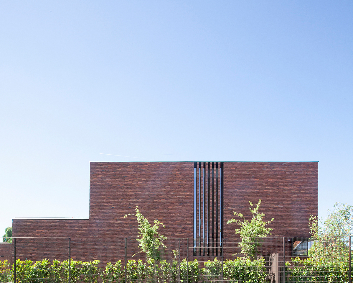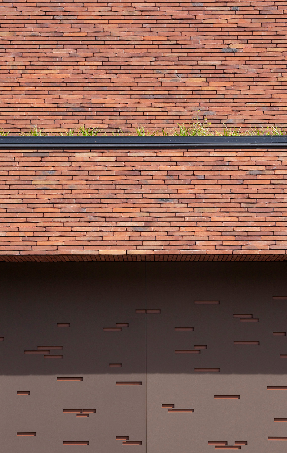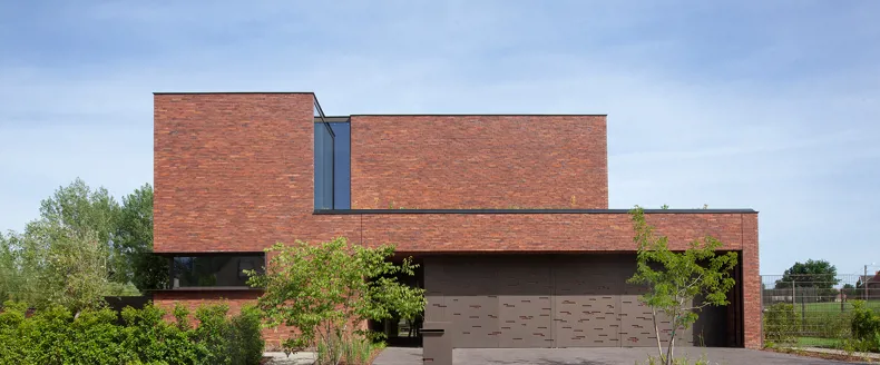 De gevelbekleding is een geslaagd huwelijk van baksteen en metaal, maar niet zomaar. De manier waarop de langgerekte rode gevelsteen en metaal met elkaar in dialoog treden, is heel fijn en een knipoog naar het beroep van de bouwheer. “De garagepoort is niet gewoon een metalen vlak geworden met platen die in de handel verkrijgbaar zijn. Die is opgebouwd uit grote pivoterende vlakken die hydraulisch opendraaien, maar het bijzondere is dat we in de metaalplaten zelf een motief van bakstenen uitgestraald hebben. Een achterliggende rode metaalplaat versterkt dat accent bovendien door er diepte aan te geven. Het baksteenmotief komt overigens ook terug in de op maat ontworpen brievenbus. Een andere subtiele verwijzing zie je in het hoekraam van de kinesistenpraktijk. Dat is omkleed door een uitkragende metalen kader. De glasvlakken in dit kader zijn koud verlijmd, waardoor geen profielen zichtbaar zijn in het metalen kader. Op die manier hebben we getracht het beroep van de bouwheer op verfijnde wijze te verzoenen met de architectuur.”