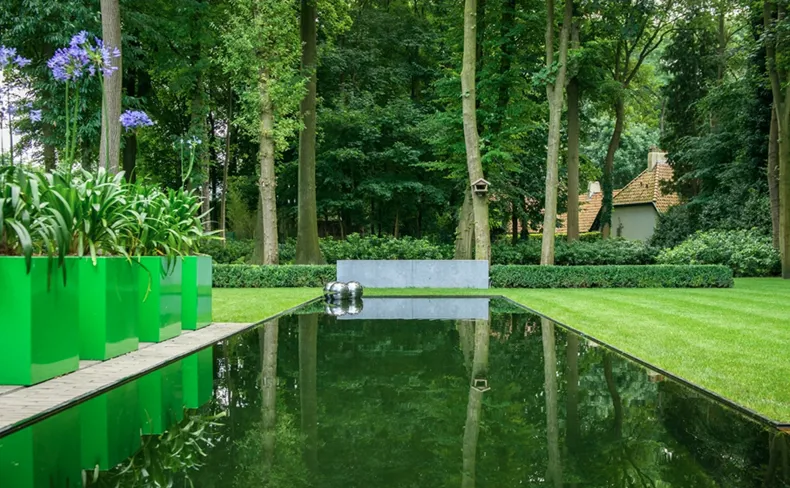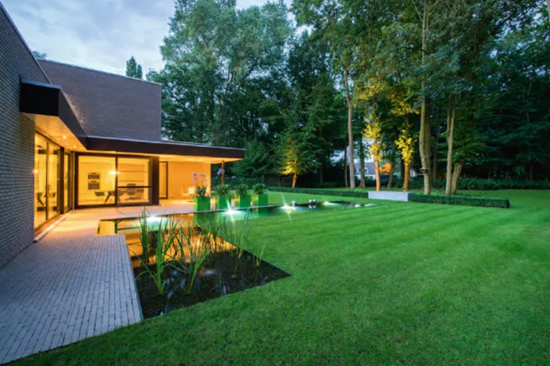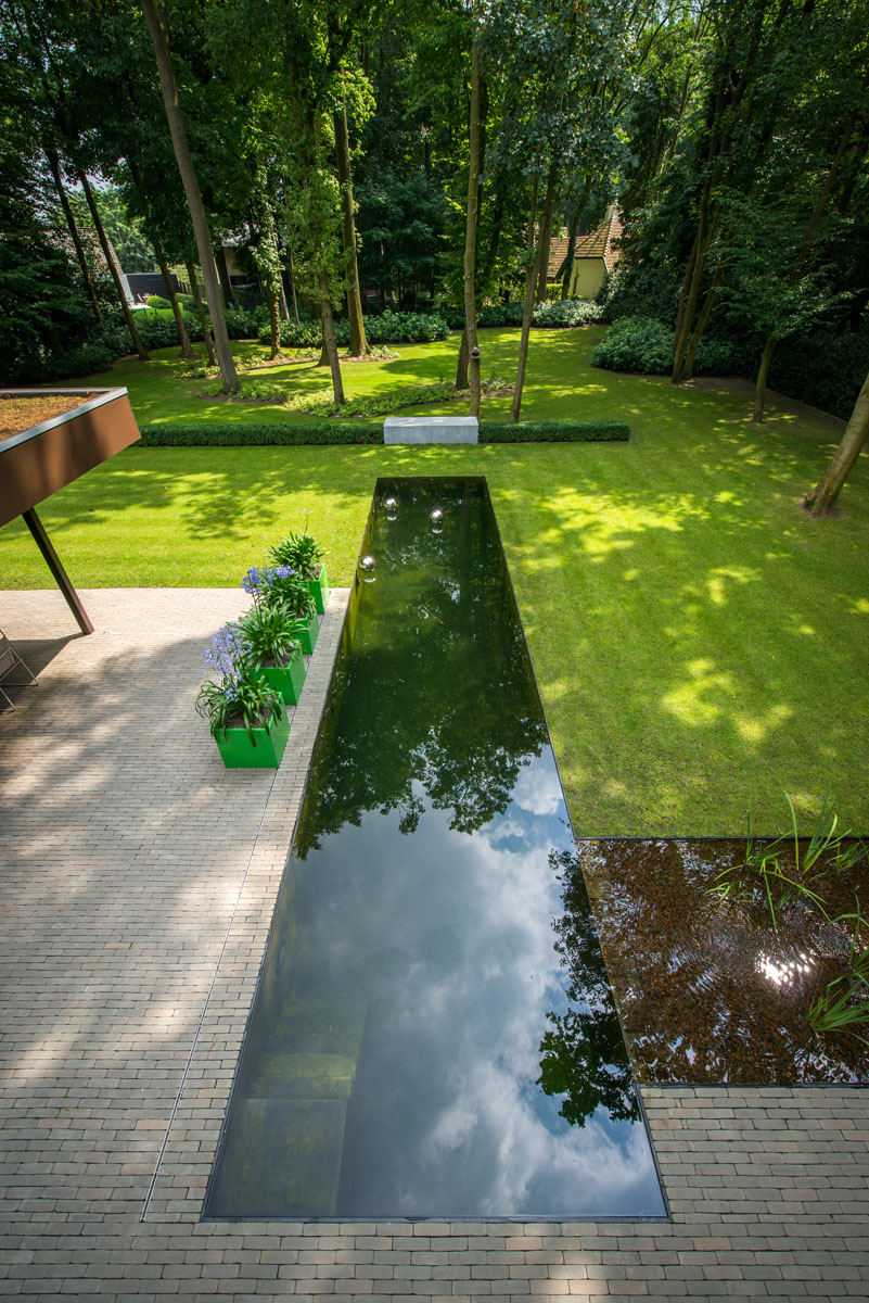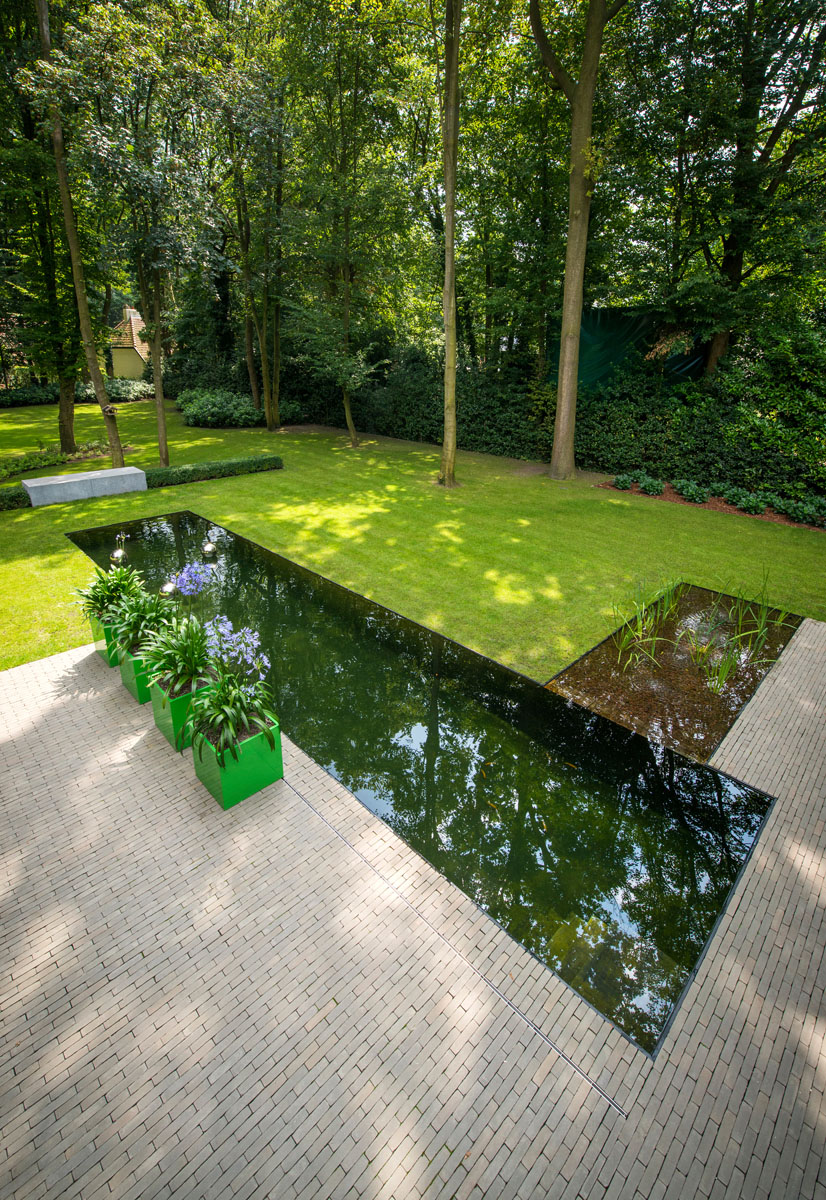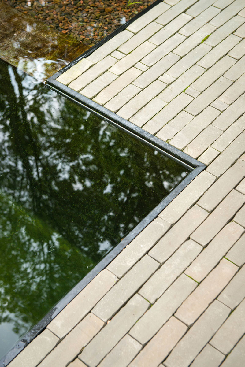 Voor de verharding integreerde Bart Monbaliu een van zijn favoriete materialen: kleiklinkers. De beige-grijze kleiklinkers (SeptimA Salvia) zijn kwalitatief, slijtvast, en hebben een natuurlijke uitstraling. Ze steken mooi af tegen de zwemvijver en dragen bij aan de strakke look van de tuin in zijn geheel.