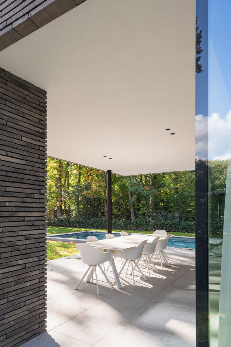 Dit effect wordt versterkt door de tuinmuur aan de rechterzijde en de tuinpoort aan de linkerzijde mee te integreren in het verlengde van de voorgevel. De transparante achtergevels zijn zowel op het gelijkvloers als op de verdieping voorzien van brede, overkragende luifels die door hun schaduwwerking oververhitting van de binnenruimtes vermijden. Deze luifels dragen bovendien bij aan de dynamische architectuur van de woning en versterken de openheid van de ruimtes naar de groene omgeving.
