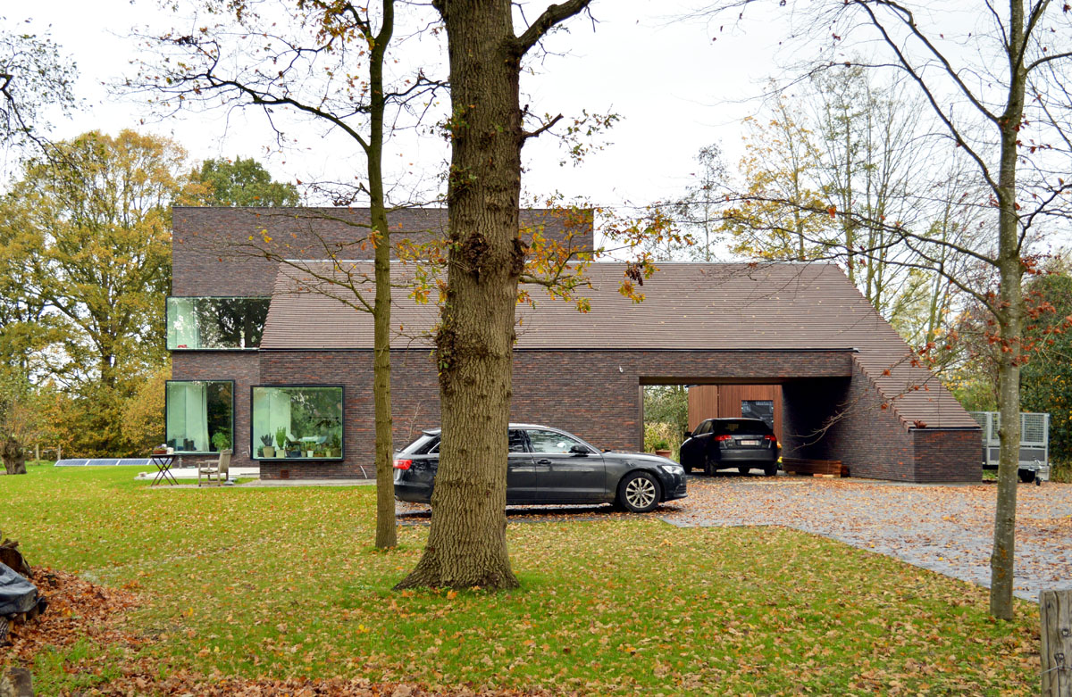 Dit project biedt een thuis aan een koppel en hun gasten te midden van een indrukwekkende groene omgeving. Het huis valt op door twee grote, hellende volumes die in sterk contrast staan met het vlakke terrein rondom, maar opwegen tegen de hoge bomen. Deze elementen worden verbonden door een lager volume met plat dak.
