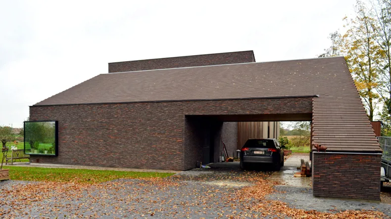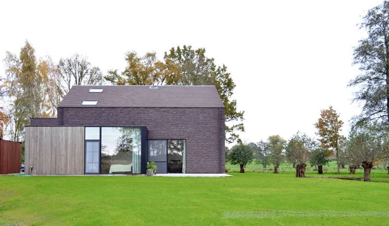 Met de leien in eenzelfde aardekleur als dakbedekking, lijkt het of er geen verschil is tussen wand en dak. Dit verschaft het gebouw een zeer uniforme en natuurlijke uitstraling, die de sterke harmonie met de omgeving extra benadrukt.