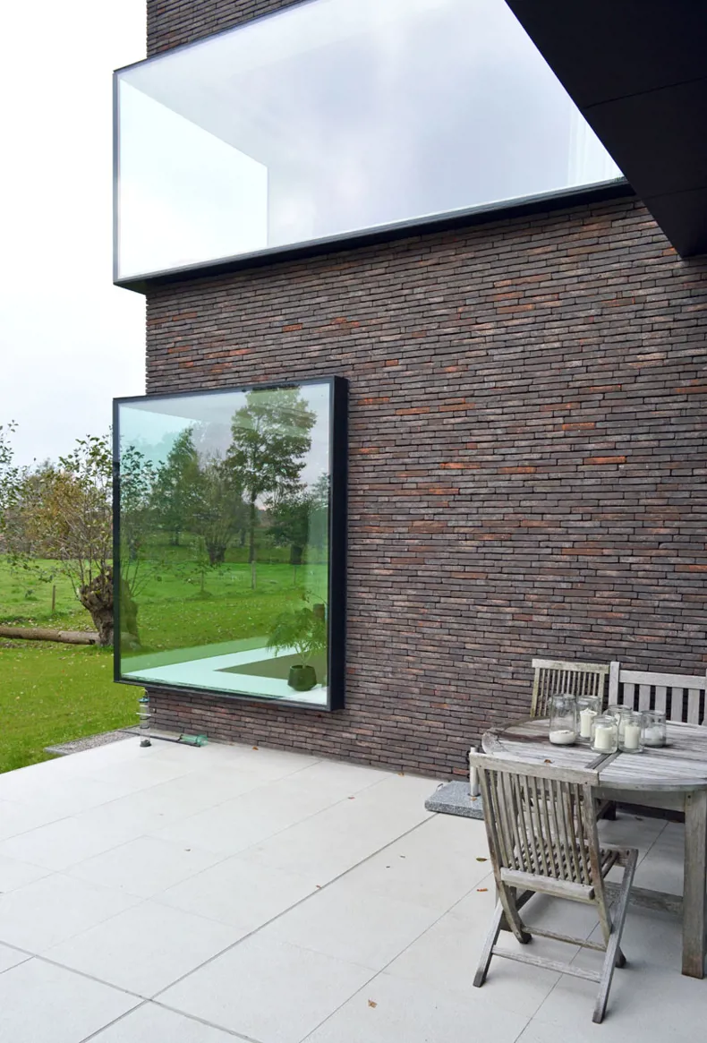 De geringe dikte van de stenen genereert een gevoel van horizontaliteit in de gevelvlakken, dat wordt doorgevoerd in het volume van het hele gebouw en mooi contrasteert met de verticaliteit van de omstaande bomen.