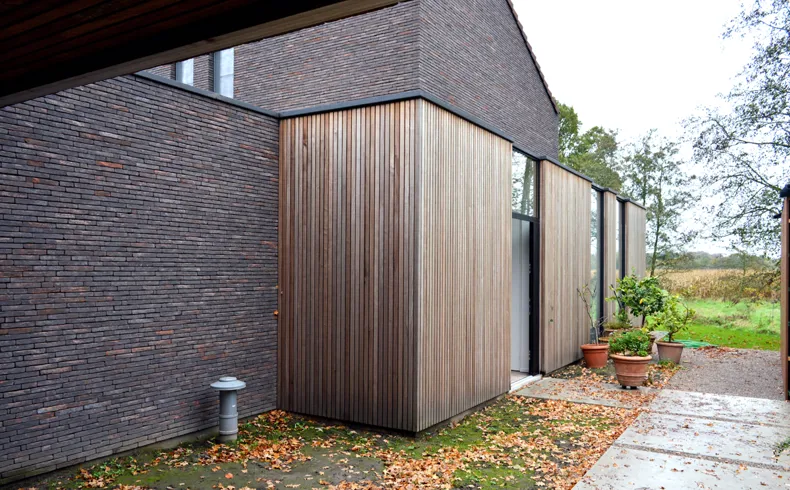 De zwart-rode kleur van de linea 3007 baksteen kan worden teruggeleid naar de kleuren in de omliggende natuur: de bomen, het vallende gebladerte, de aarde. De genuanceerde nerving in de gevelstenen refereert naar de structuur van de boomstammen.