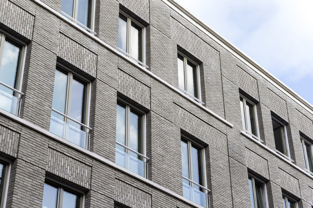 De dakranden, lekdorpels en banden boven de plint zijn gemaakt uit ge-etst witgroen beton en verwijzen hierdoor naar de gevelopbouw van de bestaande negentiende-eeuwse gebouwen.