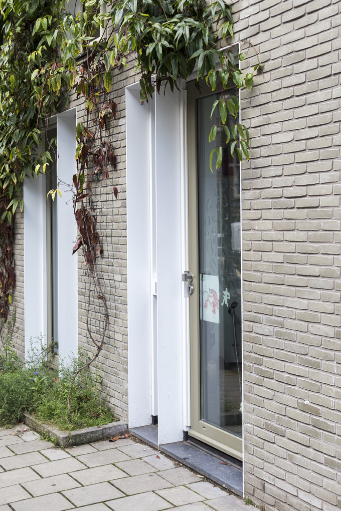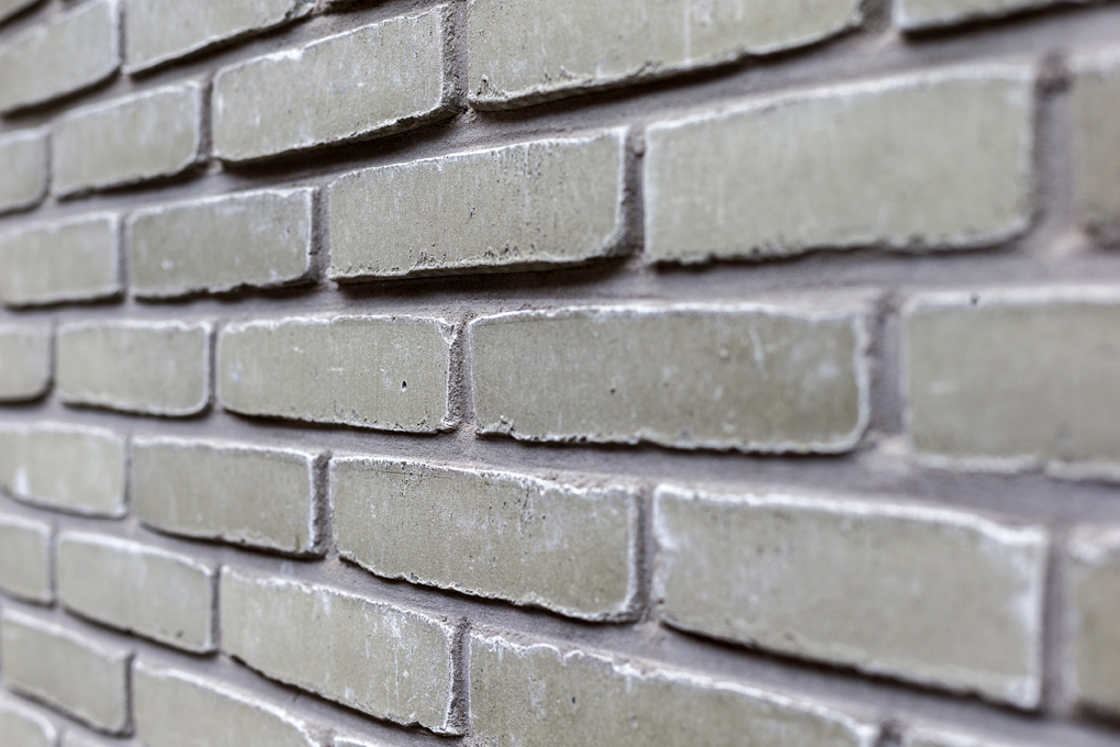 De formeel ogende straatgevel is opgetrokken met de steen Groen-Grijs uit het Miniature – gamma. Er is onder andere voor deze gevelsteen gekozen vanwege zijn toevoeging aan het kleurenpalet van de straat met grijsrode en grijsoranje bakstenen. Om de karakteristieke kleur van deze gevelsteen volledig tot zijn recht te laten komen is hij verwerkt met een neutraal grijze, lichtjes terugliggende voeg.