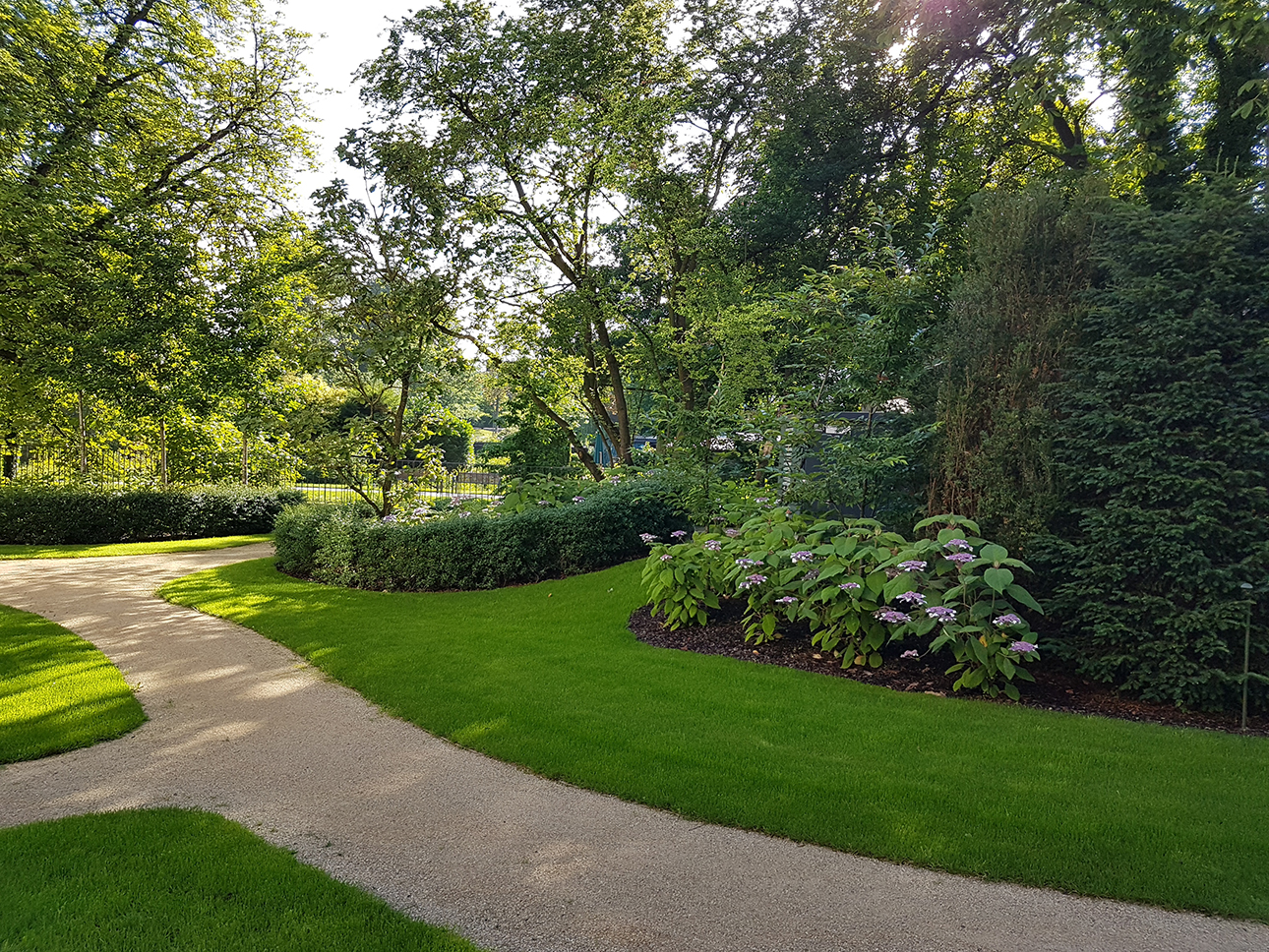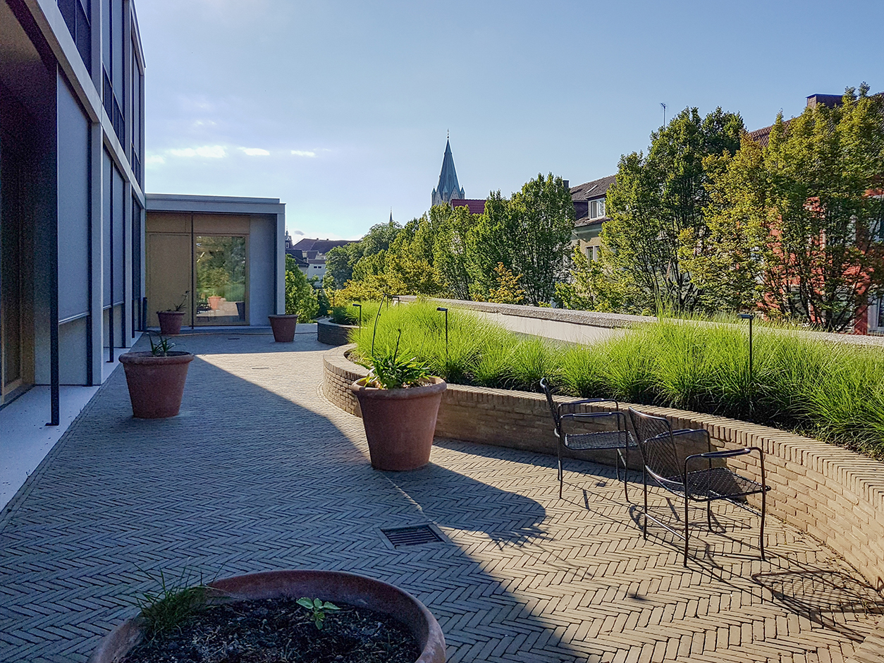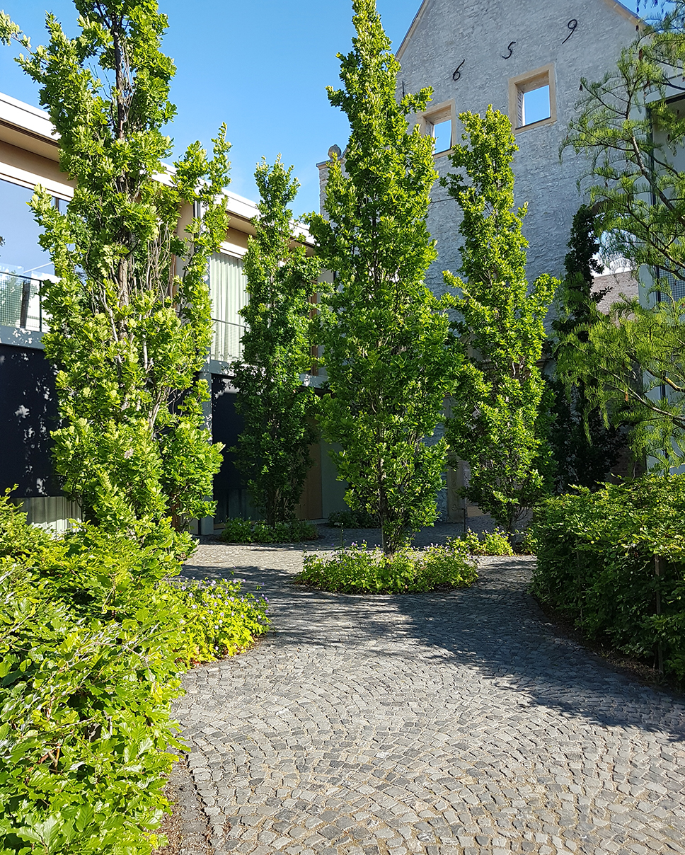 Wirtz kreeg de uitdaging om het indrukwekkende gebouw op het smalle terrein op een speelse manier te integreren in het omringende landschap en de bezoekers te betoveren tijdens hun wandeling door de tuin. Om dit te bereiken, heeft Wirtz gebruik gemaakt van meerdere niveaus en een dynamisch ontwerp dat zich rond het gebouw slingert en wordt begrensd door de muren van de eigendomslijn. Het landschap wordt gevormd door gebogen beuken massieven, moerascipressen en groenblijvende Osmanthushagen, die grote volumes hortensia’s omarmen. Af en toe wordt er een sierboom toegevoegd als verticaal element om het ontwerp te verrijken. De groenvoorziening dient ook als afscherming van de minder aantrekkelijke naburige gebouwen en verbetert zo het uitzicht.