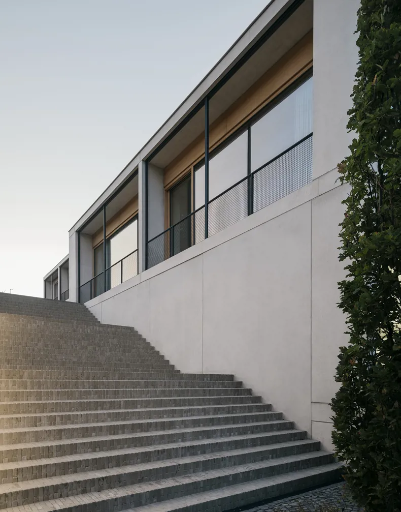Wirtz verwerkte de parelgrijze kleiklinkers uit het Ancienne Belgique-gamma in de kleine trap naar de ingang, de grote monumentale trap tussen het kantoor en de parking en het terras bij de kantine. Dat deden ze niet zomaar. De kleiklinkers verbinden op die manier de verschillende niveaus met elkaar en zo ontstaat er eenheid en rust in het geheel.