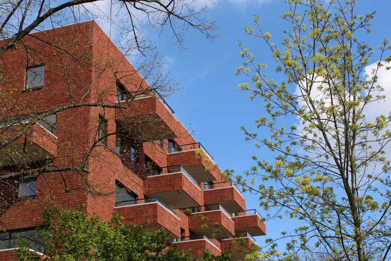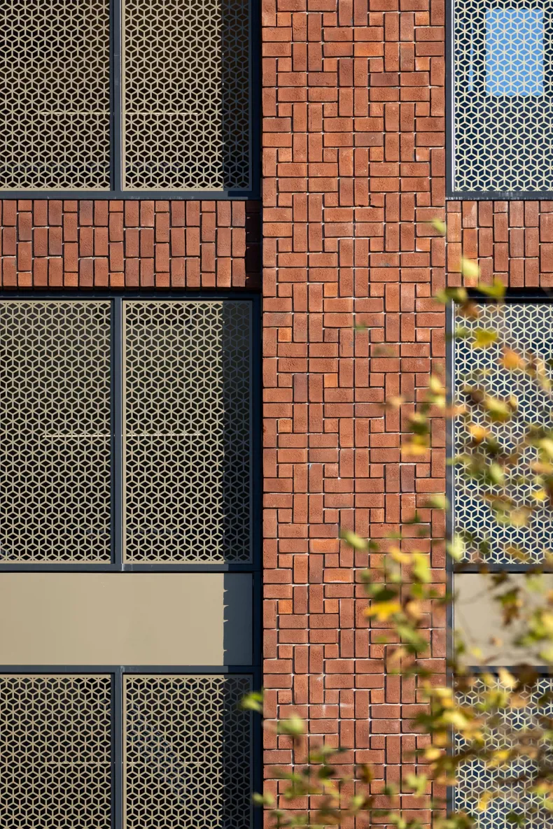 BU31 is een wooncomplex met een uitgesproken en speels karakter, geaccentueerd door het ritme van de Linea gevelsteen in klampmetselwerk. Bij dit project werden prefab sandwichgevelelementen gebruikt waarin de gevelsteen op klamp werd overgoten. De balkons werden er achteraf ‘aangeschroefd’. Het klampmetselwerk is hier niet alleen een esthetisch middel dat het gebouw een speels uiterlijk geeft, maar versterkt ook de materialiteit van de gevels. ZECC architecten koos bewust voor diepe neggen, subtiele verspringingen in het metselwerk en een strakke detaillering. De dunne gevelsteen werd bewust ingezet om de kaders van de negges te maken als een ranke omkadering. Het resultaat is een gevel die rust en continuïteit uitstraalt, maar tegelijk levendig oogt dankzij het spel van schaduw en textuur en de keuze voor de rode baksteen.