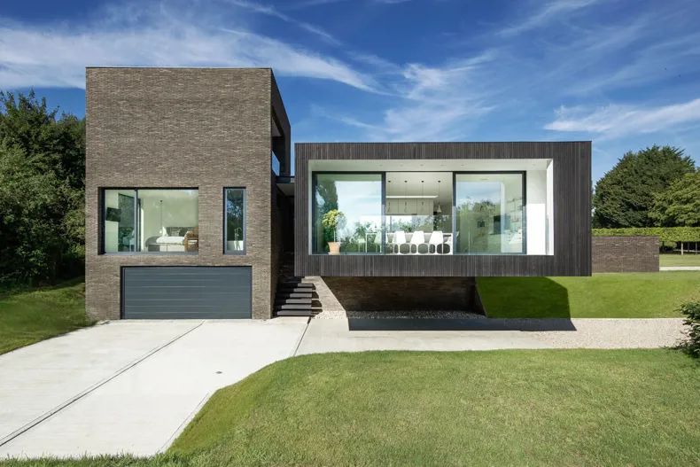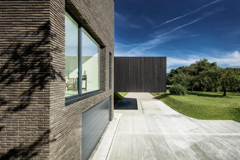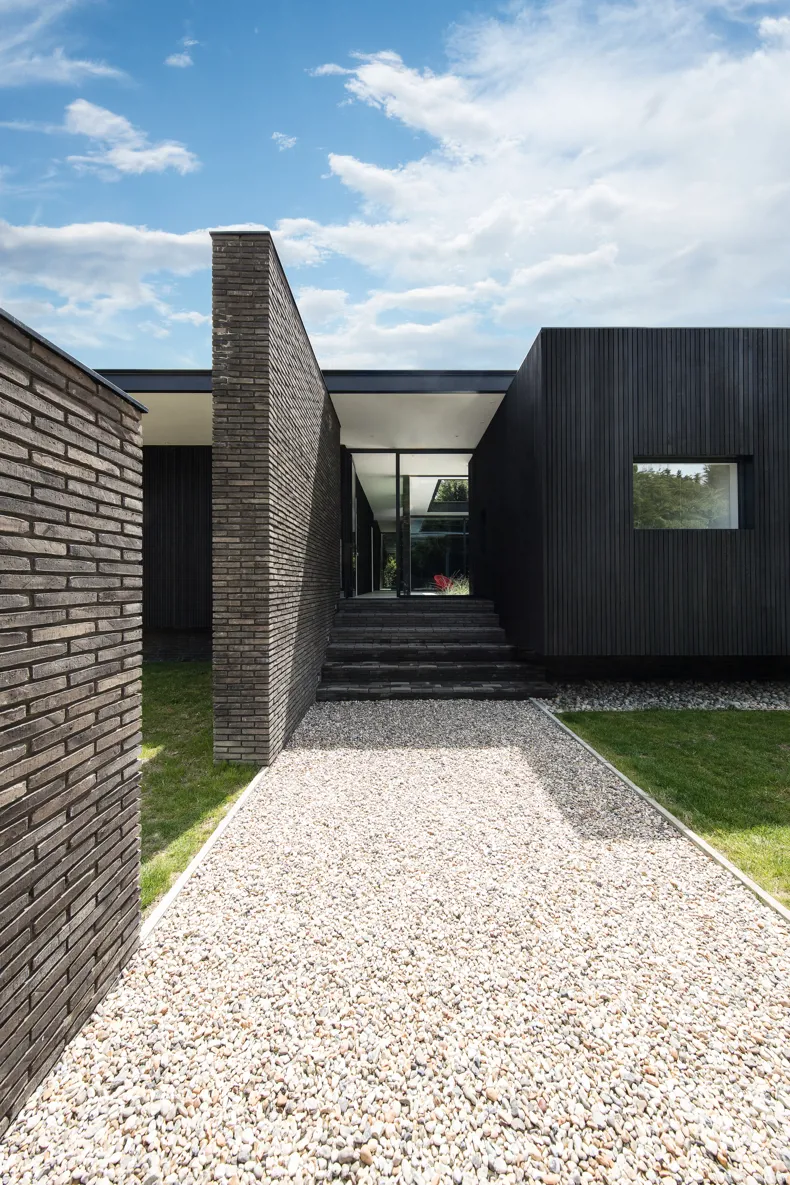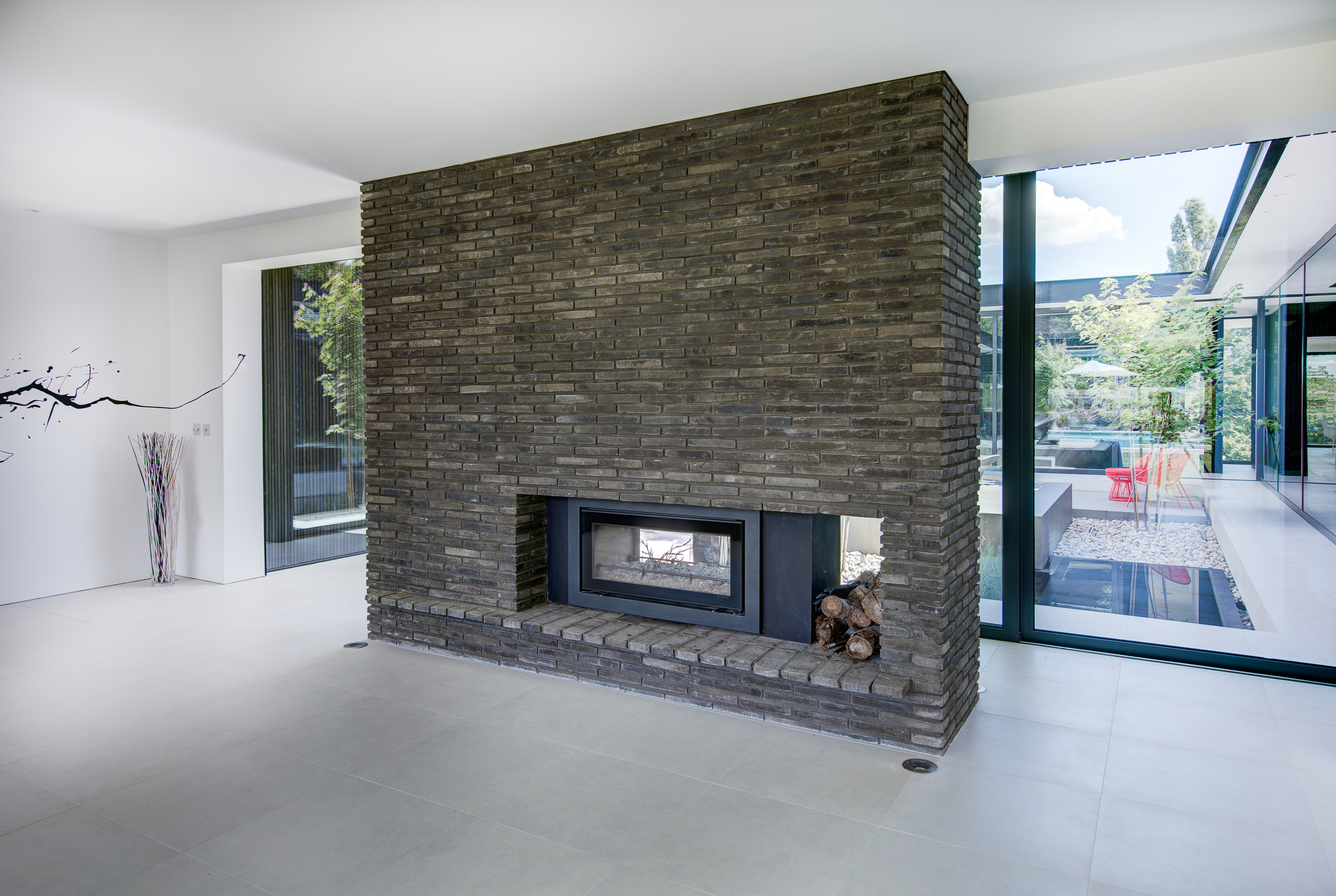 De donkergrijze gevelsteen smelt ook mooi samen met de tinten die zowel binnen als buiten werden gebruikt. In het interieur werd de Linea 6012 verwerkt in diverse muren. Ook de open haard is volledig in de gevelsteen, zowel binnen als de schouw buiten.