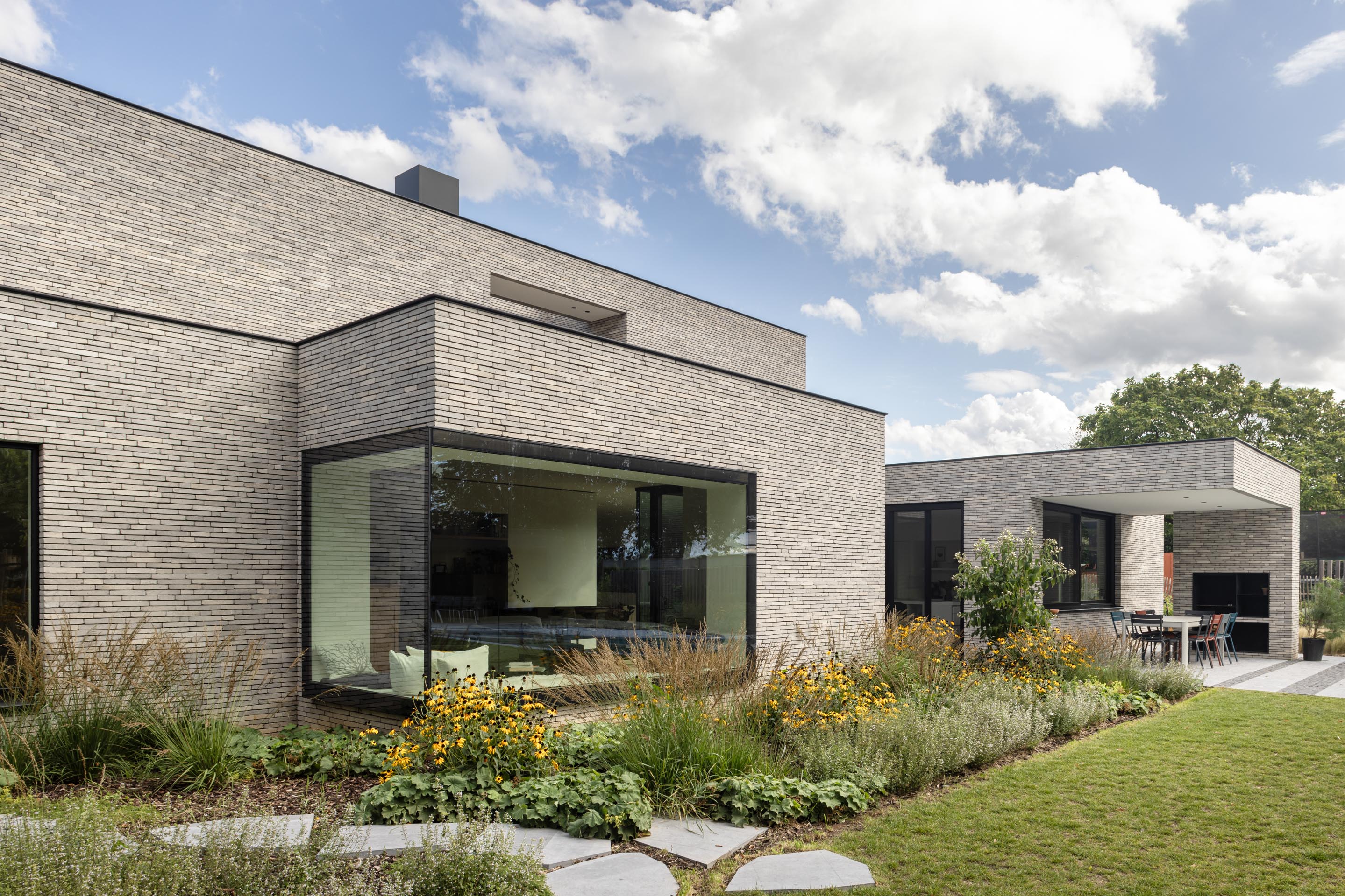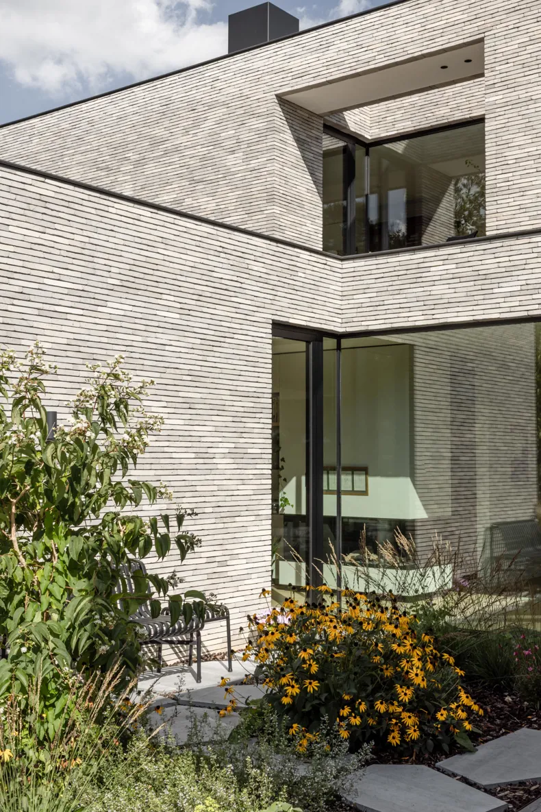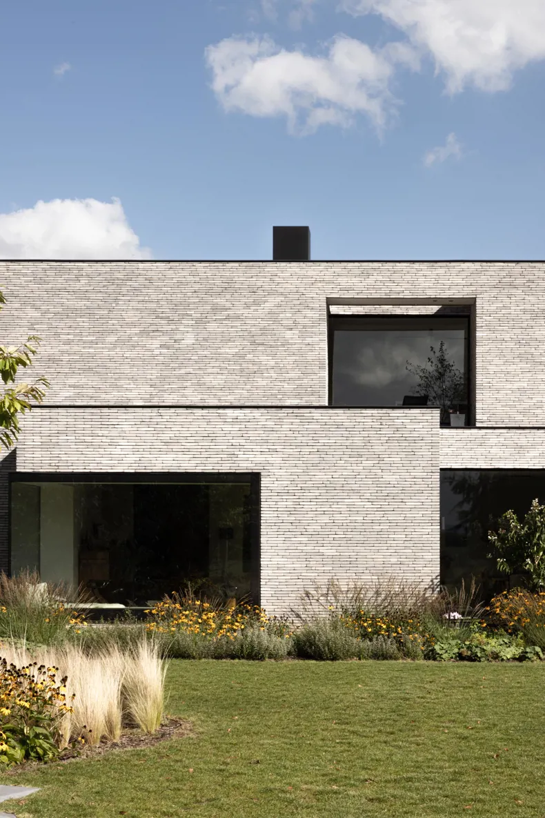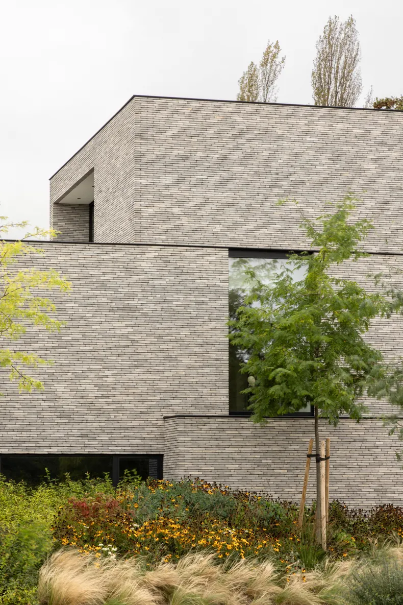 Lichtgrijze gevelsteen creëert een warme, uitnodigende uitstraling die contrasteert met de strakke geometrie