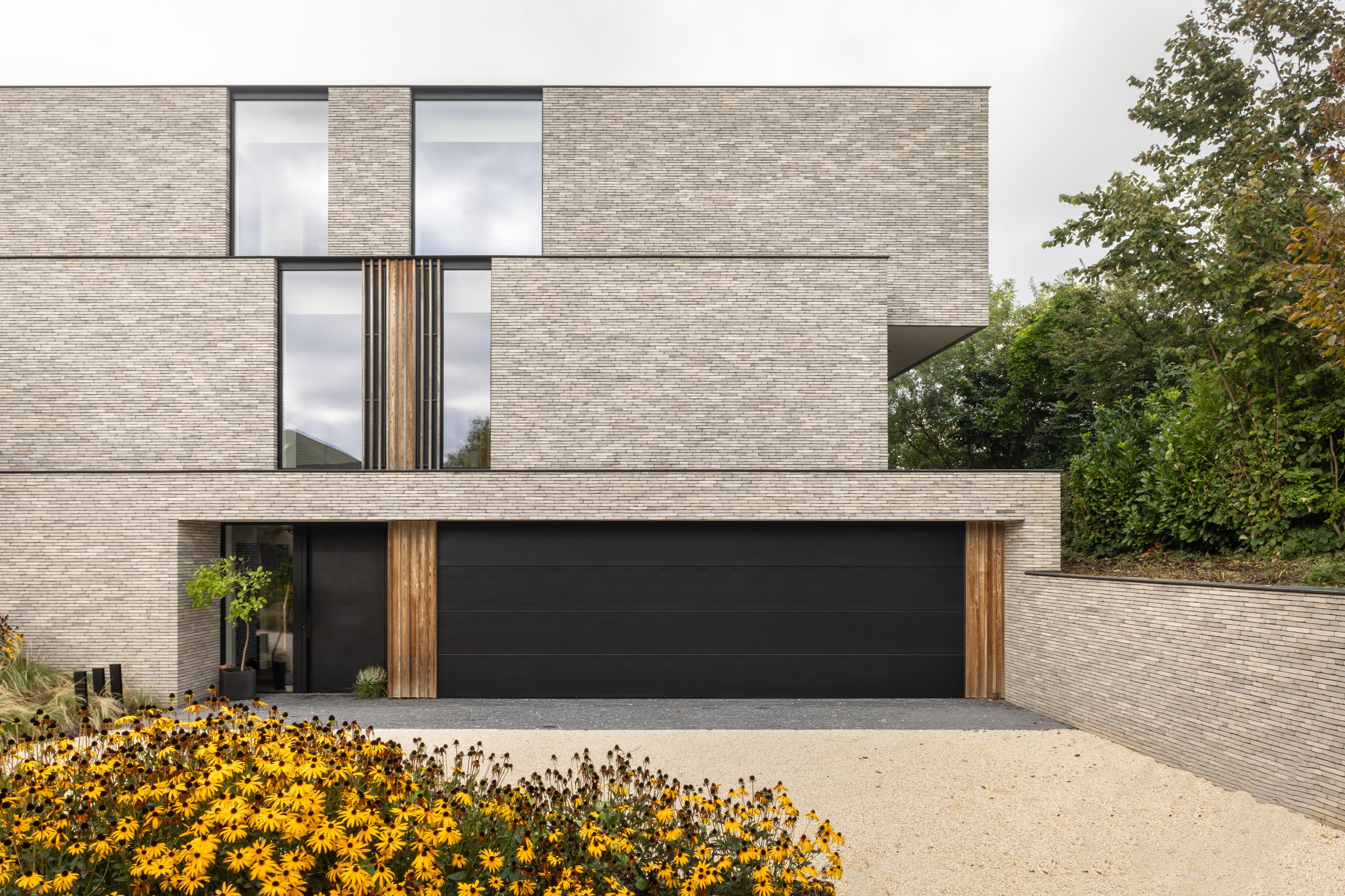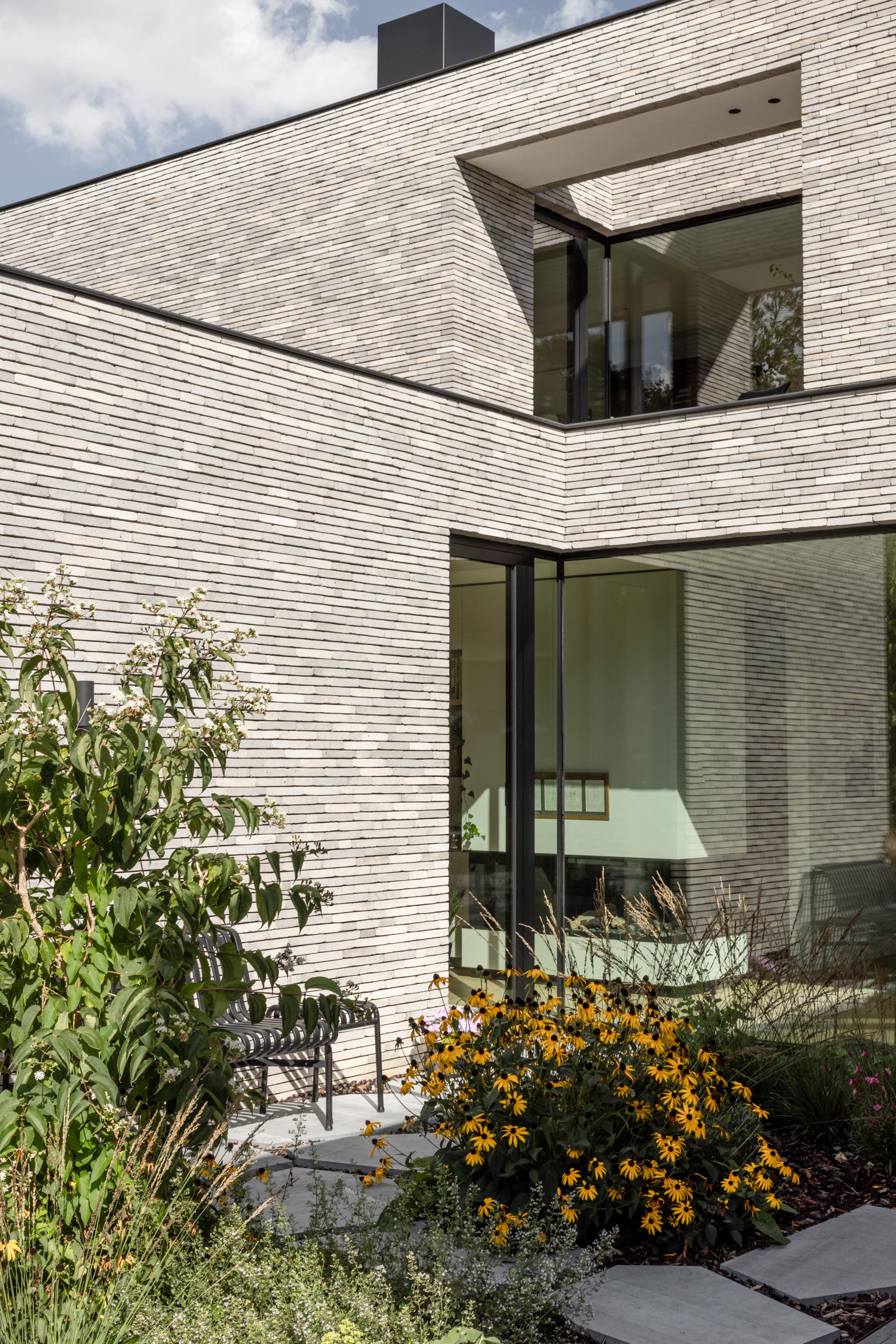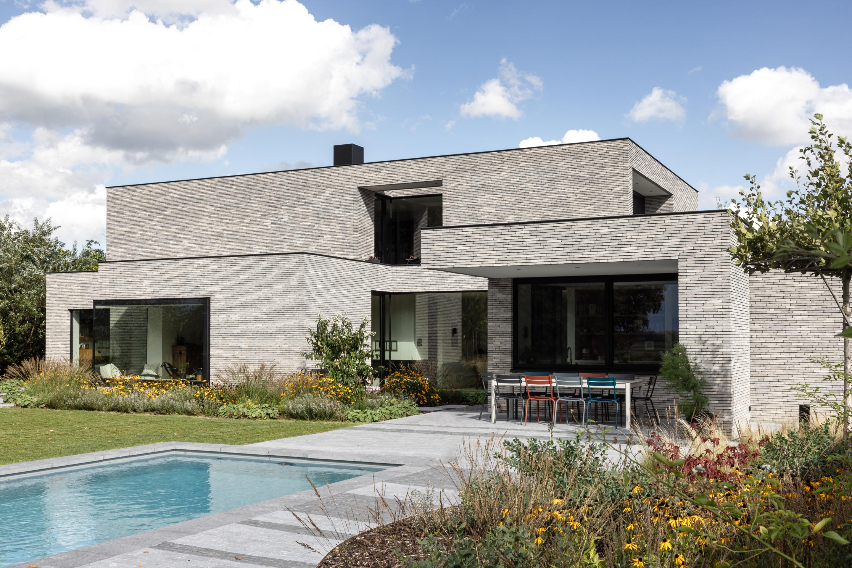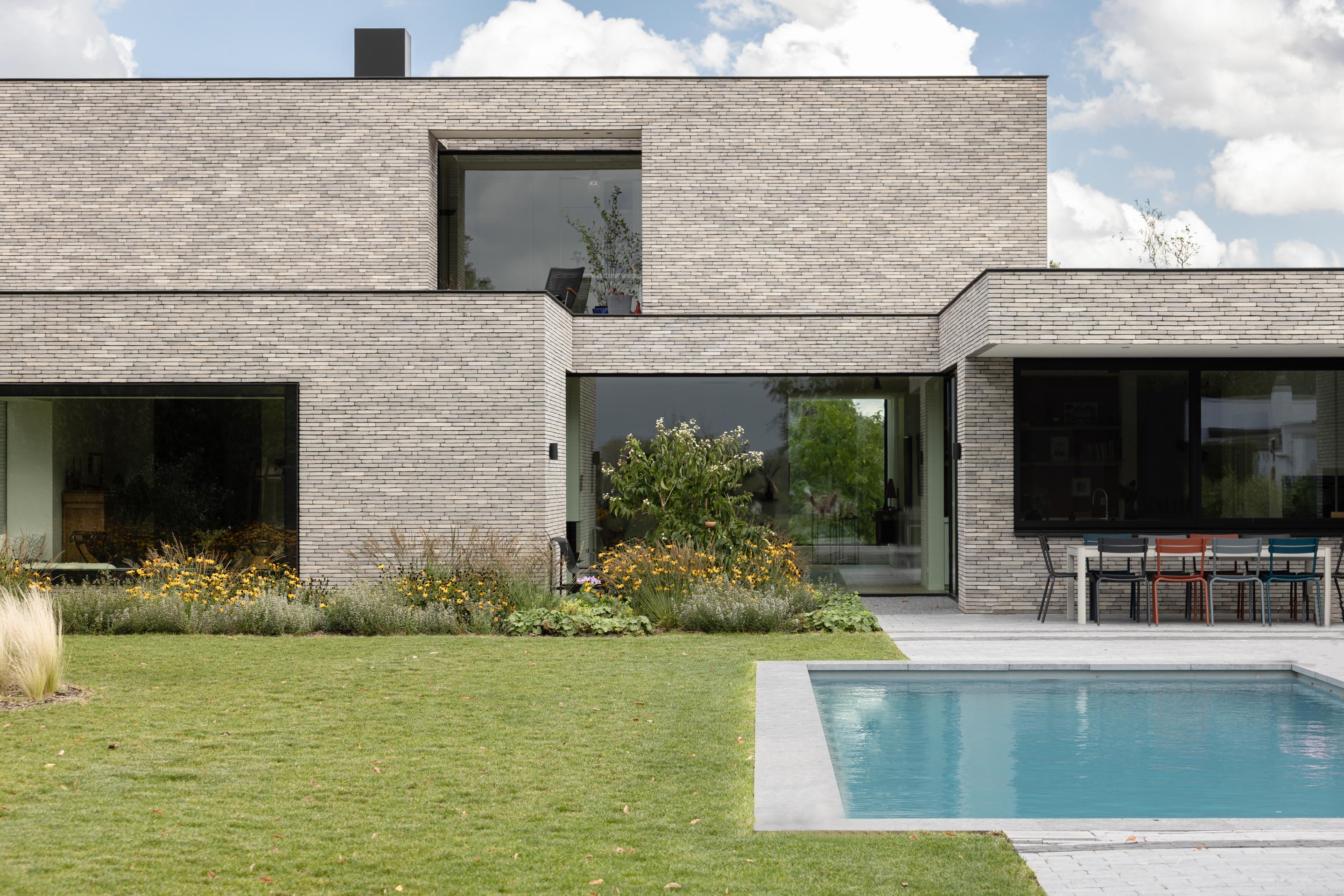 Lichtgrijze gevelsteen creëert een warme, uitnodigende uitstraling die contrasteert met de strakke geometrie