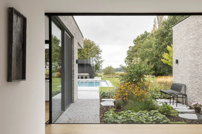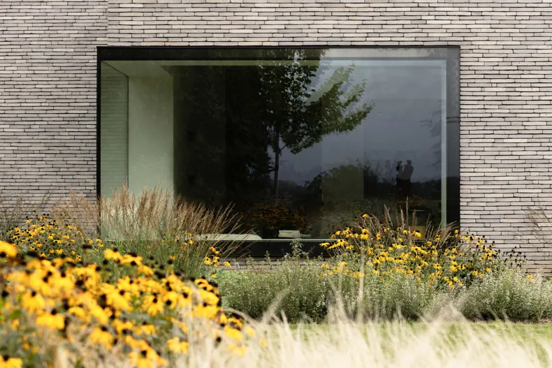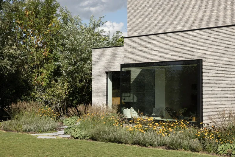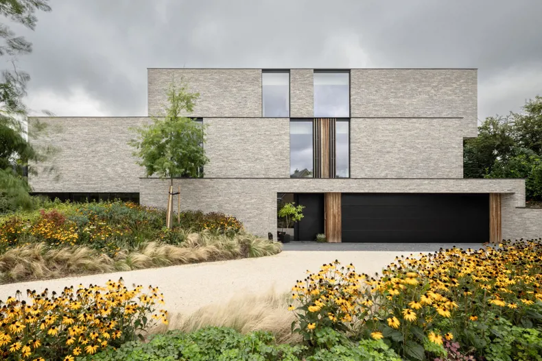 Voor de gevel koos de architect voor de lichtgrijze onbezande linea 7035, een steen die het project zijn unieke karakter geeft. De gevelstenen uit de linea reeks zijn perfect voor het accentueren van de strakke lijnvorming in decoratief metselwerk zoals deze woning. De warme grijze kleur met subtiele schakeringen en het langgerekte formaat van de steen sluiten naadloos aan bij de moderne vormentaal van de woning. Het horizontale ontwerp wordt extra benadrukt door de lijnvoering van de steen, terwijl de kleur een warme, uitnodigende uitstraling creëert die contrasteert met de strakke geometrie van de volumes.