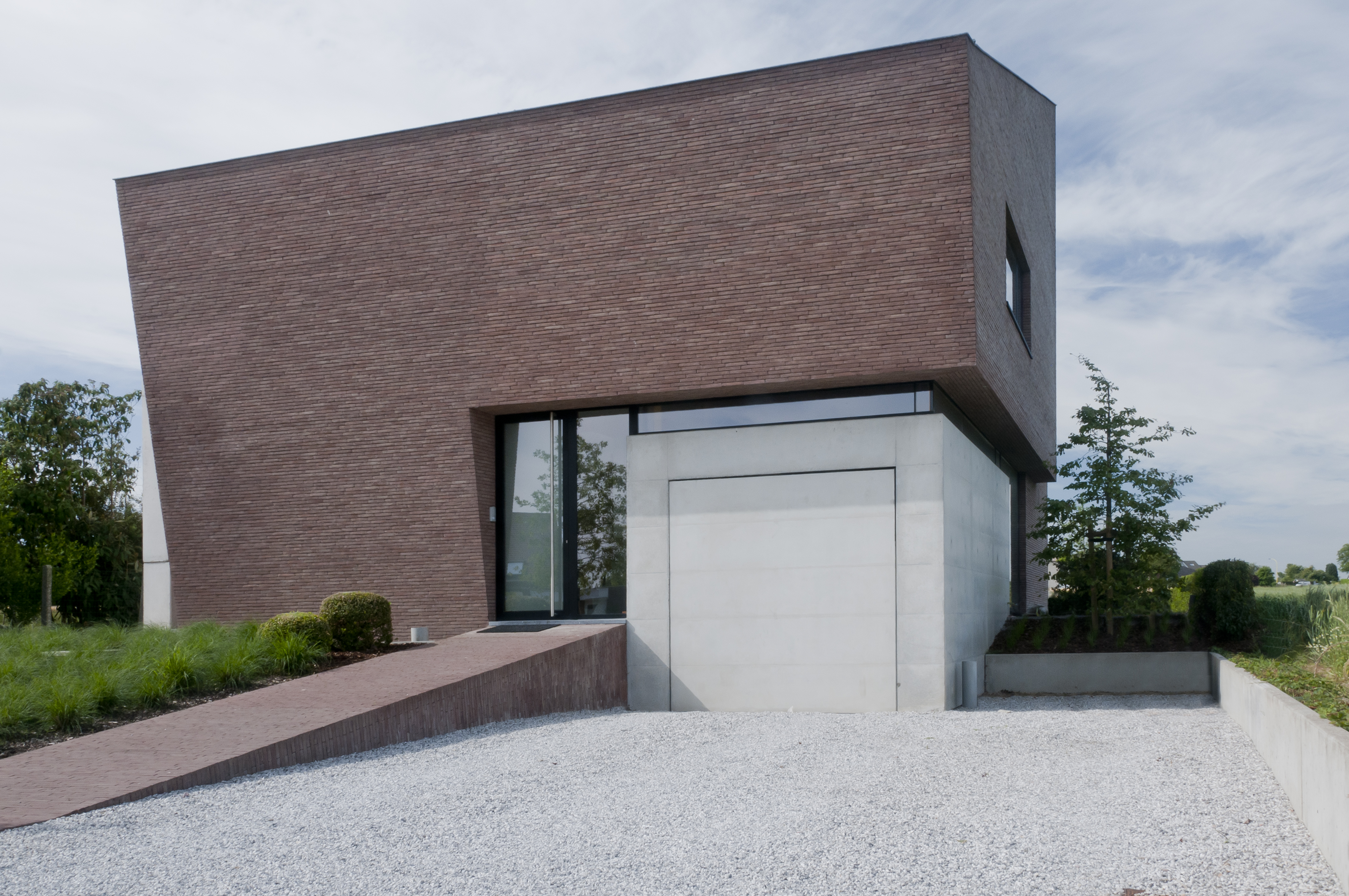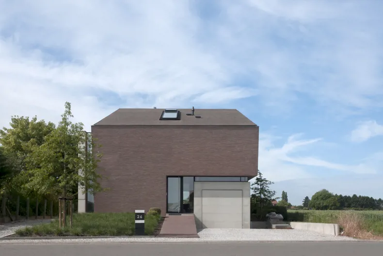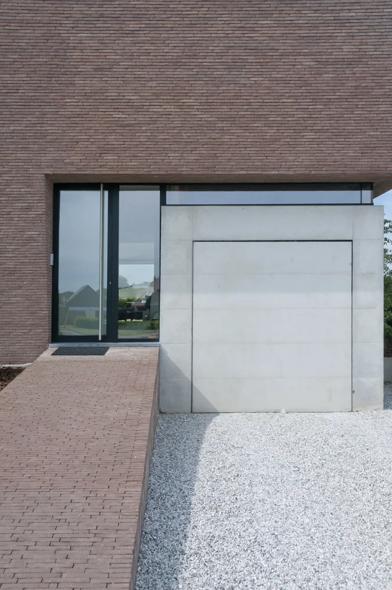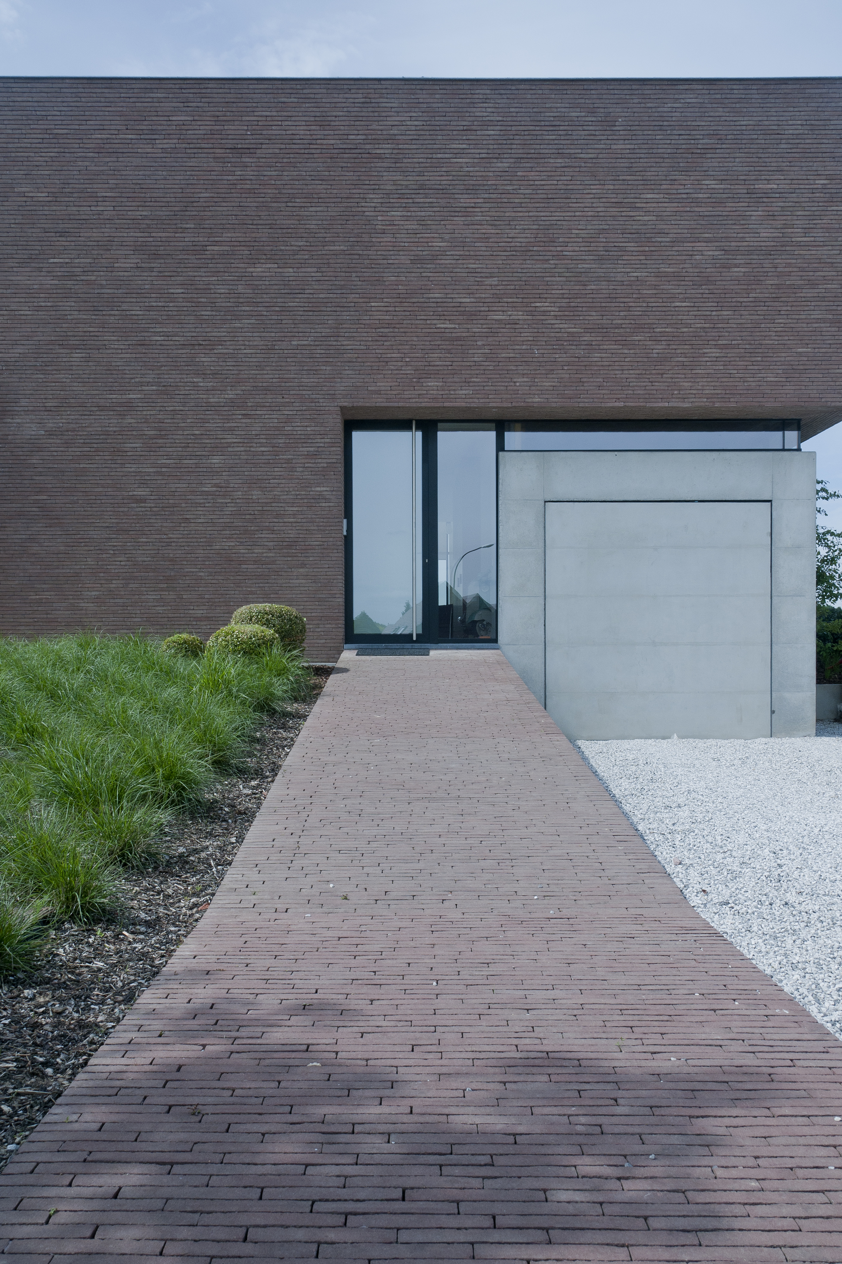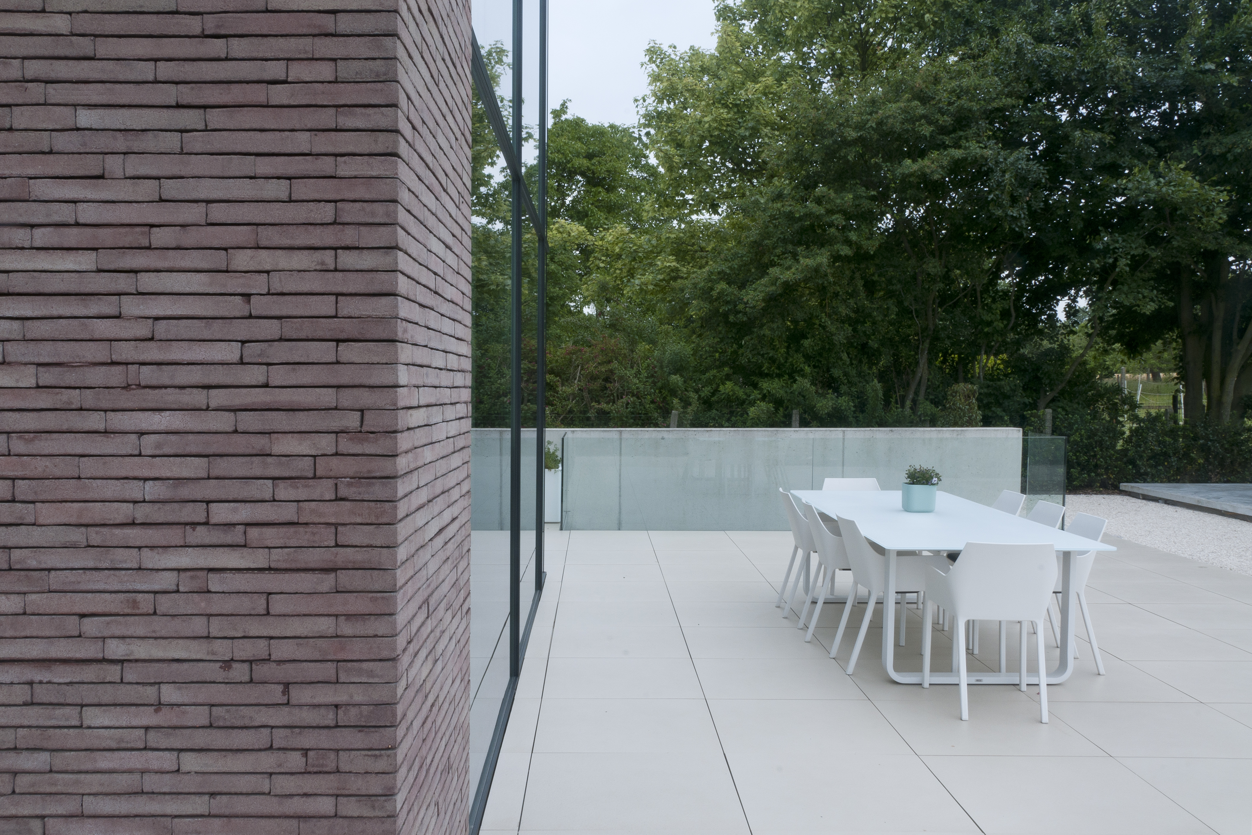 Gezien het mooie uitzicht achteraan de woning is er een groot raampartij voorzien dat niet alleen zorgt voor veel lichtinval maar ook voor een mooi zicht op de achterliggende weilanden. In de tuin trekt een pad uitgevoerd in paarse SeptimA kleiklinkers, met een identiek kleur als de gevelsteen, je als echte rode loper de uitgestrekte vlakte binnen.