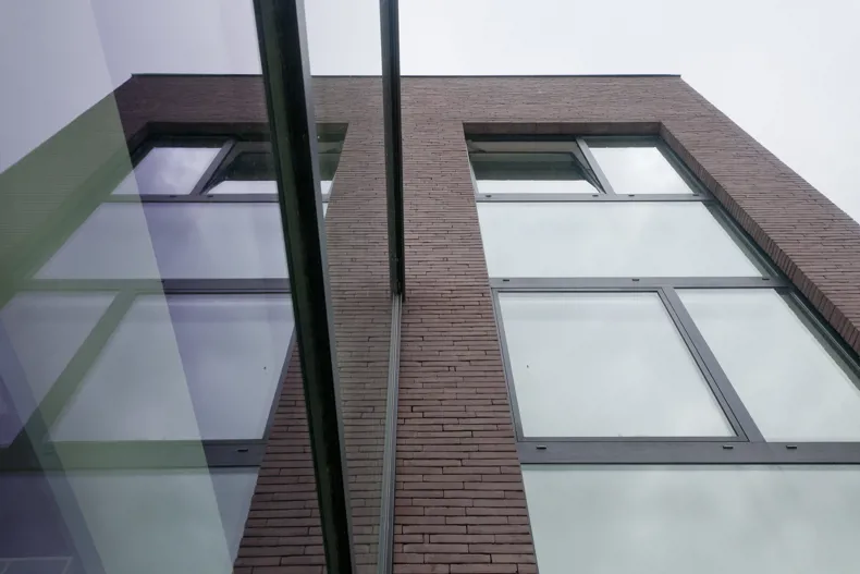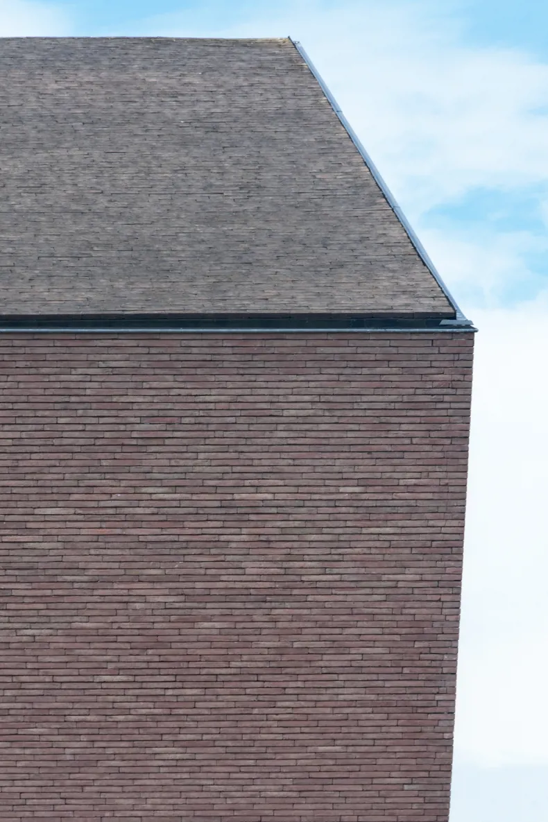 Op het dak zijn de gevelstenen dan weer plat verlijmd op de EPDM dichting die de betonplaat en dakisolatie bedekt. Door de bezanding aan de bovenzijde van de steen vormt het dak zo één geheel met de andere steenvolumes.