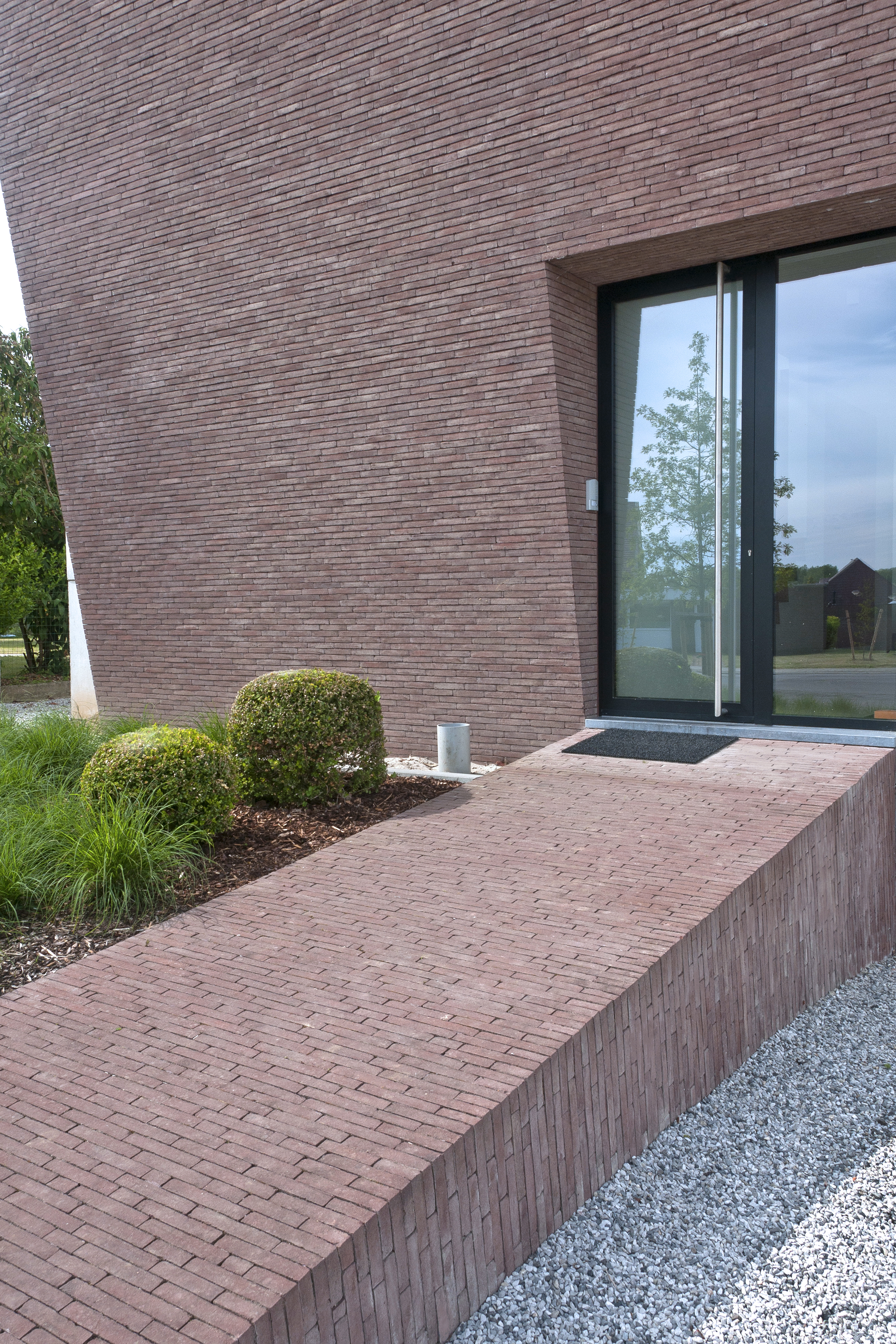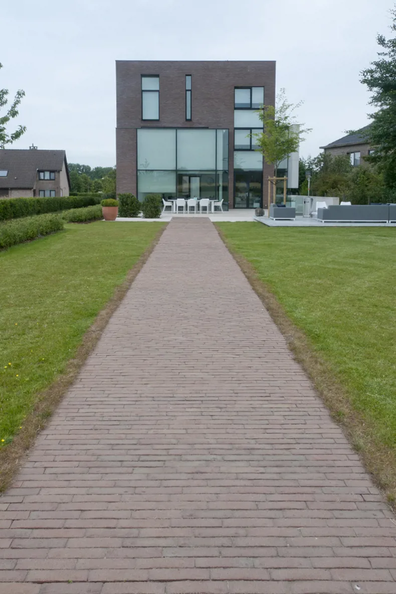 Ook voor de toplaag van het pad dat naar de voordeur loopt zijn dezelfde gevelstenen gebruikt. Voor deze toepassing zijn ze net als een kleiklinkers op hun kant gestabiliseerd in een zandbed. Om het geheel extra stevigheid te geven zijn ze ook nog eens tegen elkaar gelijmd.