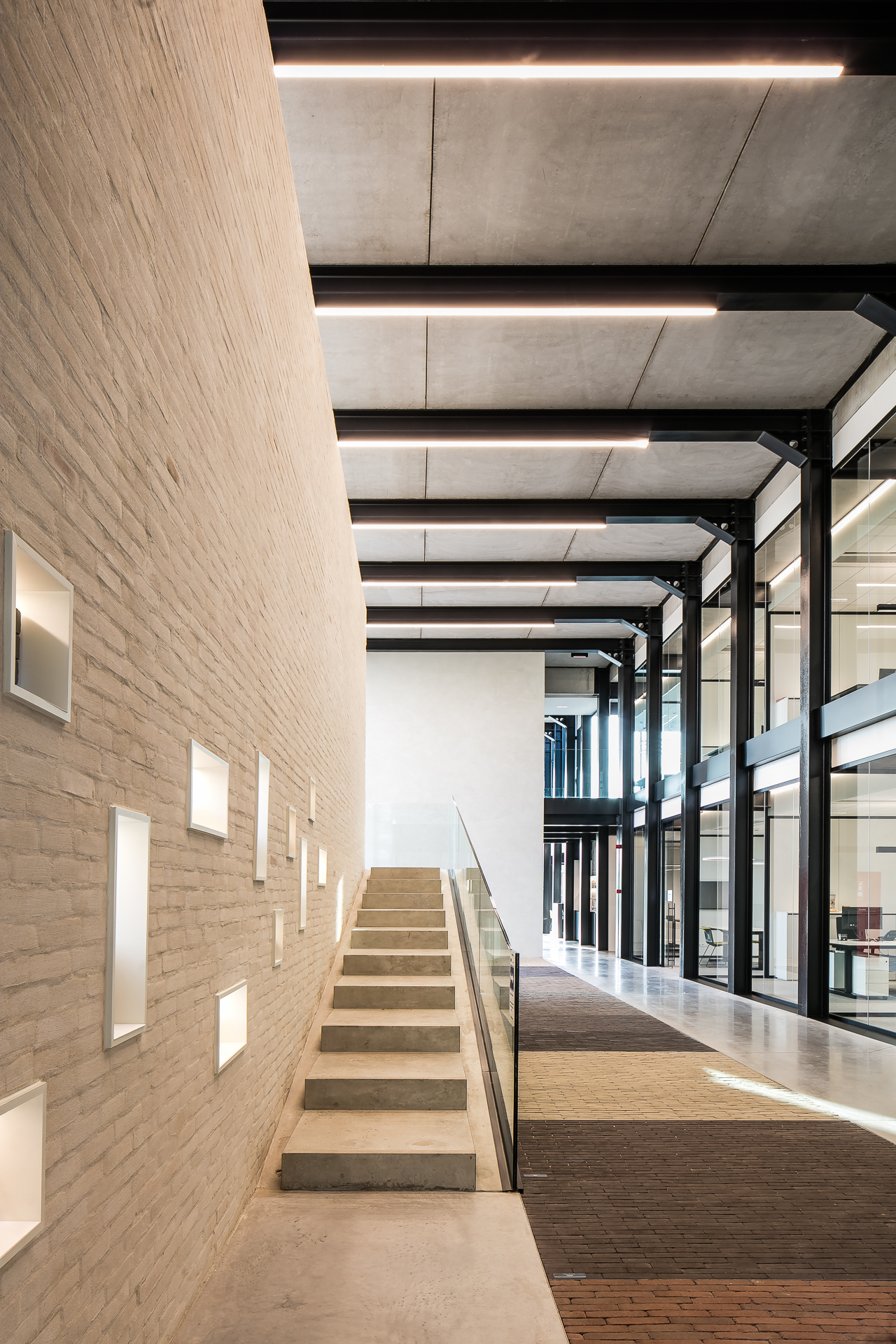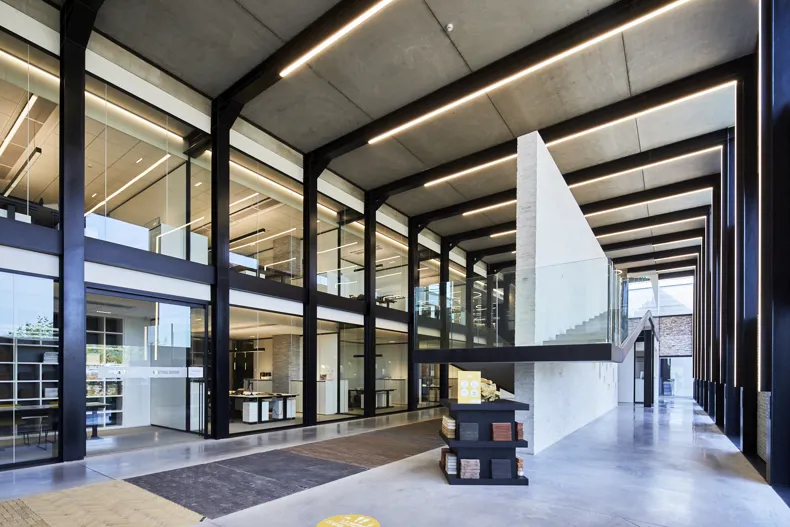Je betreedt het nieuwe gebouw via de incisie tussen de oude loodsen van de steenbakkerij en de nieuwe showroom, die als eyecatcher werkt en de identiteit van de gebruiker onmiddellijk prijsgeeft. Oud en nieuw worden gelinkt door een transparante schakel, waar de kantoren als ader fungeren binnen de steenbakkerij.