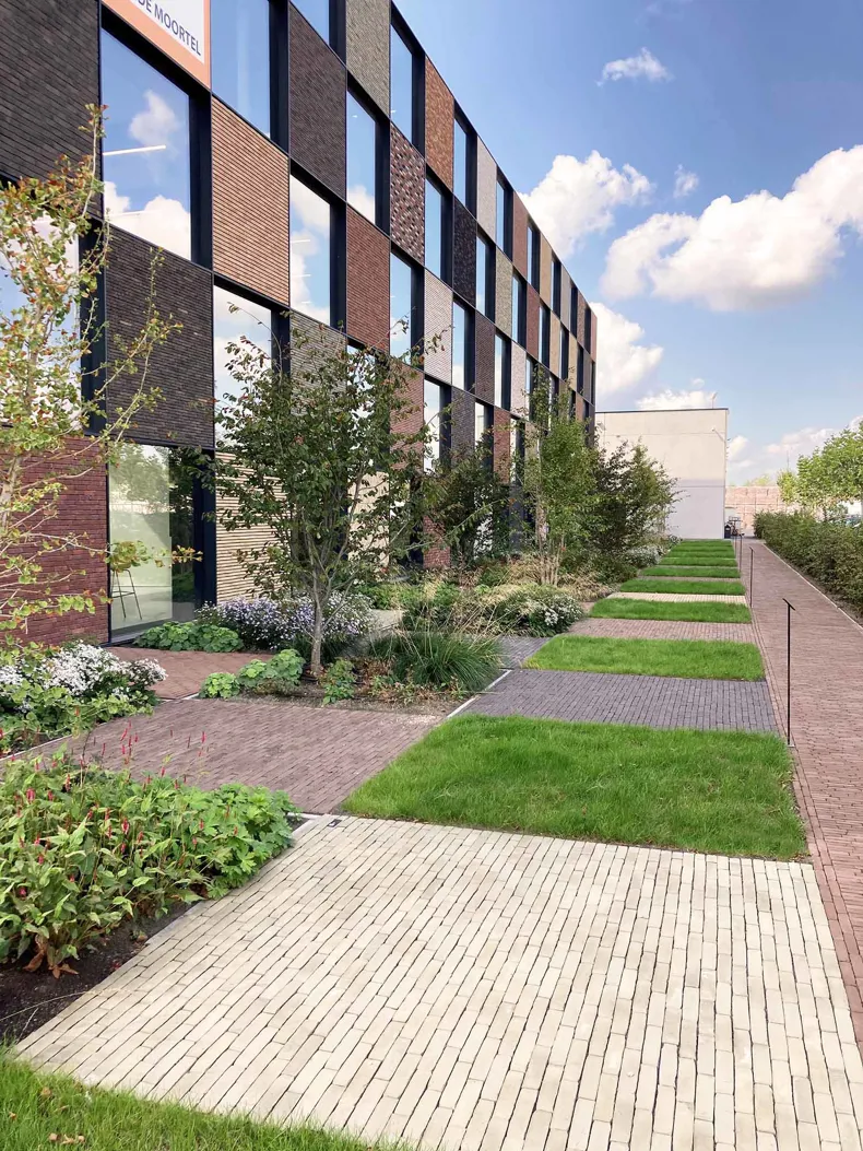 “Vanuit hun functie is dit soort bedrijfsterreinen vaak zeer kaal en onaantrekkelijk. Door veel bomen en ander groen te combineren met een natuurlijk bestratingsmateriaal zoals kleiklinkers hebben we er een aangenaam en rustig geheel van kunnen maken. We hebben zo bewust gekozen voor warme bruine en gele tinten. Deze gaan goed samen met de kleuren van de gekozen bomen en struiken, waardoor er een samenhangend geheel ontstaat. Zelfs de druk bereden centrale weg naar het stockterrein gaat op in het geheel. Dit heeft samen met de aandacht die we besteed hebben aan de in ltratie van hemelwater en het gebruik van circulair materiaal voor een op en top duurzaam resultaat gezorgd.” (tuinarchitect Martin Wirtz)