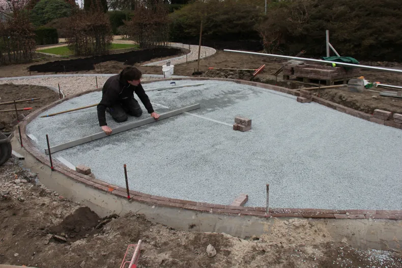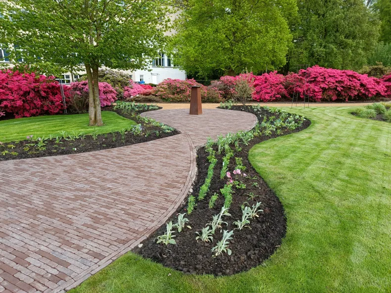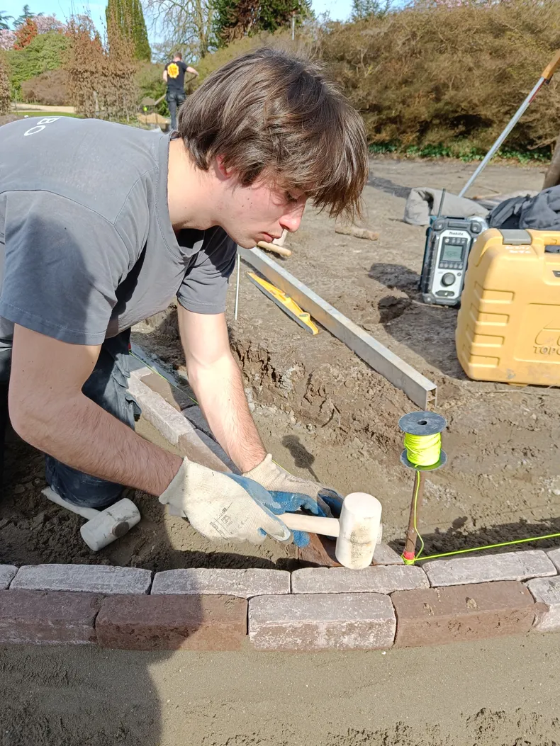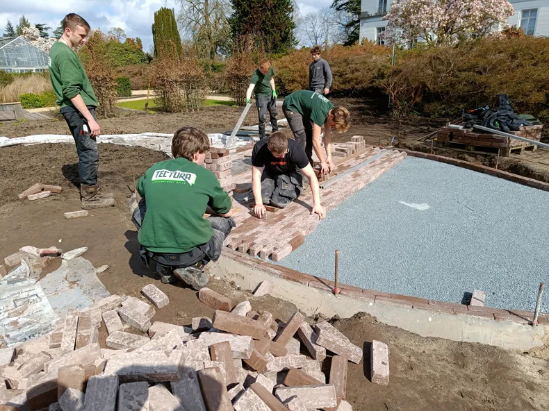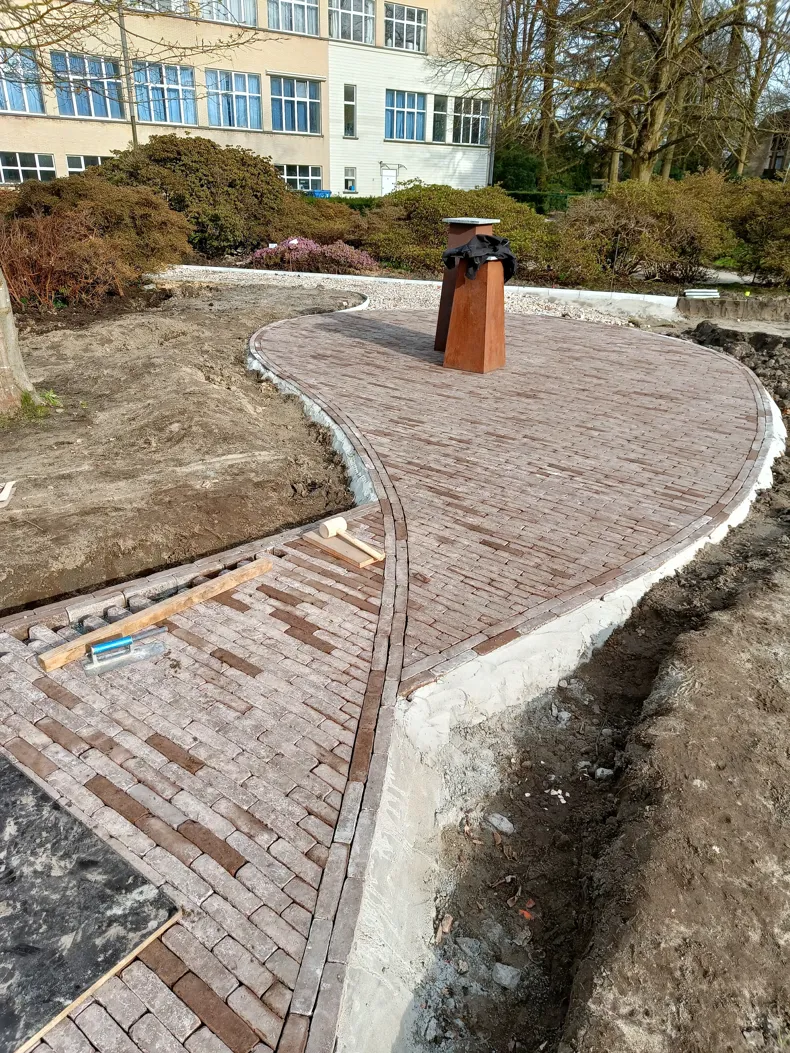 Voor de aanleg van de verharding met kleiklinkers is gekozen voor een speels en vloeiend ontwerp, dat een mooi contrast vormt met de strakke lijnen van de aangrenzende Droomtuin. Dit ontwerp versterkt de esthetische aantrekkingskracht van de tuin en creëert een uitnodigende sfeer.