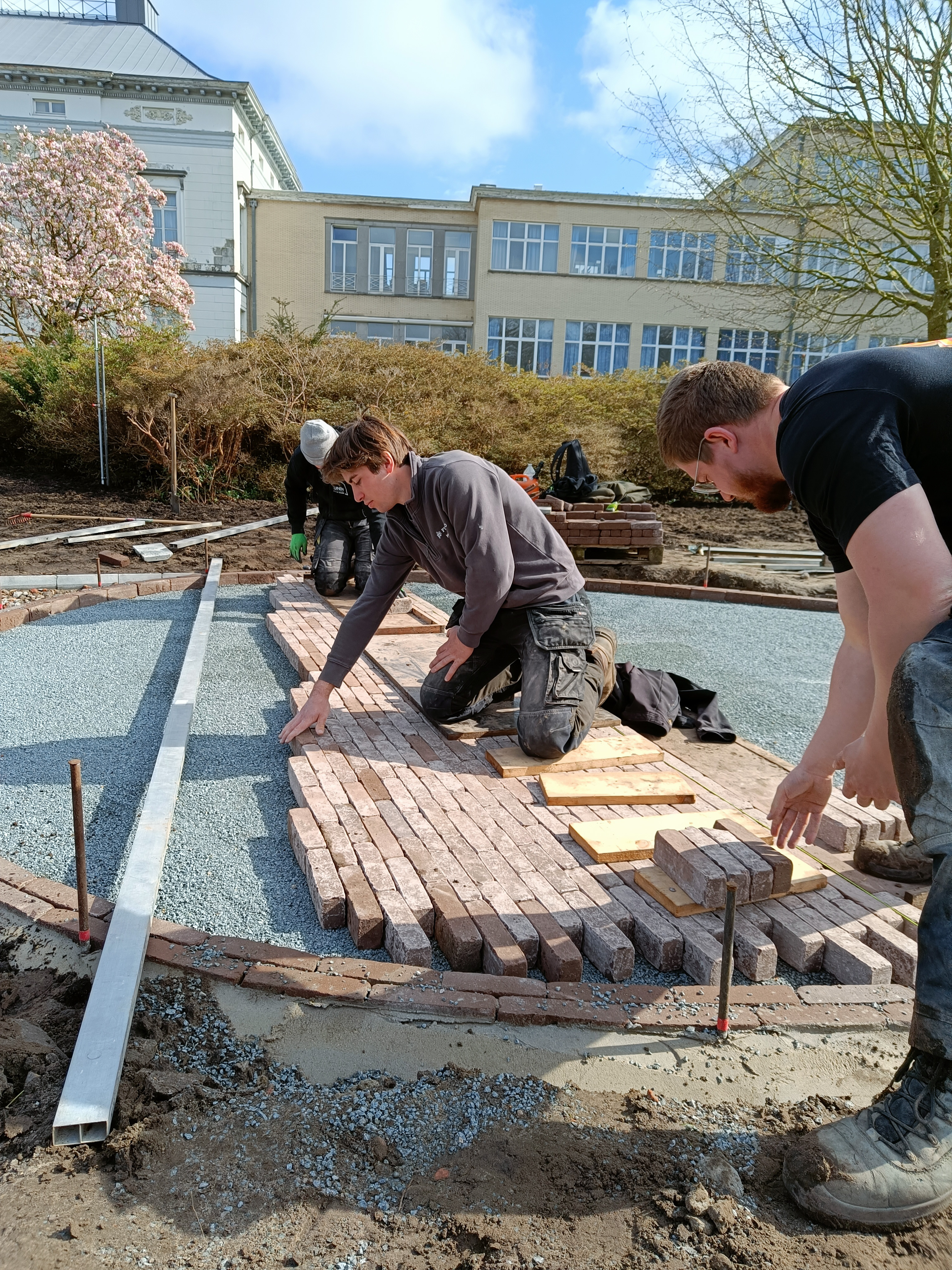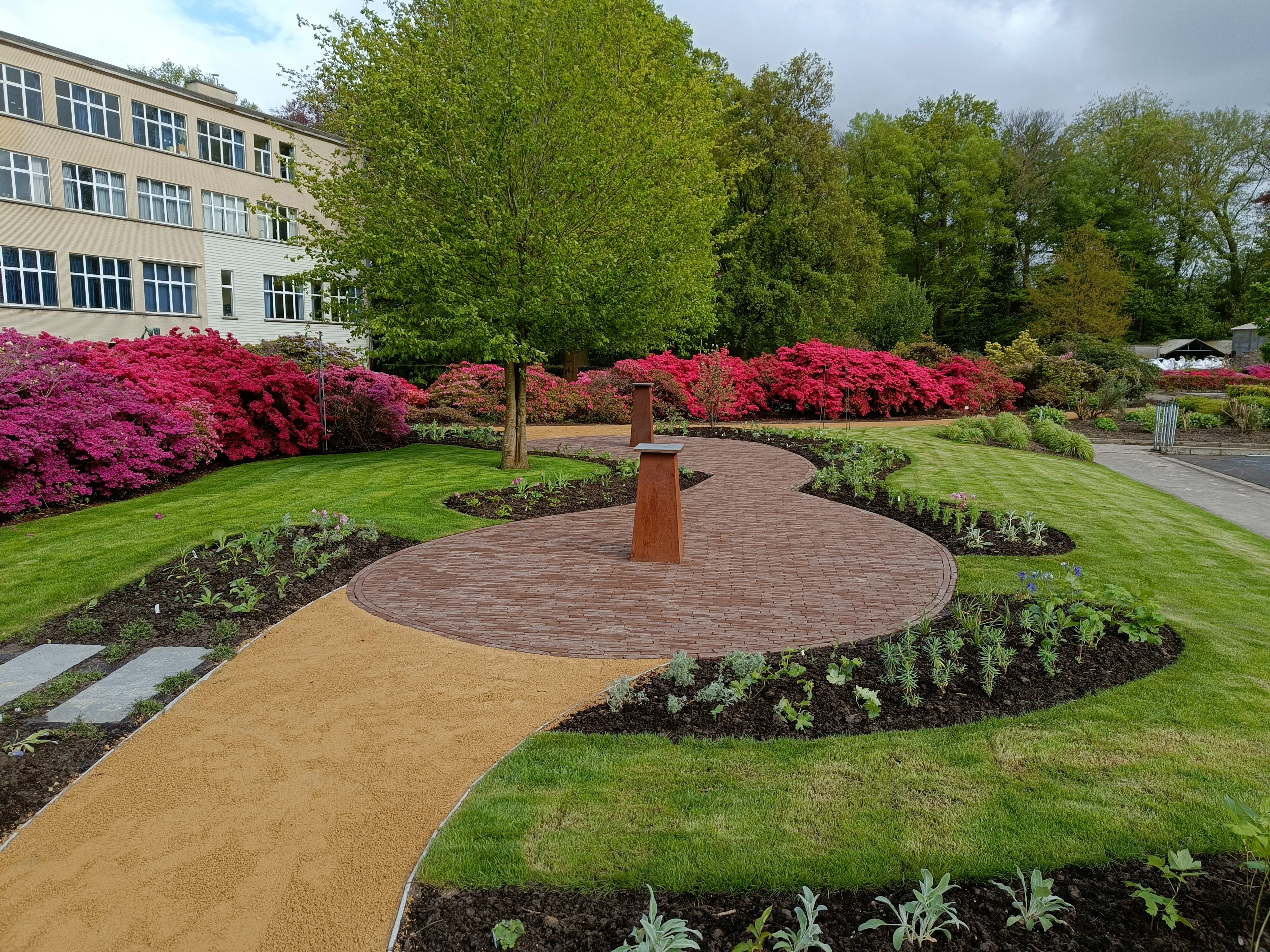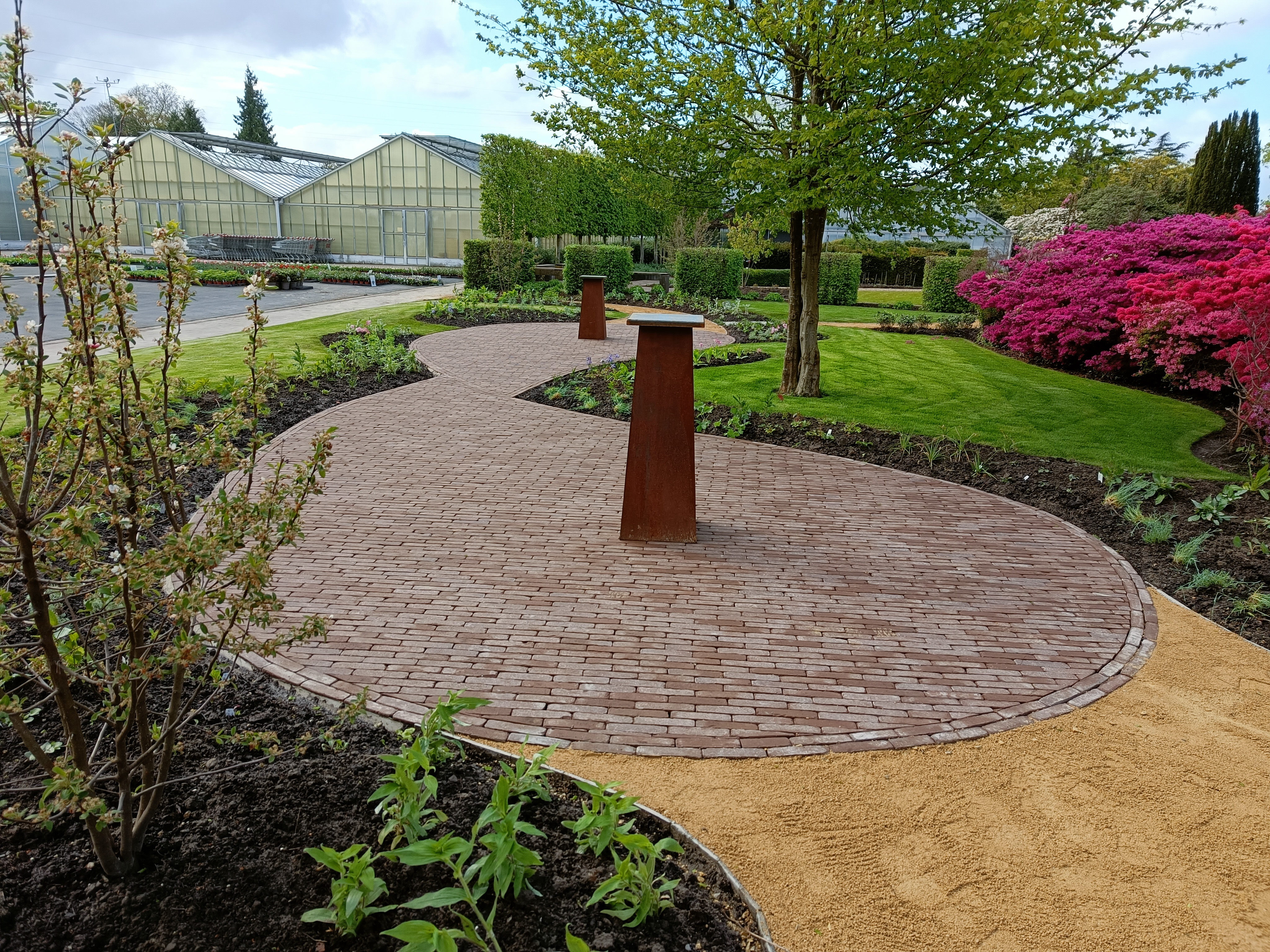 Voor de aanleg van de verharding met kleiklinkers is gekozen voor een speels en vloeiend ontwerp, dat een mooi contrast vormt met de strakke lijnen van de aangrenzende Droomtuin. Dit ontwerp versterkt de esthetische aantrekkingskracht van de tuin en creëert een uitnodigende sfeer.