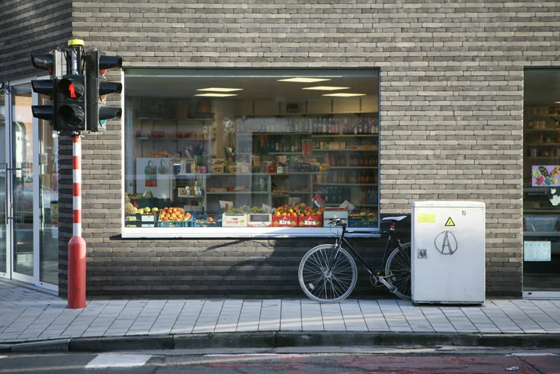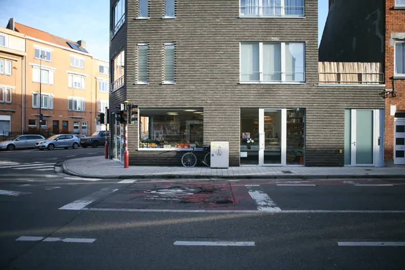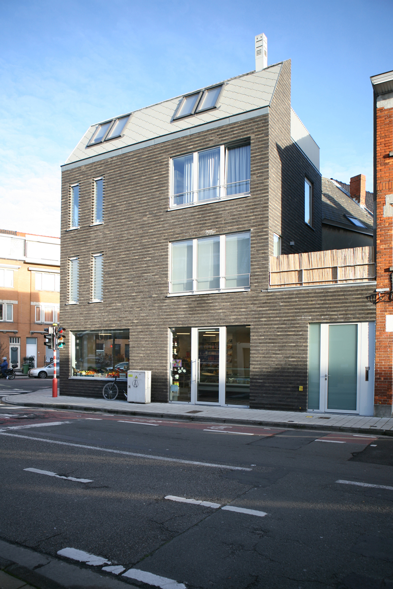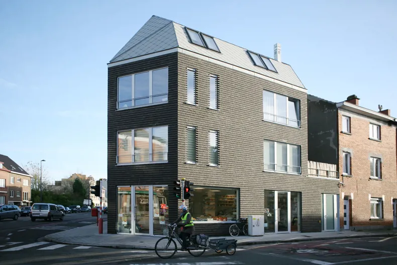 In het nieuwe hoekgebouw bevinden zich een kruidenierswinkel, een appartement met één kamer op de 1ste verdieping en een duplex appartement met twee kamers. Bovendien beschikt elk appartement over een klein terras.