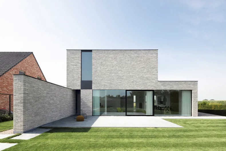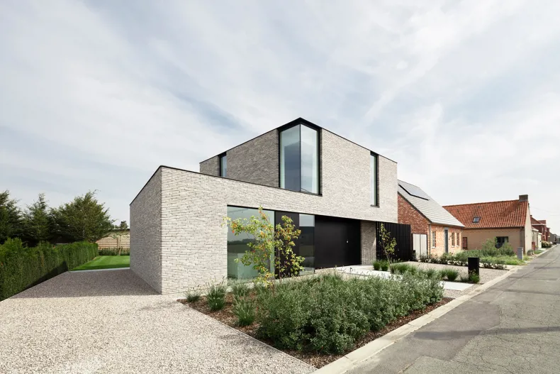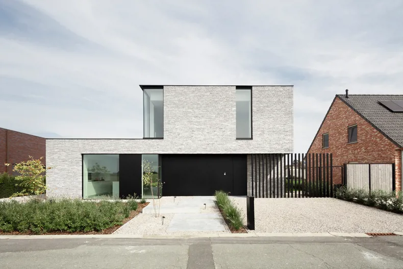 De verwerking met dunbedmortel benadrukt dit effect nog meer omdat op die manier het karakter, de kleur en textuur van de steen volop primeert ten opzichte van de voeg. De zachte, subtiele nuances en de natuurlijke uitstraling, bekomen door het Hand-Made productieproces, zorgen voor een interessante dynamiek. Binnen de landelijke omgeving en diversiteit in de straat is de villa een echte eye-catcher geworden dankzij de uitgepuurde keuzes binnen het materiaalconcept.