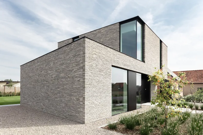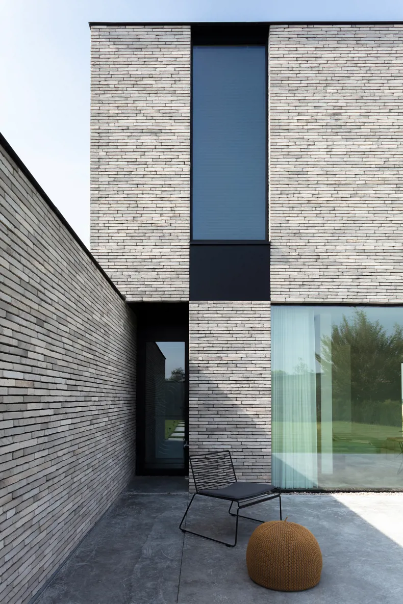 De gedetailleerde uitwerking van de gevelbekleding met de Hand-Made linea 7035 zorgt voor voelbare contouren in het architecturaal volume. Waar de zwarte aluminium gevelafwerking een zekere perfectie toont, zorgt de gevelsteen met zijn unieke en uitgesproken vorm voor het gewenste contrast. Een perfect match in materialisatie!