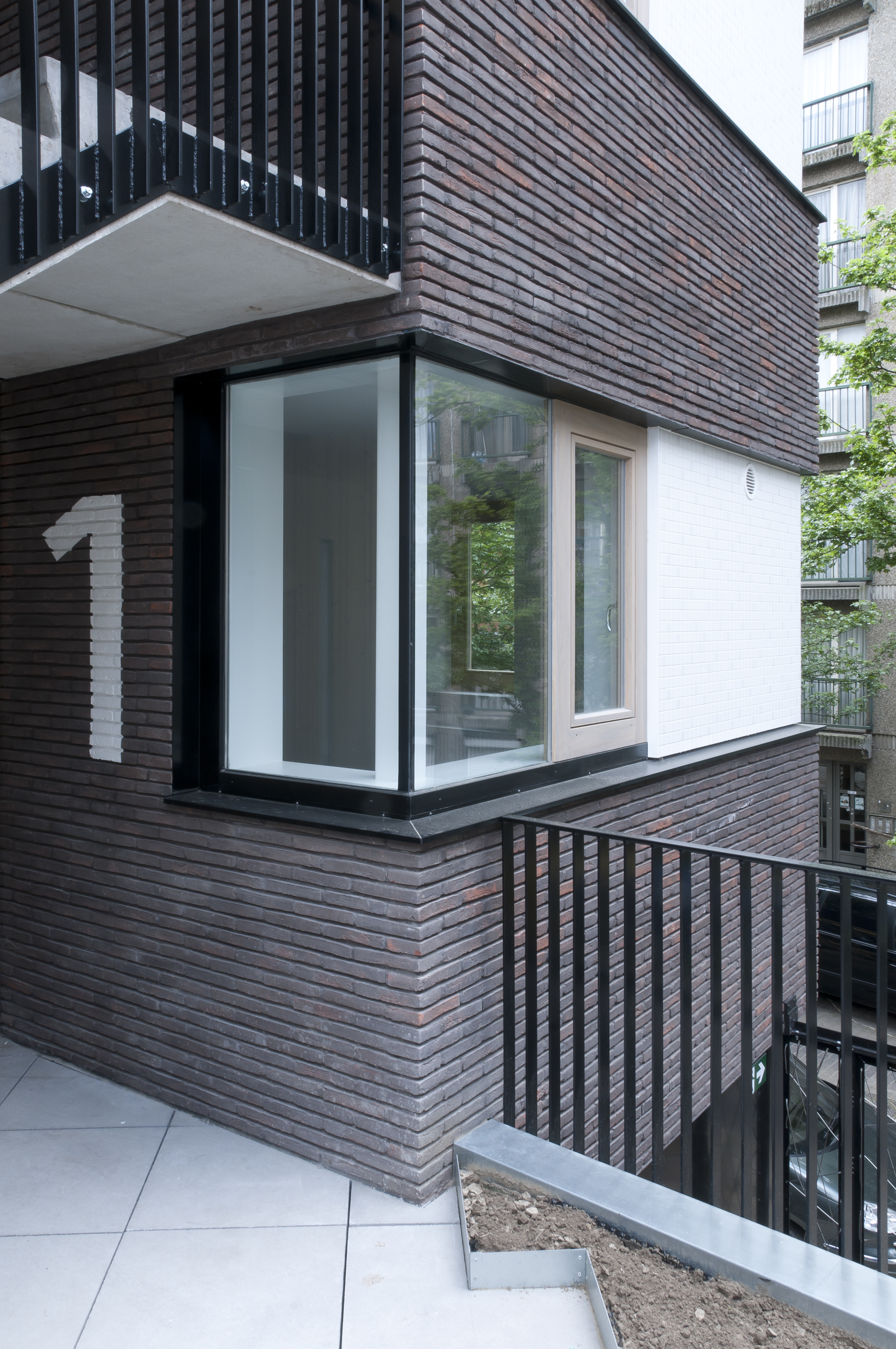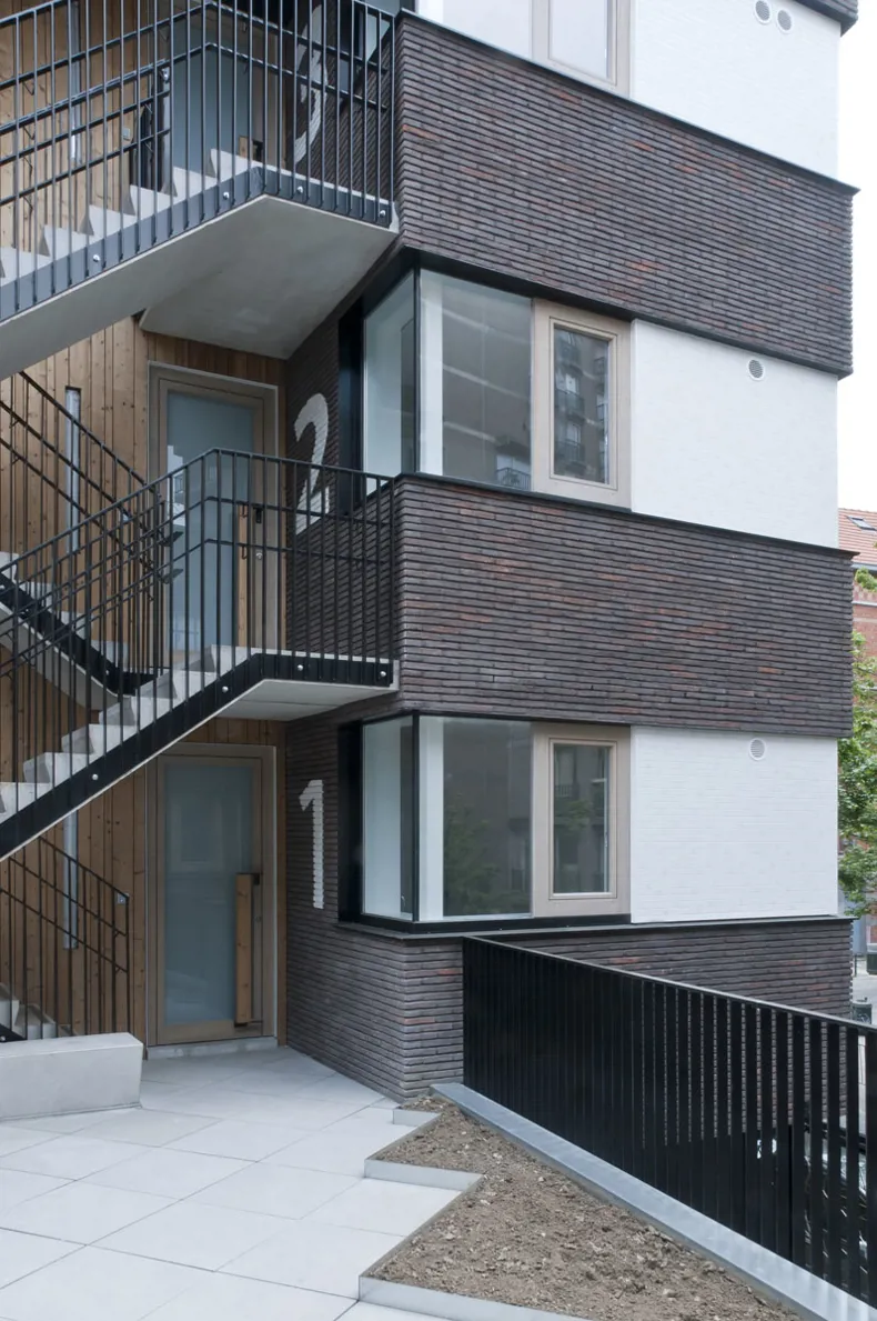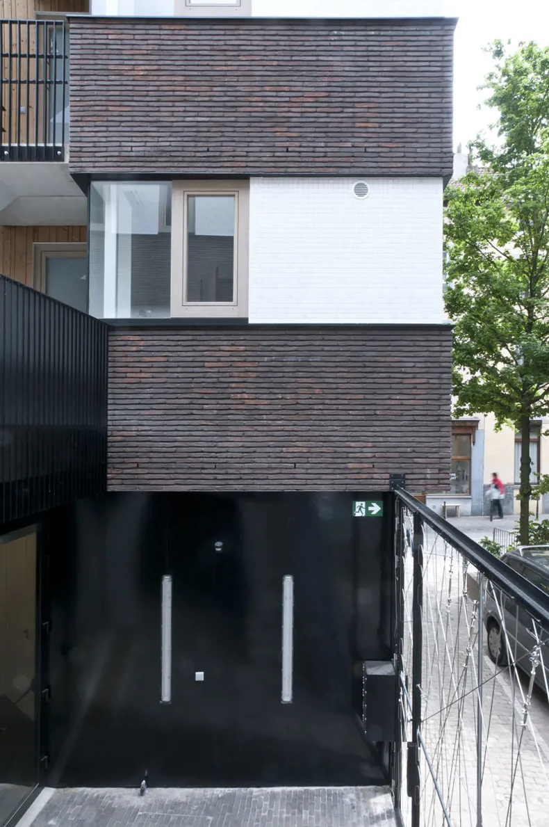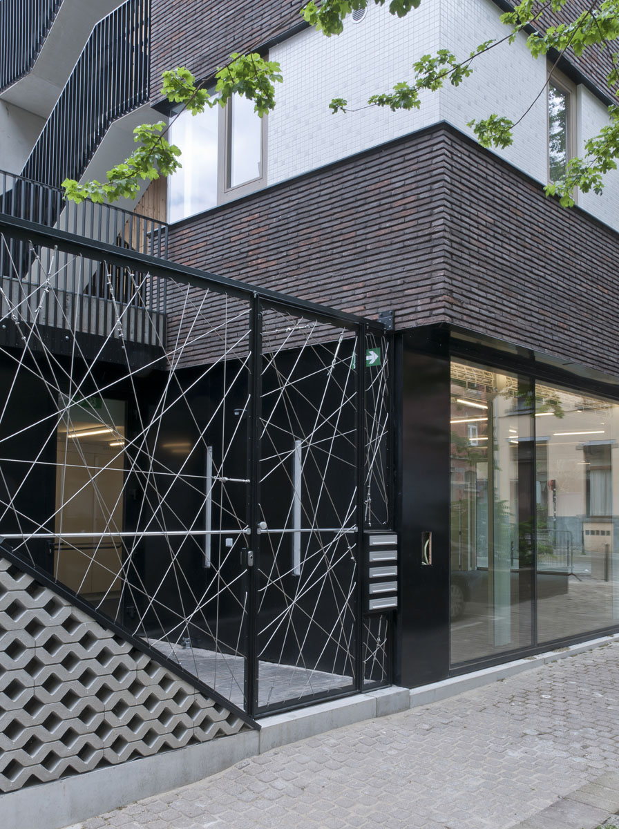 Het bouwblok werd opengebroken in een hoog en een laag volume, meer op mensenmaat. Door een tuin in het midden te voorzien, kan licht tot diep in beide volumes vallen. Een semipubliek groen terras voor een babbeltje met een medebewoner of met een passant op straat. Het appartement van het lage deel kreeg een privétoegang via deze tuin. De appartementen van het hoge deel bereik je via een buitentrap. Deze keuze zorgt ervoor dat er vrijer kon omgesprongen worden met de reglementering omtrent brandveiligheid. De typische donkere trappenkoker ingeruild voor een ruimtelijk gebaar.