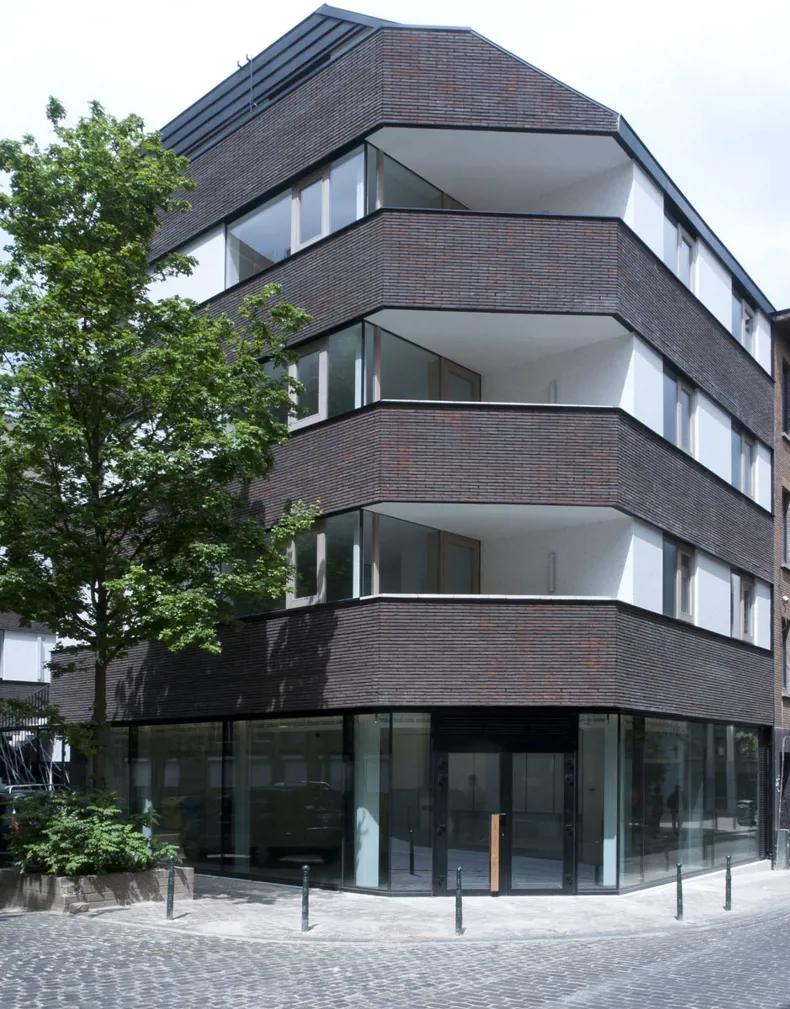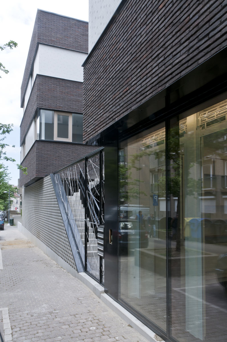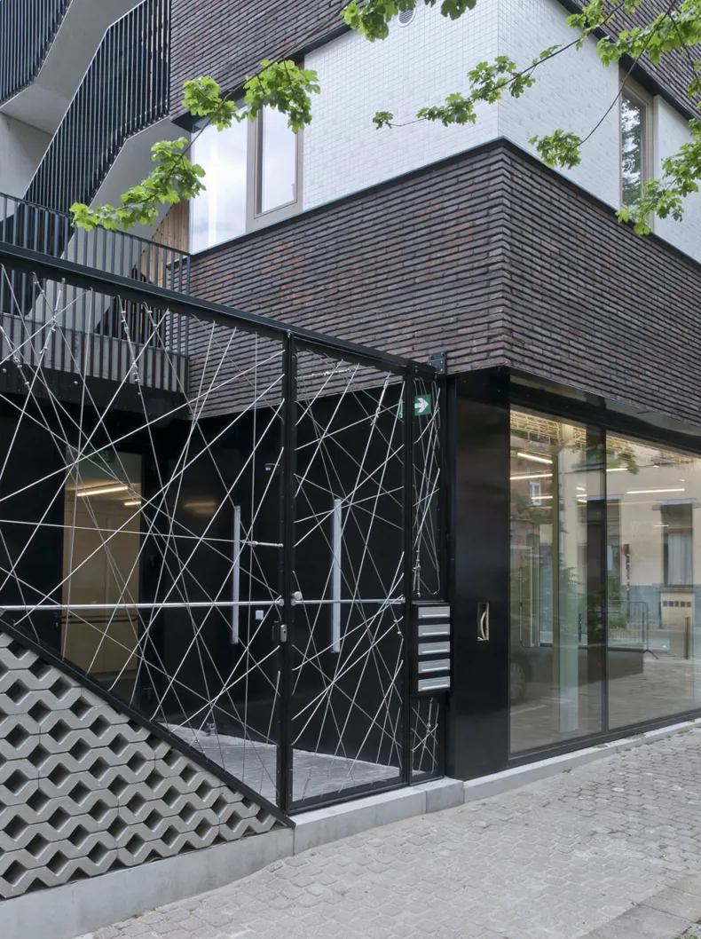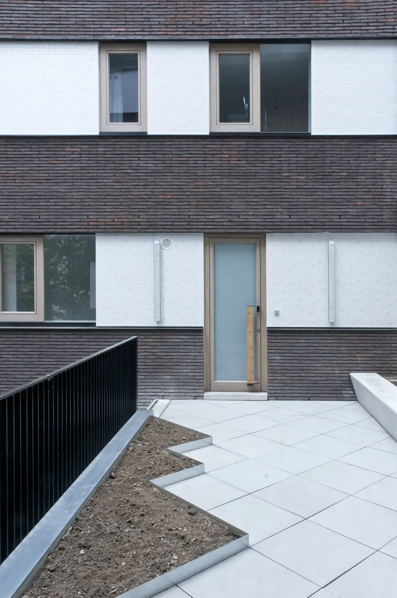Het bouwblok werd opengebroken in een hoog en een laag volume, meer op mensenmaat. Door een tuin in het midden te voorzien, kan licht tot diep in beide volumes vallen. Een semipubliek groen terras voor een babbeltje met een medebewoner of met een passant op straat. Het appartement van het lage deel kreeg een privétoegang via deze tuin. De appartementen van het hoge deel bereik je via een buitentrap. Deze keuze zorgt ervoor dat er vrijer kon omgesprongen worden met de reglementering omtrent brandveiligheid. De typische donkere trappenkoker ingeruild voor een ruimtelijk gebaar.
