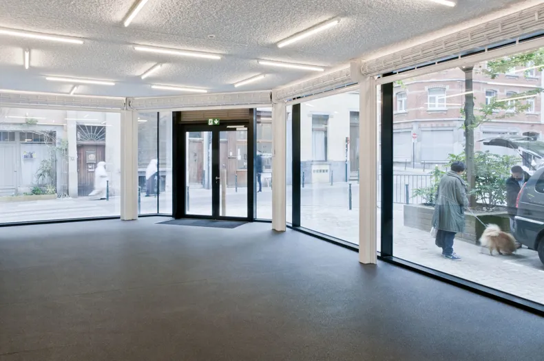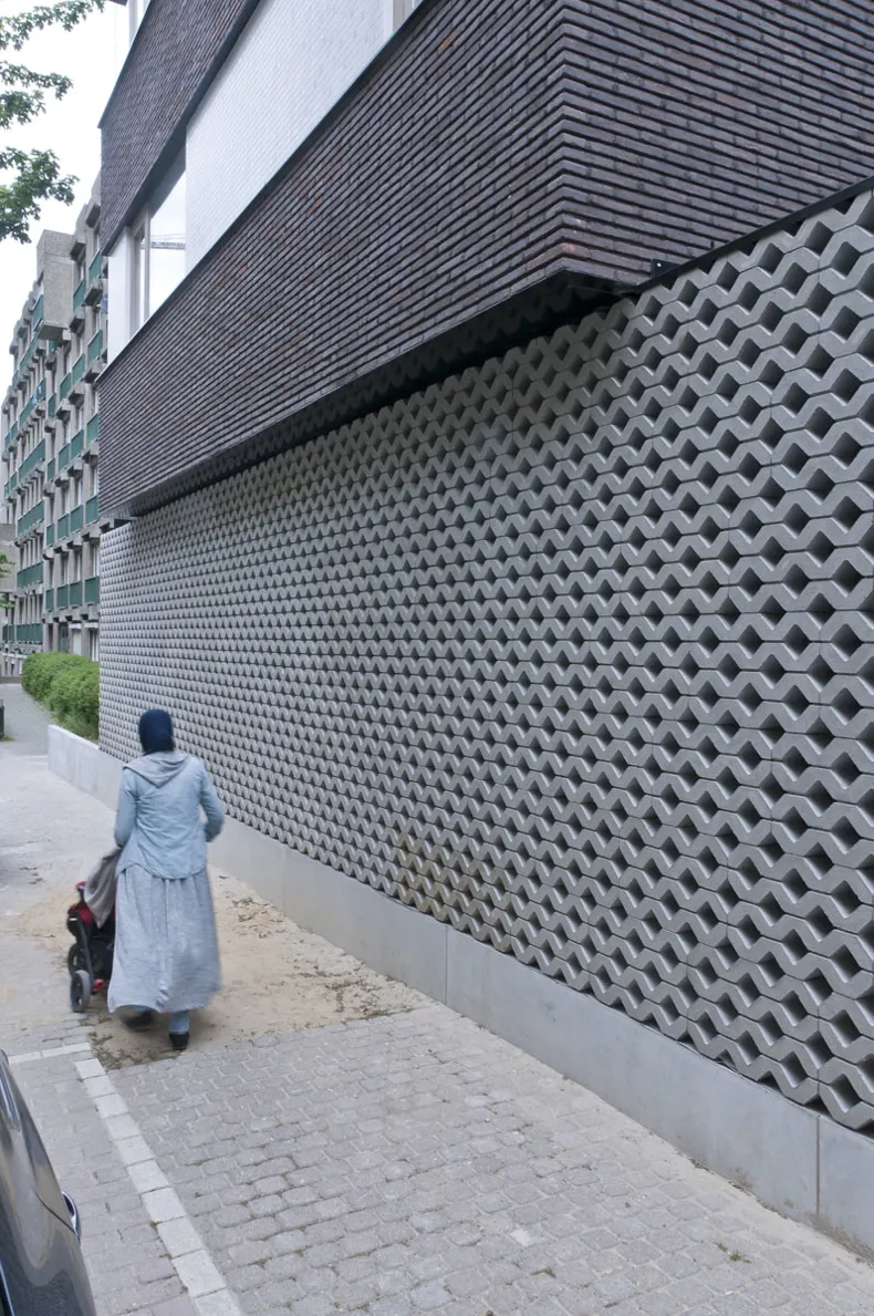 Een massieve sokkel geeft een deeltje van het perceel terug aan de buurtbewoners. Een volledig beglaasd verenigingslokaal lonkt uitnodigend op de hoek, ter bevordering van de sociale verwevenheid met een zekere sociale controle als surplus. Om de hoek zitten technische lokalen voor containers en tellers verscholen achter grasdallen. Massief beton zou hier niet de nodige ventilatie bieden. De grasdallen dienen als drager voor een project waar kinderen elk hun eigen kleurtje kunnen geven aan een gepixeld patroon.