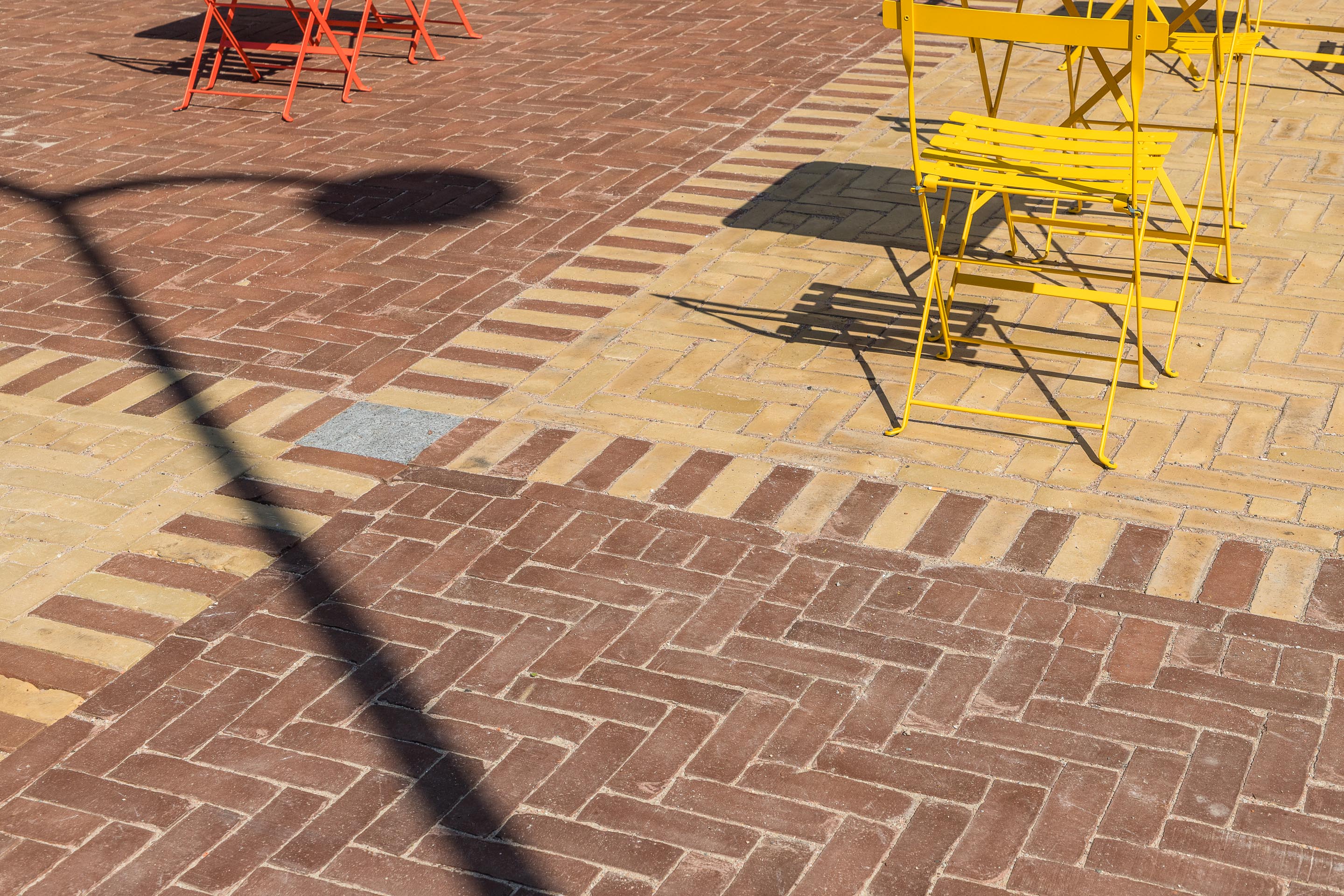 Wat meteen in het oog springt als je het plein benadert is de unieke bestrating. Er werd gekozen voor de straatbakstenen SeptimA DF Amarant en Vanille, verwerkt in een origineel dambordpatroon en geplaatst in elleboogverband. “De grootste ontwerpuitdaging was om er één plein van te maken en niet iedere zone een andere kleur of verband te geven”, benadrukt Simon Sprietsma. Dat is met deze keuzes en uitvoering goed gelukt. Het kleurrijke tapijt zorgt voor een vriendelijk en speels karakter, precies zoals het ontwerp beoogde. De levendige kleur en onbezande textuur van deze klinkers geven het plein niet alleen een warme uitstraling, maar zorgen ook voor een blijvend verzorgde look, zelfs bij intensief gebruik.