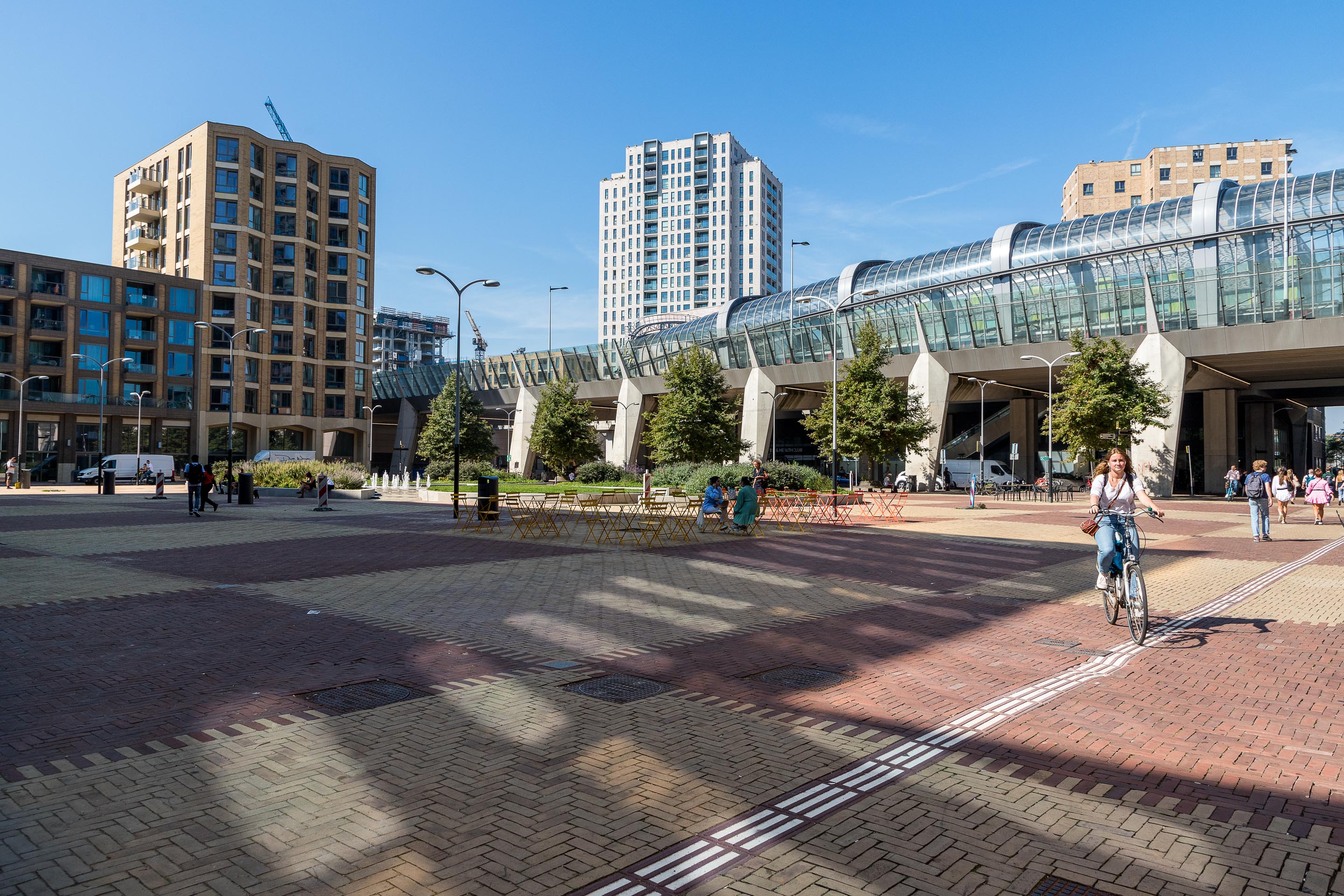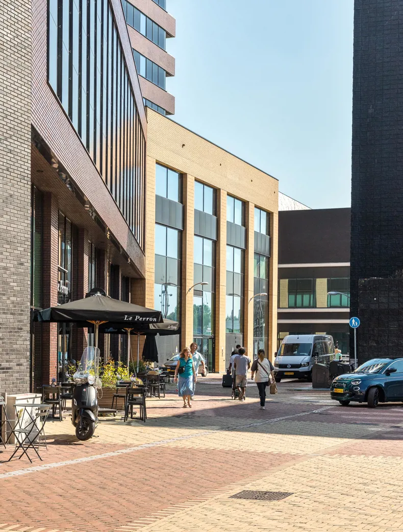 Het centrale deel van het plein is ingericht met groenvakken in ellipsvormige patronen, voorzien van zitranden in natuursteen en een fontein, die samen een organisch lijnenspel vormen. Rondom het plein vinden we horecazaken, een supermarkt en een ruime fietsenstalling. Onder het viaduct is ruimte voor taxi’s en kort parkeren, waarmee functionaliteit hand in hand gaat met esthetiek.