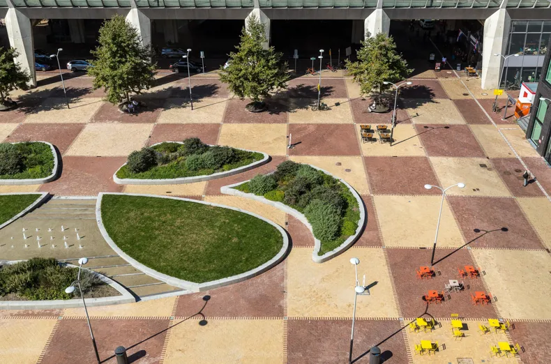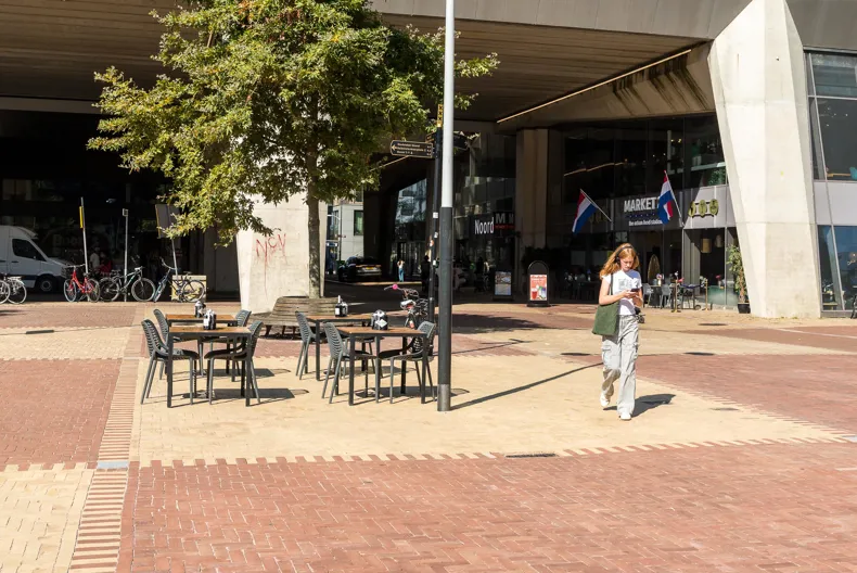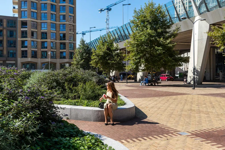 De beplanting – met name de platanen en vaste plantenborders ontworpen door groenexpert Climmy Schneider – draagt bij aan een groen, stedelijk oasegevoel in een druk vervoersknooppunt.