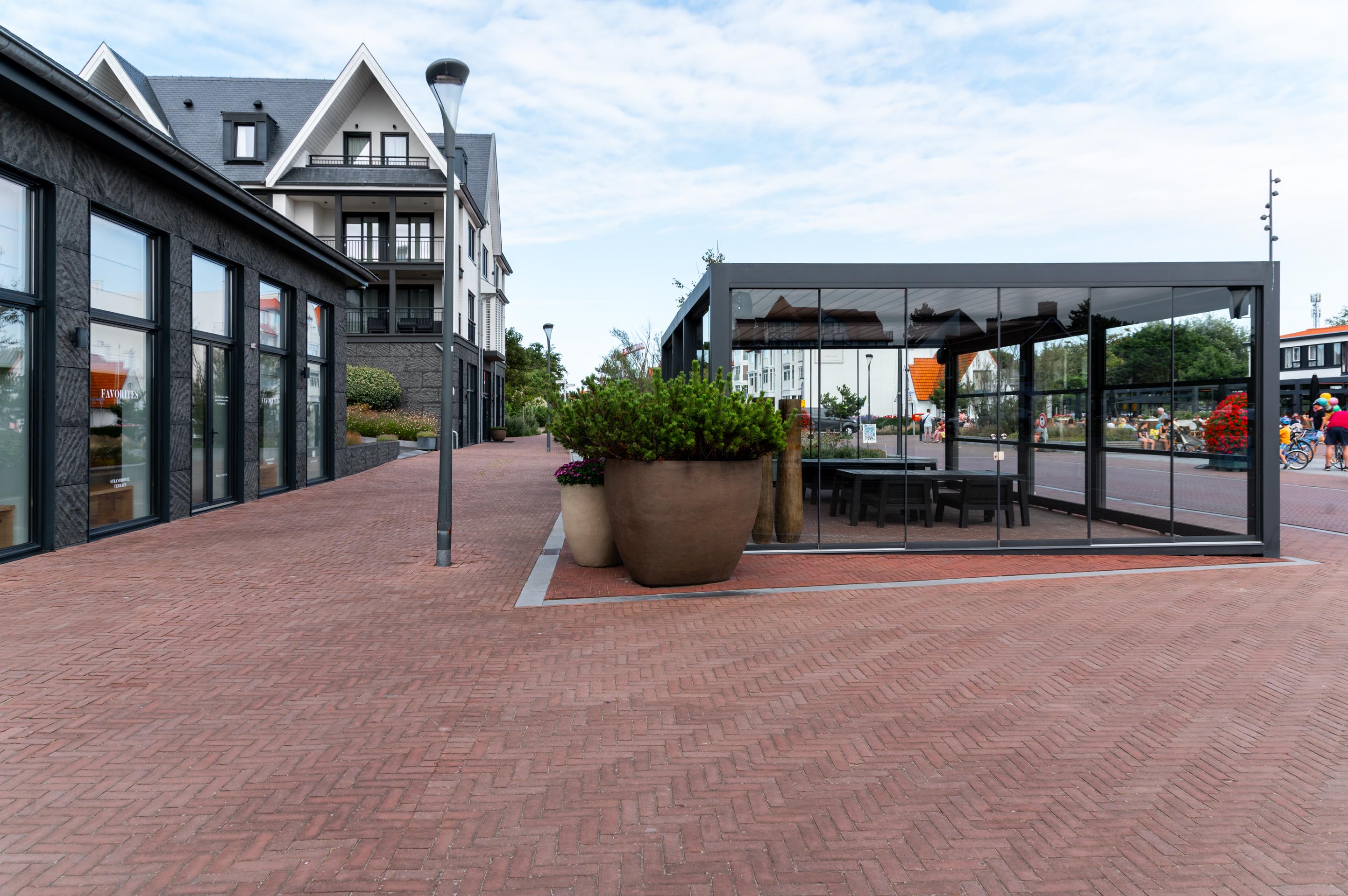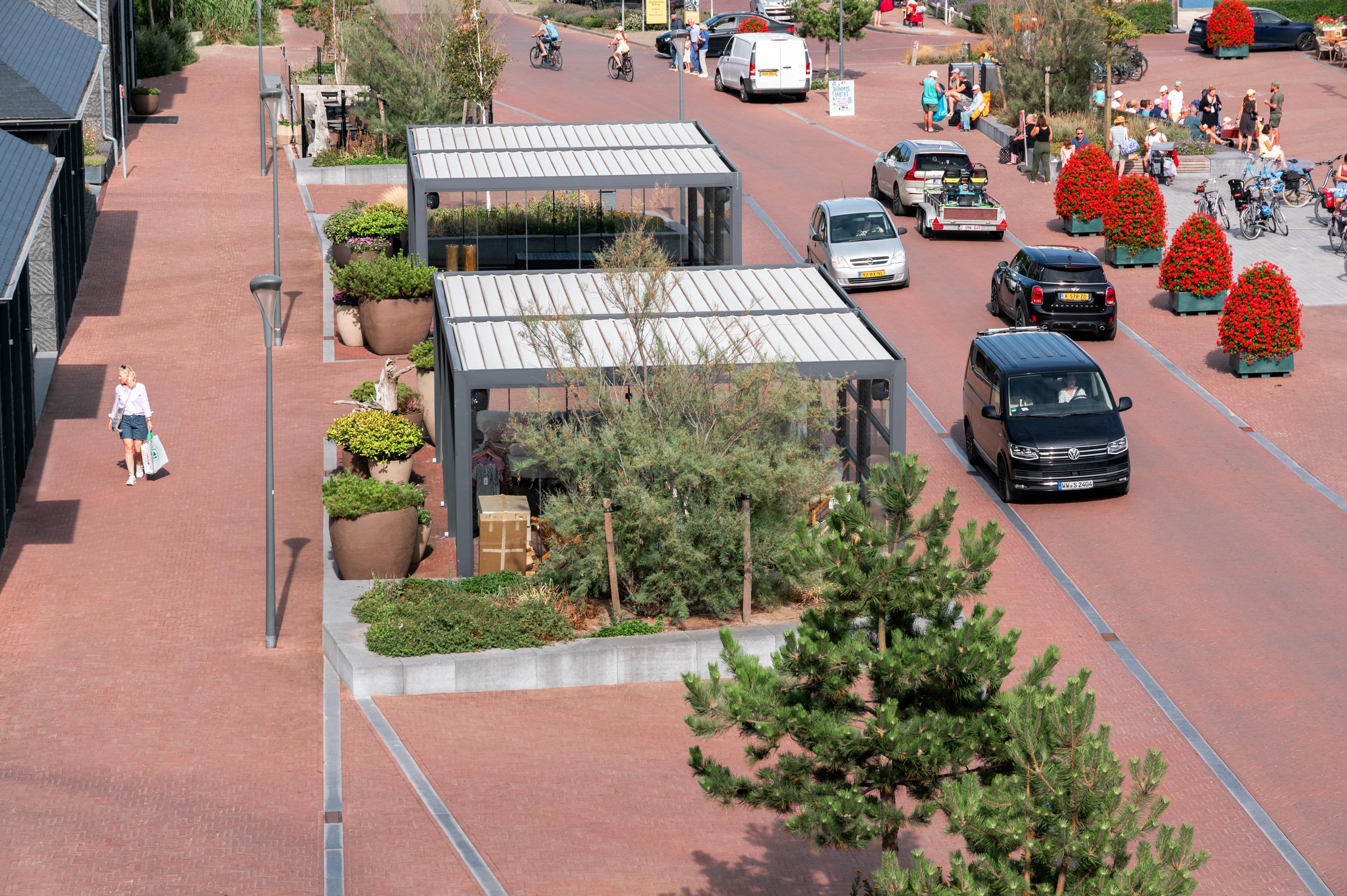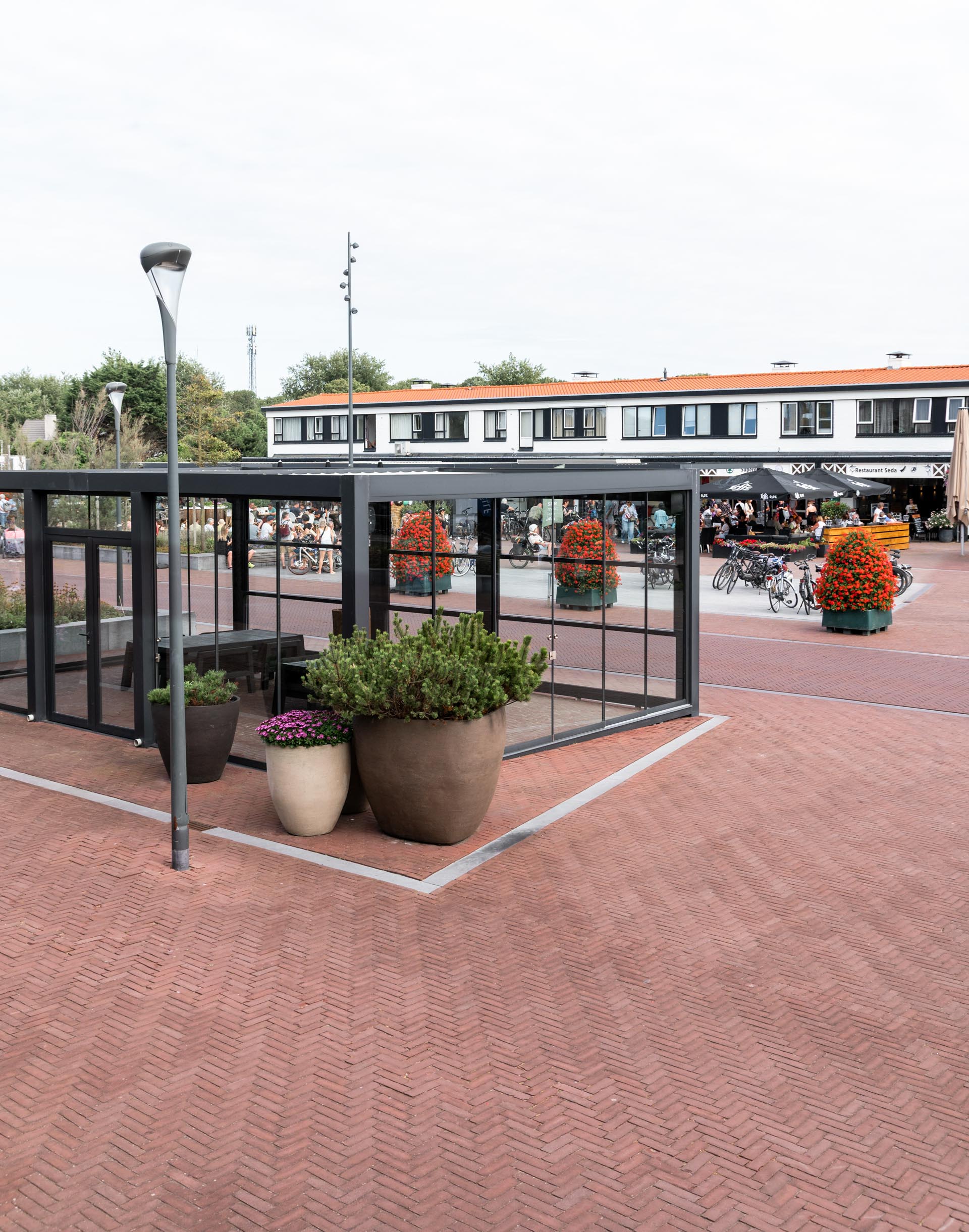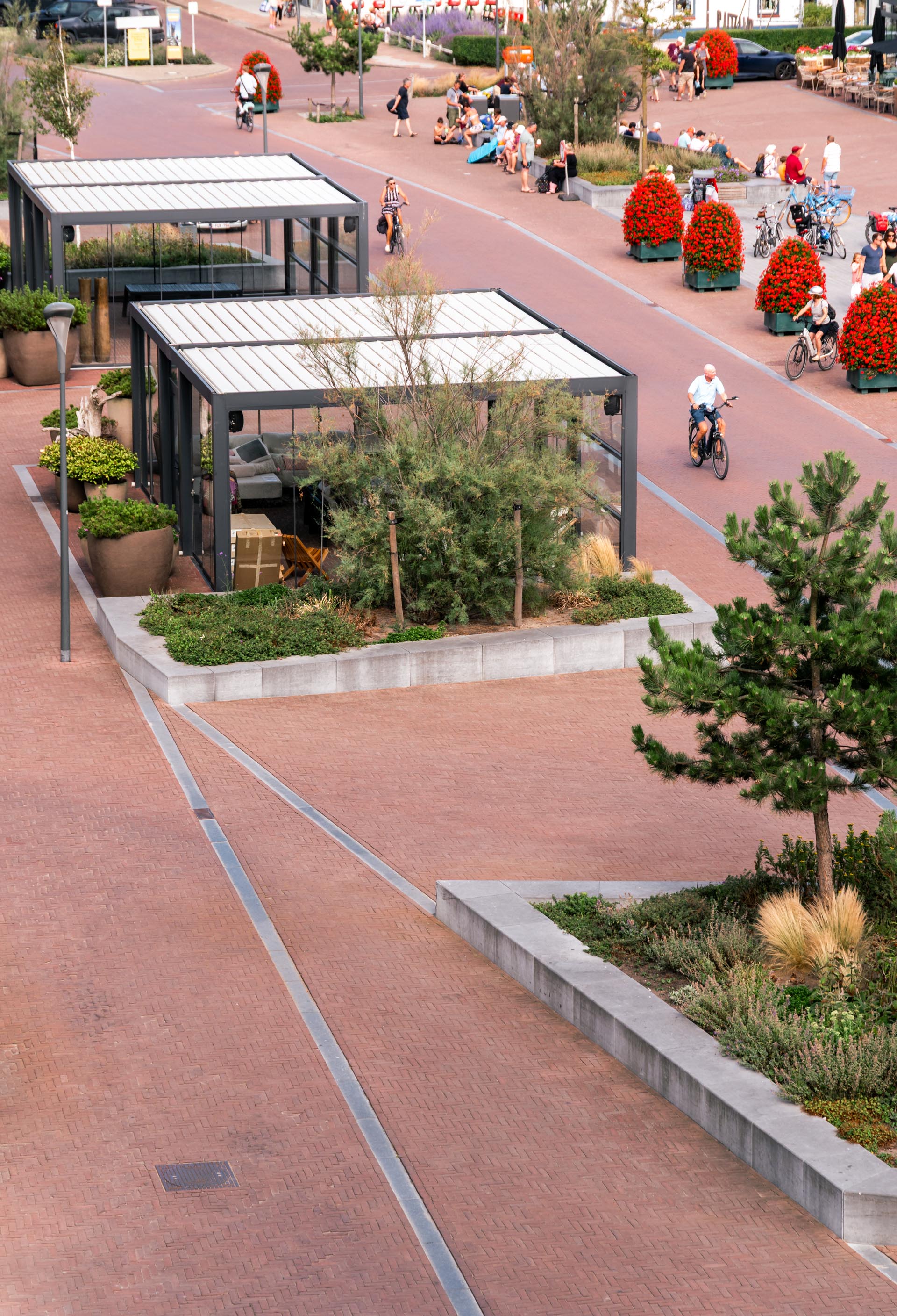 Dezelfde vormentaal wordt doorgetrokken naar de duinen waar doorgangen in cortenstaal meer besloten plekken creëren, die door de groeiende beplanting steeds intiemer worden. Natuurlijke duinvegetatie en beplantingsvakken met zilte gewassen verzachten de verharding en versterken de landschappelijke context. Groen en straatbaksteen gaan hier een evenwichtige dialoog aan, waarin duurzaamheid, beleving en esthetiek samenkomen.