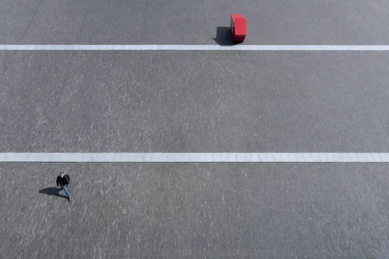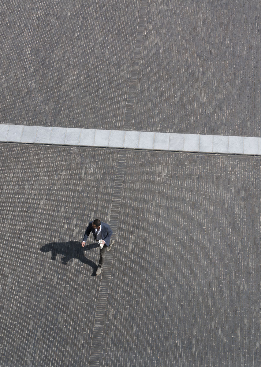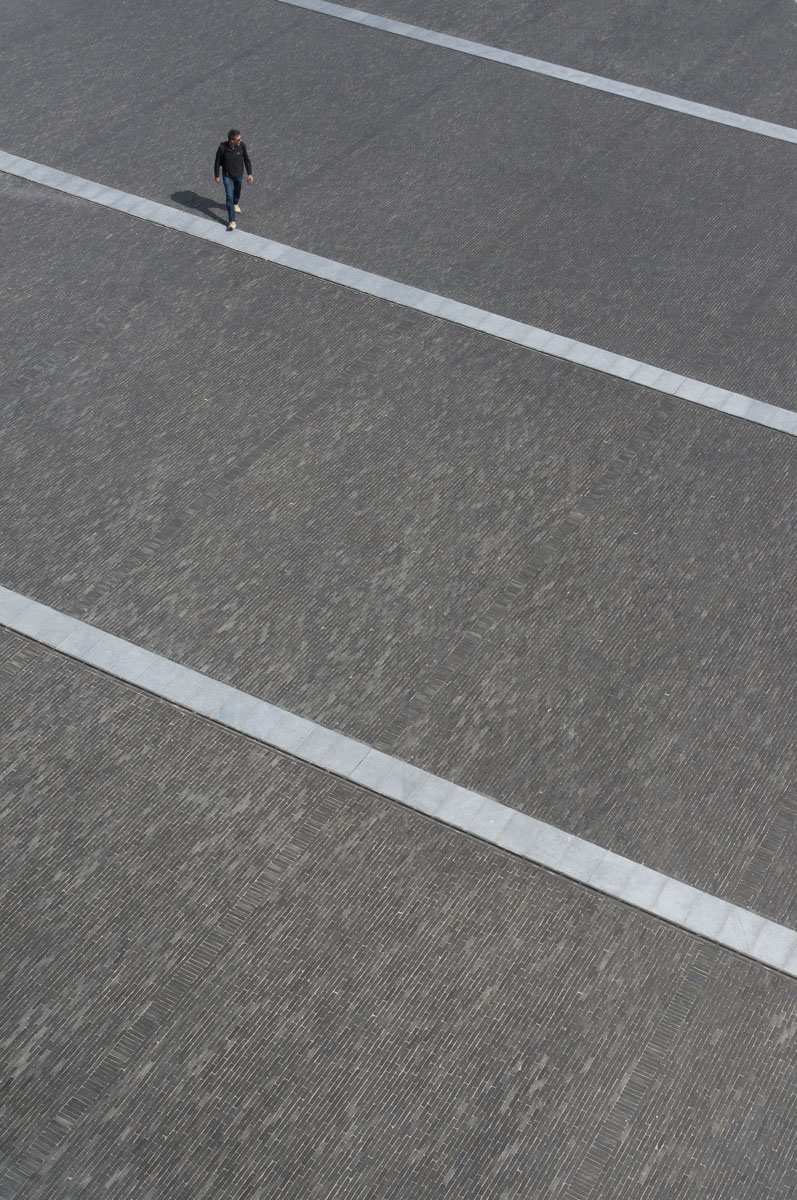 De stroken van blauwsteen die de oppervlakte doorkruisen, benadrukken het weidse gevoel dat opgewekt wordt wanneer je over het plein flaneert.