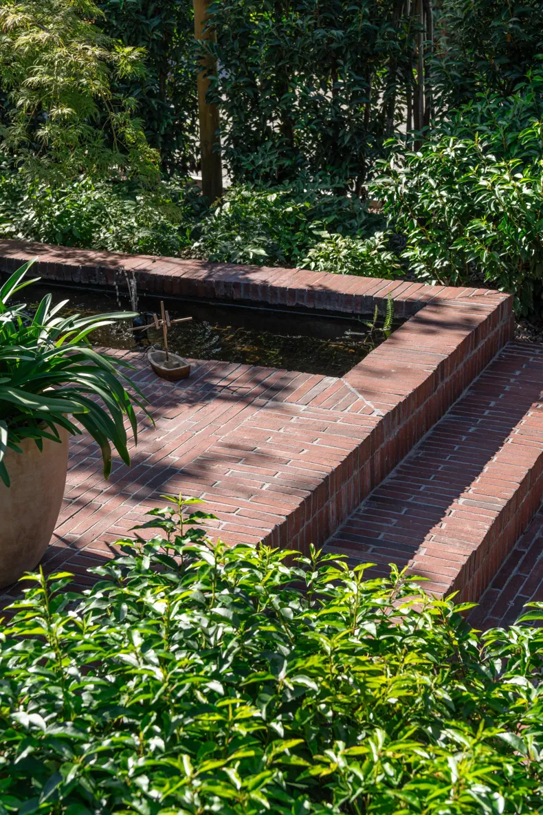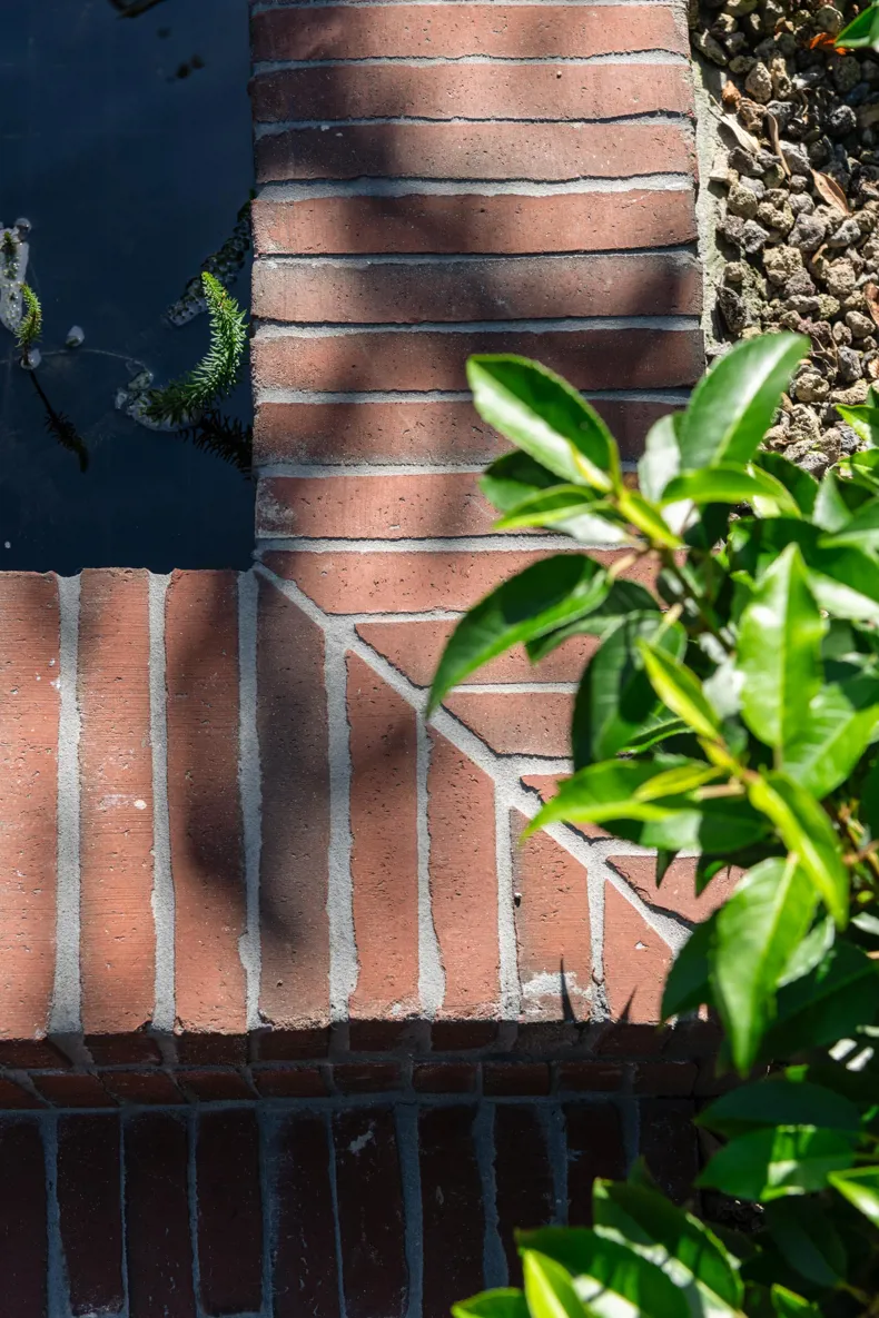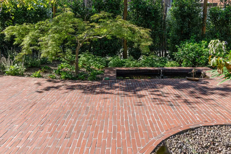 Voor de oprit van de privéwoning werd gebruikgemaakt van de Ancienne Belgique ‘Bordeaux’, een sterke en uitzonderlijk mooie afgewerkte klinker die het manoeuvreren van de wagens gemakkelijk weerstaat. Tussen de oprit en de nieuwe private tuin, die volledig plaatsvond op de oorspronkelijke parking, werd een groene afscheiding geplaatst. Deze afscheiding werd benut om over te schakelen van klinker: van de Bordeaux naar de Elegantia Karmijn. De Elegantia is een verfijnde klinker, wat in dit ontwerp enorm toepasselijk was. De vloeiende lijnen, gecombineerd met de strakke trappen en vijver, werden perfect aangevuld met deze klinker. Het uitwerken van de trappen met deze iets langere klinker was geen eenvoudige opdracht, maar het eindresultaat mag er absoluut zijn.